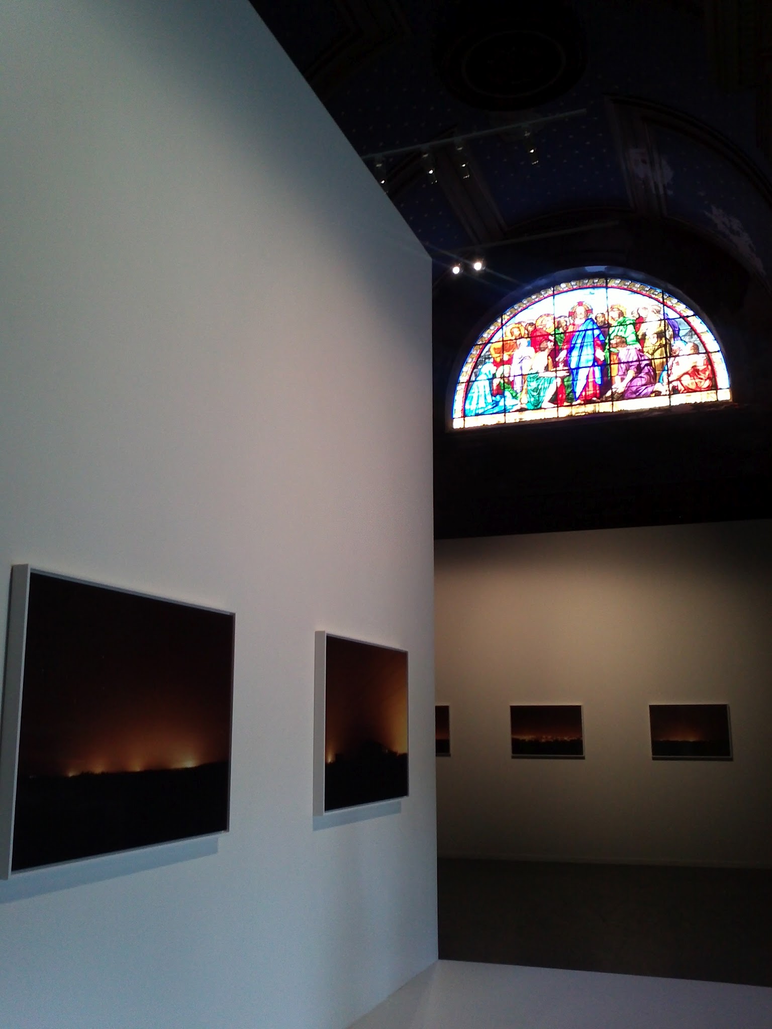 L’exposition Burning fields est magnifique. Le photographe s’est attaché à montrer un monde nocturne éclairé. Je me suis demandé s’il s’agissait de photos prises au soleil couchant mais non. Cet éclairage fantastique n’est le résultat que de l’éclairage humain. C’est beau, hypnotique, mais cela nous rappelle les nuisances occasionnées par cet éclairage. Dans ce monde crépusculaire, les étoiles sont à chercher à la loupe, réduites à de microscopiques pointillés pâlichons ne pouvant lutter avec les lampadaires et autres projecteurs nécessaires à l’homme qui a peur du noir.