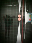 Quelques photos supplémentaires à voir. Les plus observateurs d’entre vous noteront que je suis cachée dans pas mal d’œuvres exposées. Ce qui me donne l’occasion de poser une question à laquelle je ne trouve pas de réponse satisfaisante : pourquoi ne pas utiliser de verre anti-reflet pour exposer des œuvres d’art ? Ça éviterait de se retrouver dans le cadre (au sens artistique et photographique du terme), d’avoir d’autres visiteurs, les néons, les fenêtres et autres éléments venant perturber la construction de l’œuvre. On m’a déjà répondu que le verre anti-reflet altérait le rendu des couleurs mais je me demande finalement si je ne préférerais pas ça.