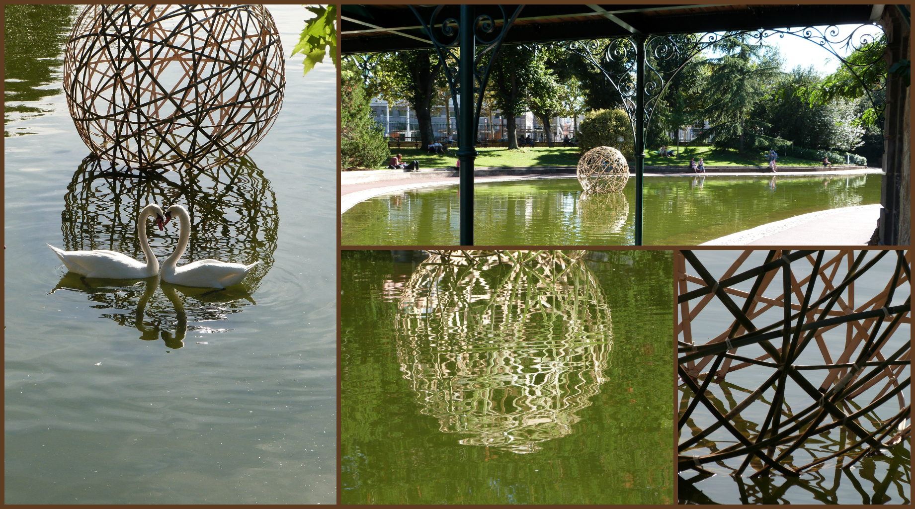 1. @Val : ben oui, les photos prises hier je les ai montées avec des photos de cet automne (mon montage est mal fait ? ;)). La boule est sous le resto à côté des piliers rouges. Mais vu que je n’ai probablement pas mis les pieds au jardin Lecoq depuis ce fameux jour où j’ai pris l’oeuvre et les cygnes, je n’ai aucune idée de ce qui est advenu de la boule entre-temps.