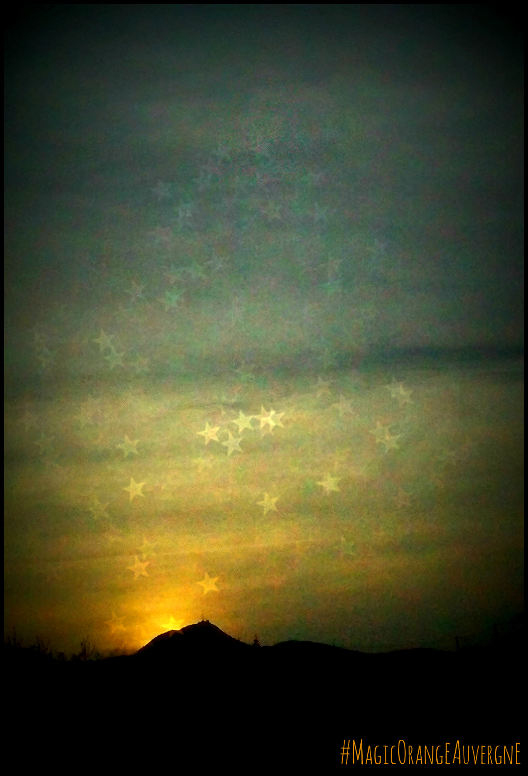 Bon et j’en viens à ma commande arrivée ce jour. J’ai mis la même photo sur un sac et sur un t-shirt. Je suis plus contente du sac que du t-shirt car paradoxalement, la photo est plus grande mais semble de meilleure qualité. Le sac a cependant un petit défaut au niveau de la bordure gauche de la photo mais bon, ça passe. Donc cette photo, c’est une photo que j’ai prise avec mon téléphone lorsque j’étais à Beaumont. Un petit coucher de soleil qui m’avait bien plu car il faisait un halo juste autour de notre puy de Dôme chéri. J’ai recadré la photo, bidouillé les couleurs, ajouté un effet bokeh « étoiles » (*mode cucul on*) qui semble partir de la lueur orange en bas vers le ciel, ajouté un effet vignettage, et ajouté un hashtag perso #MagicOrangeAuvergne parce que je suis patriote ;) J’avais un peu peur du résultat en raison de la qualité de la photo, pas terrible au départ, puis retouchée grossièrement sur PicMonkey (impossible de me servir des ersatz de Photoshop du genre Pixlr ou Picozu, j’y comprends rien). Je ne savais pas non plus ce que la fameuse impression « digital direct » allait donner. C’est la première fois que je vois un print comme ça, ça fait un peu gel translucide, c’est souple. Aucune idée de la résistance au lavage. Bref, la photo n’est pas aussi nette que je l’aurais espéré. Mon effet bokeh se voit assez peu au final, j’aurais pu forcer un peu le trait. Bon mais globalement j’aime bien ma photo cucul, j’ai déjà étrenné le sac pour aller faire mes courses à Carrouf mais comme j’ai peur de l’abîmer, je vais plutôt m’en servir pour trimbaler mes gamelles au bureau (et me la péter un peu).