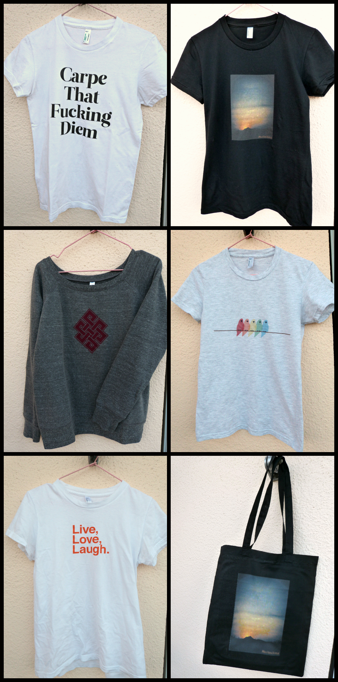 Bon alors, j’avais déjà évoqué la découverte du site commun entre les 3 Suisses et Spreadshirt, qui permet de customiser tout un tas de vêtements ou d’objets. J’ai d’ailleurs constaté en allant sur mon compte qu’il répertoriait de vieilles commandes La Fraise (qui n’a rien à voir avec les Suisses). Les ravages des logins/mots de passe identiques partout. C’est mal je sais. Bref. J’avais déjà commandé trois articles il y a quelques semaines. Le « Live, love, laugh. » que j’aime beaucoup parce qu’il est orange fluo (atténué sur la photo). Le sweat-shirt (hyper confortable, je suis tentée d’en commander un autre, hihi) avec le nœud infini bouddhiste, que j’aime beaucoup aussi parce que c’est mon symbole préféré. D’ailleurs, soit dit en passant, si je devais me faire tatouer un truc un jour, ce serait ça. Mais je ne le ferai jamais. D’une parce que je n’ai jamais pu arrêter un endroit de mon corps où le mettre (là ça se voit trop, là je le vois pas, là ça va pendouiller un jour…). De deux parce que je ne préfère pas imaginer si ma peau débile à la con devait faire une réaction à l’encre. Bref. J’ai aussi commandé un débardeur noir avec un splash de peinture bleu vif, pas mis sur la photo, et pas encore porté bien sûr, vu le merveilleux printemps que nous avons. Autre commande parallèle à celle-ci, chez Society6 où j’avais acheté « Life ». Bon alors celui-là, il est mort. Enfin le Life se voit toujours très bien vu qu’il est très gros, mais les conditions générales de vente, ironie du sort, devraient être totalement illisibles au prochain lavage. J’ai voulu voir s’il était possible de commander une version noir sur blanc mais non, c’est que blanc sur noir/bleu/rose/orange…donc la même technique d’impression foireuse. Parce que mon « Carpe that fucking diem » (que je kiffe plus que tout mais que pas mal de personnes n’ont pas percuté (« désolée, je parle pas anglais » o_Ô) commandé aussi sur Society6, le print est nickel et ne bouge pas. Il va même se patiner de manière sympathique au fil des lavages. Pareil pour les petits oiseaux arc-en-ciel (avec un magic orange bird caché dedans) qui devraient bien se tenir sur leur support gris chiné.
