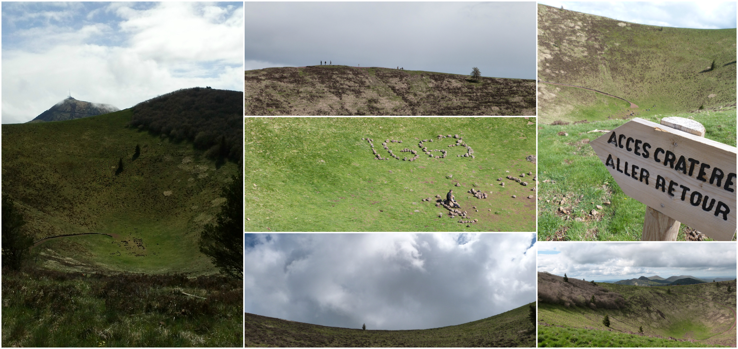 Une fois au fond du cratère, on a entrepris d’écrire IG 63 afin de faire une photo d’en haut. Ça aurait pu être « instapariou » ou « igersclermontferrand » mais la manutention des pierres volcaniques nous a fait choisir la solution la plus courte. Un vrai travail de Romain. Photo prise, remontée du fond du cratère puis pause charcuterie (?) que j’ai déclinée car me poser signifiait me refroidir. Il a fallu ensuite convaincre les pièces rapportées de faire le tour complet du cratère. Heureusement qu’on a eu le dernier mot car une fois devant le puy de Dôme, les nuages et le soleil nous ont gratifiés d’un jeu de cache-cache de toute beauté. Ça plus les couleurs hyper contrastées de la nature environnante, un pied dans l’hiver et l’autre dans le printemps, du marron, du vert profond, du vert tendre… On en a pris plein les yeux.