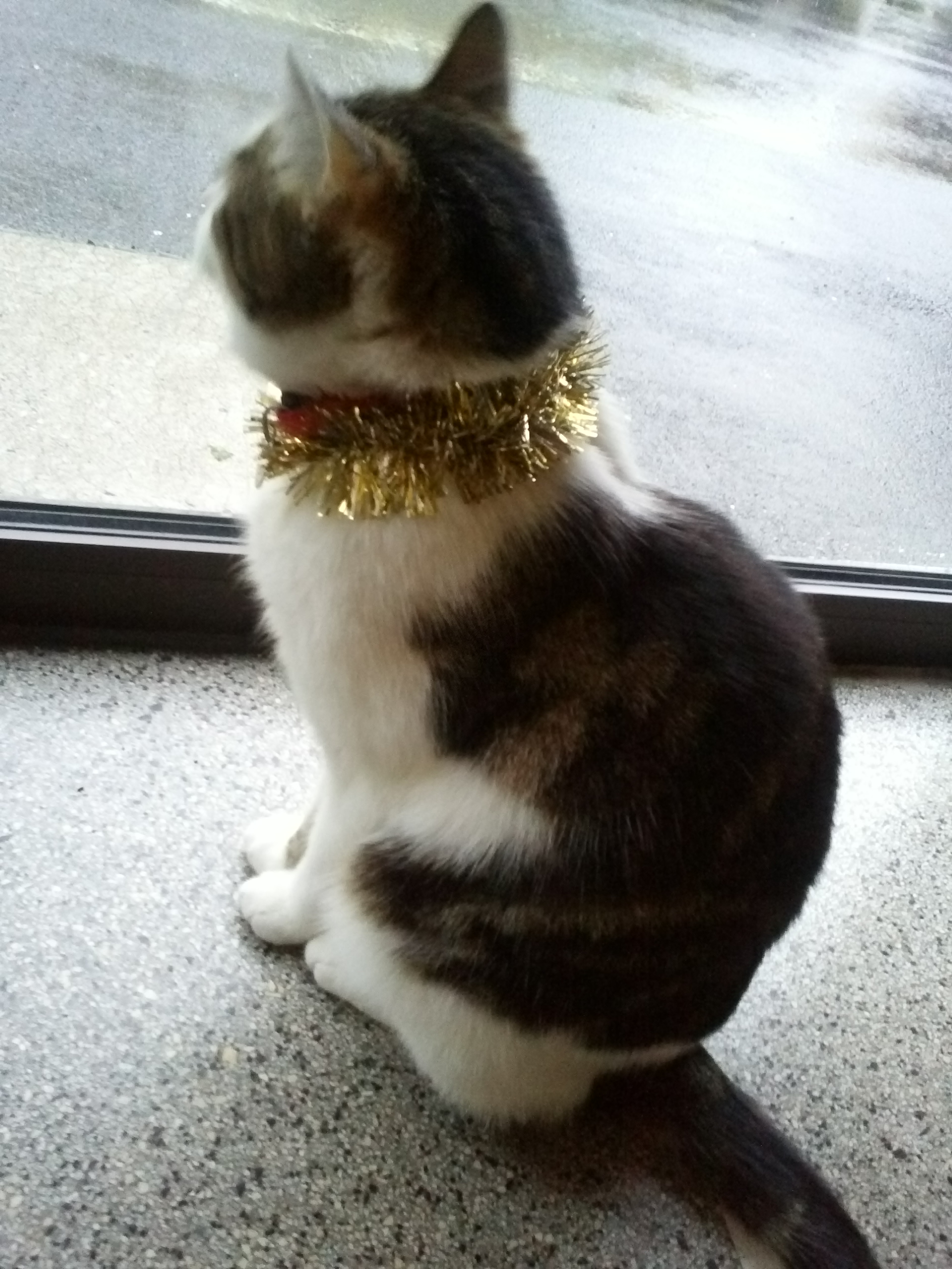 Donc bruit de grelot, chat dans les escaliers, tout ça, et là, stupeur. Le chat était déguisé en sapin de Noël et semblait trouver ce nouvel accoutrement tout à fait seyant. Pas de mouvements exaspérés pour se débarrasser de l’accessoire, rien. Juste envie de sortir. Pour un rendez-vous galant ? La cérémonie d’ouverture du festival de Cannes ? Pour fuir les mœurs discutables de son maître et déposer une patte courante au commissariat le plus proche ? Pour la petite histoire, je ne lui ai pas ouvert vu les seaux d’eau qu’il tombe depuis ce matin sur la capitale auvergnate. Inutile d’abîmer la guirlande, de surcroît.