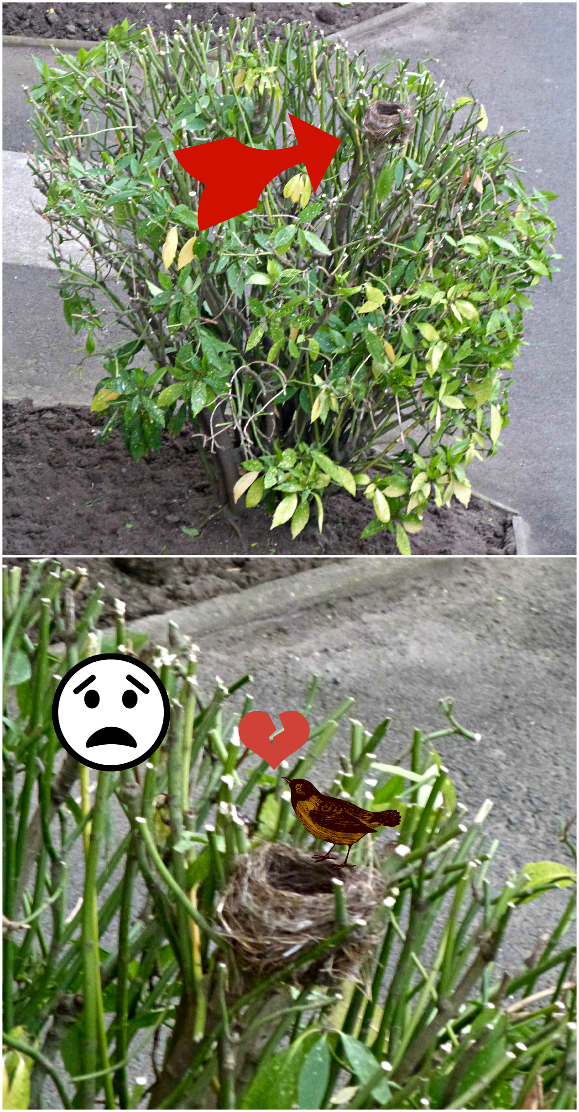Bref. Et toujours pour rester dans la thématique animale, j’ai été consternée de voir lundi soir, après le passage de la société Attila (les noms ont été changés afin de respecter l’anonymat des coupables), qu’un nid était totalement à découvert en haut d’un arbuste. Les piaillements des moineaux m’avaient mis la puce à l’oreille, je les sentais très énervés à une heure où en général ça commence à piquer du bec dans les bosquets. Comme je les comprends, moi aussi je serais vénère à leur place, un si beau nid. Impossible de savoir s’il y avait déjà des œufs. Et je te parle pas des arbustes taillés à la machette émoussée, dépouillés de leurs feuilles et de leur intérêt esthétique. Bref, la team Attila et les moineaux SDF ont suscité quelques grognements à l’assemblée générale de ce soir, c’est te dire les problèmes existentiels de la résidence (je m’en contente, ceci dit).