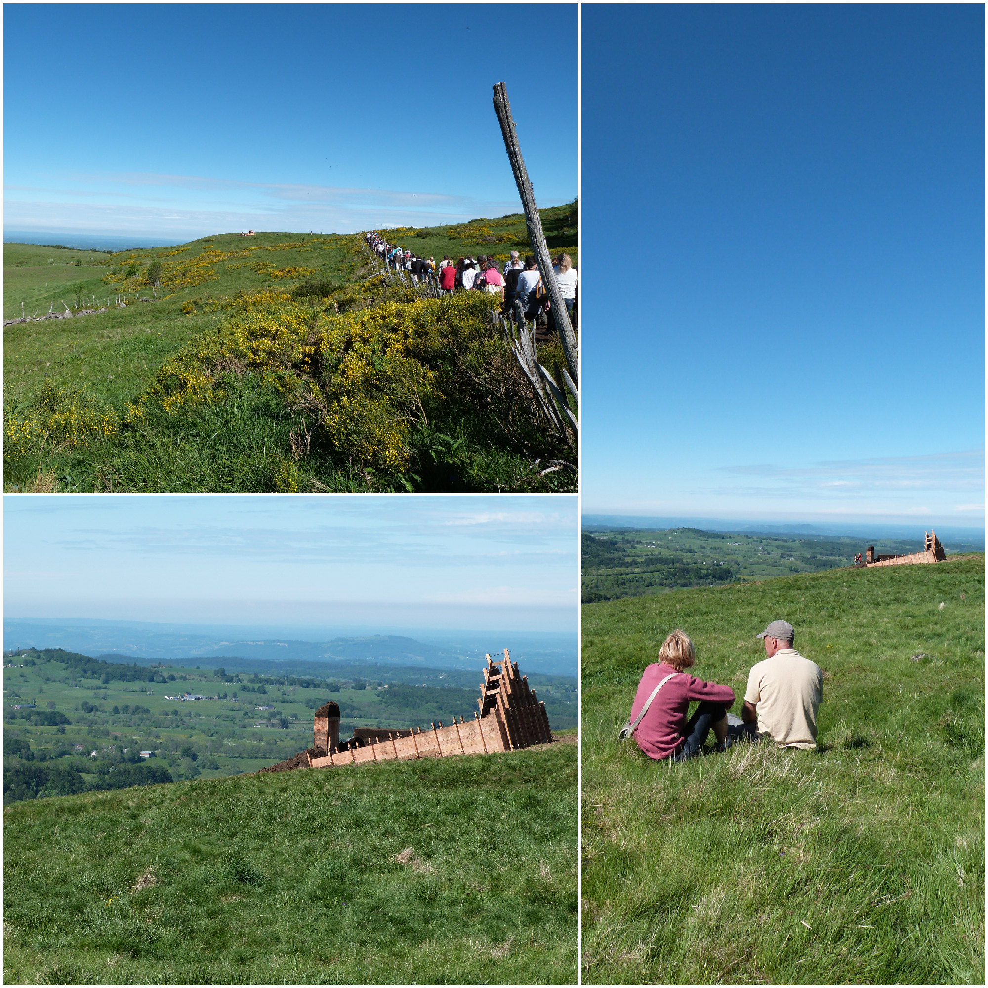 Je voulais tout d’abord commencer par tirer un grand coup de chapeau à l’équipe organisatrice : l’office de tourisme du Sancy et en particulier la team Horizons. Allez, j’avoue, je n’y croyais pas. En arrivant à Super-Besse à 8h et en voyant les quatre bus affrétés, je me suis dit qu’on n’y arriverait jamais. JAMAIS ! Dix œuvres éparpillées aux quatre coins du territoire, les routes tortueuses du Sancy, quatre bus, 250 péquins qui veulent voir/prendre des photos/faire pipi… Mission impossible. Et bien contre toute attente, le timing a été tenu à la minute près. Évaluation des temps de trajet, de marche, de discours, de photos, de pause, de repas… rien n’a été laissé au hasard et tout a été maîtrisé de bout en bout et, s’il vous plaît, avec le sourire permanent et la bonne humeur en prime. Même sous la tempête de grêle. Donc vraiment, grand bravo à tout le personnel de l’OT pour leur mobilisation et leur professionnalisme. Je précise quand même que les 250 personnes étaient constituées en majorité de journalistes, de personnel des offices de tourisme et d’hébergeurs du coin, cette journée étant une sorte de « formation » pour ceux qui vont accueillir les touristes tout au long de l’été. Pour ma part, j’étais là à titre personnel même si je vais bien évidemment prêcher la bonne parole auprès de mes collègues. Et de vous, bien entendu.