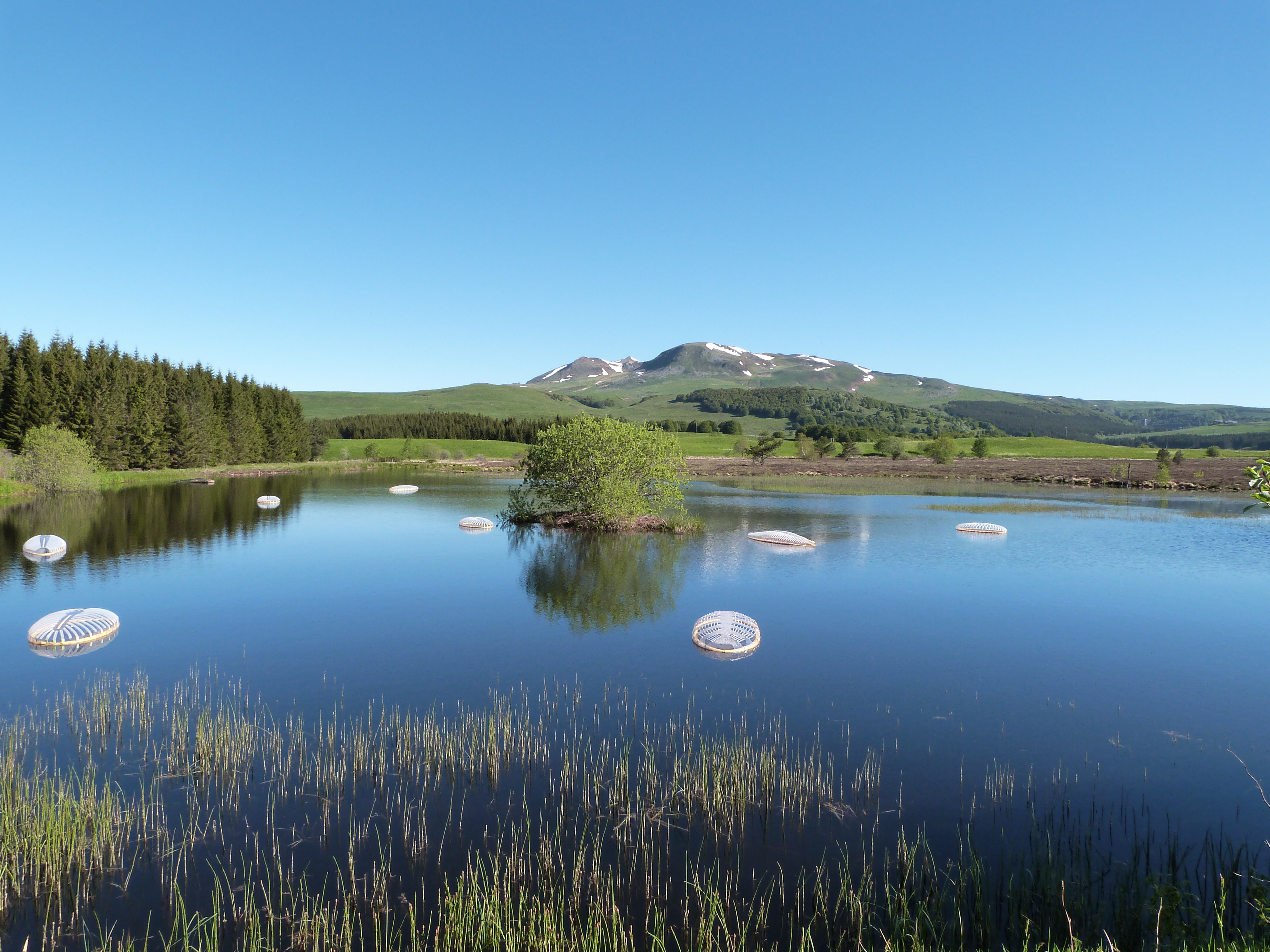Direction Picherande et la tourbière de la Barthe pour découvrir les mystérieuses « Diatomées mégascopiques » de Prisca Cosnier. Cette tourbière est visible de la route. Je l’avais déjà vue. Mais ce n’était qu’une tourbière. Quelques cocons translucides plus tard, c’est une hallucination féerique. Difficile de décrire la sensation ressentie devant cette œuvre délicate et hypnotique. Il faut dire que les conditions météo étaient particulièrement favorables pour venir admirer cette œuvre. Soleil miroitant, eau huileuse, reflet paisible de cet arbre solitaire dressé au milieu de l’eau, monts du Sancy à l’horizon, dont les plaques de neige venaient rappeler la blancheur des diatomées. Ces installations de polycarbonate représentent des cellules microscopiques évoluant dans l’eau. Le petit plus qui va me faire revenir au plus vite : la présence d’éléments photoluminescents qui font que cette œuvre s’admire également à la nuit tombée. Je VEUX voir ça.