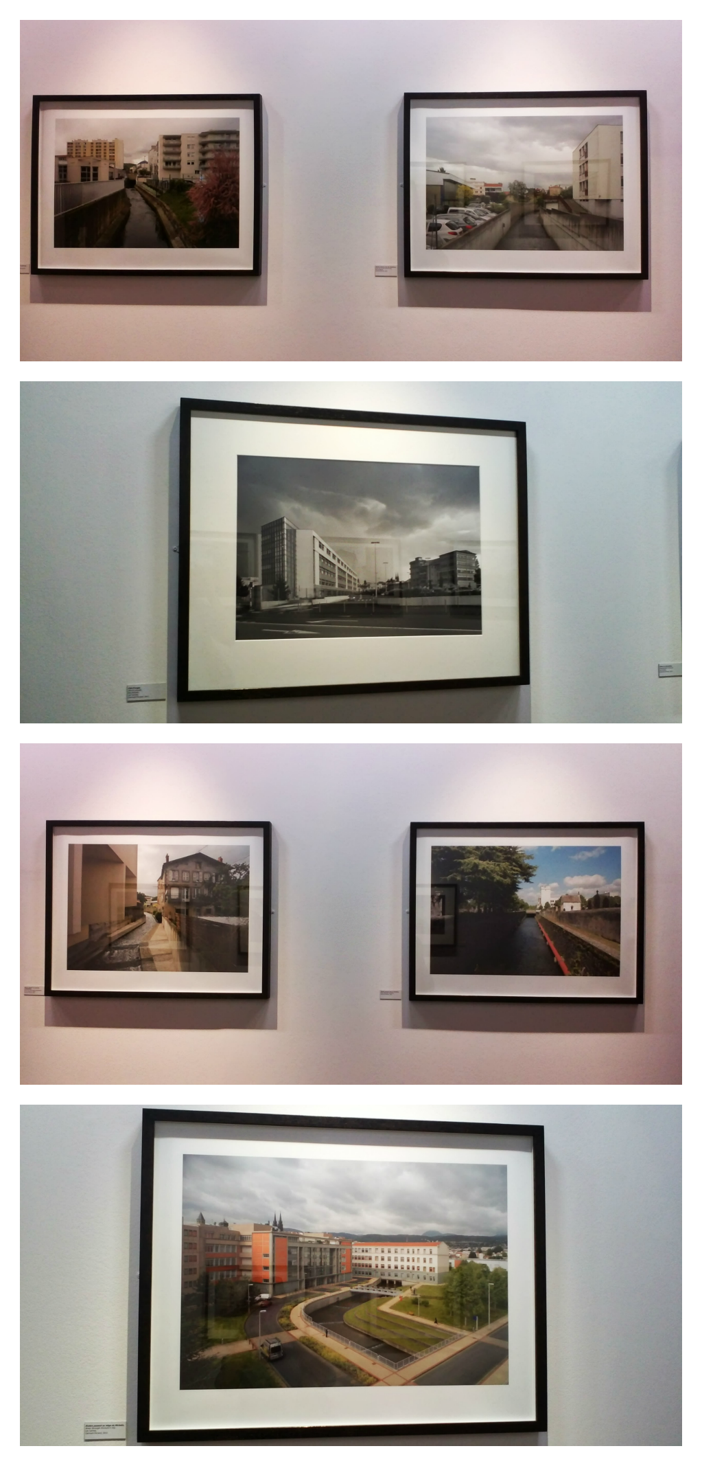 J’avoue, j’étais assez dubitative en allant à cette exposition. La Tiretaine, je connais bien, j’habite à côté et ce que j’en retiens surtout, c’est l’odeur épouvantable qui s’en dégage en cas de fortes pluies ou de grosses chaleurs. En plus, je suis officiellement en zone inondable (je ne risque a priori pas grand-chose). Dans mon quartier, un petit parc très sympathique a été aménagé aux abords de la Tiretaine, témoignant de la volonté de réhabiliter ce cours d’eau que peu de gens connaissent ici. Mais globalement, les abords de la Tiretaine sont peu engageants, coulés au milieu des immeubles, de Michelin et du cimetière des Carmes. Qu’est-ce que John Davis a-t-il bien pu prendre en photo ? C’était sans compter le talent du photographe pour donner à la ville et ses constructions utilitaires une dimension fantastique, entre lignes de fuite et nuages menaçants. Perspectives incroyables, points de vue inédits, austérité imposante des bâtiments, j’ai découvert Clermont-Ferrand sous un jour totalement nouveau. Tomber en admiration béate devant les sites de Michelin, devant les fameuses pistes d’essai, je ne l’aurais jamais cru. J’ai également découvert des endroits que je ne connaissais pas, où la Tiretaine se dévoile aux regards et surtout, j’ai vu la Tiretaine s’engouffrer sous les bâtiments du siège de Michelin. Je passe à côté tous les jours sans avoir jamais deviné ce spectacle.