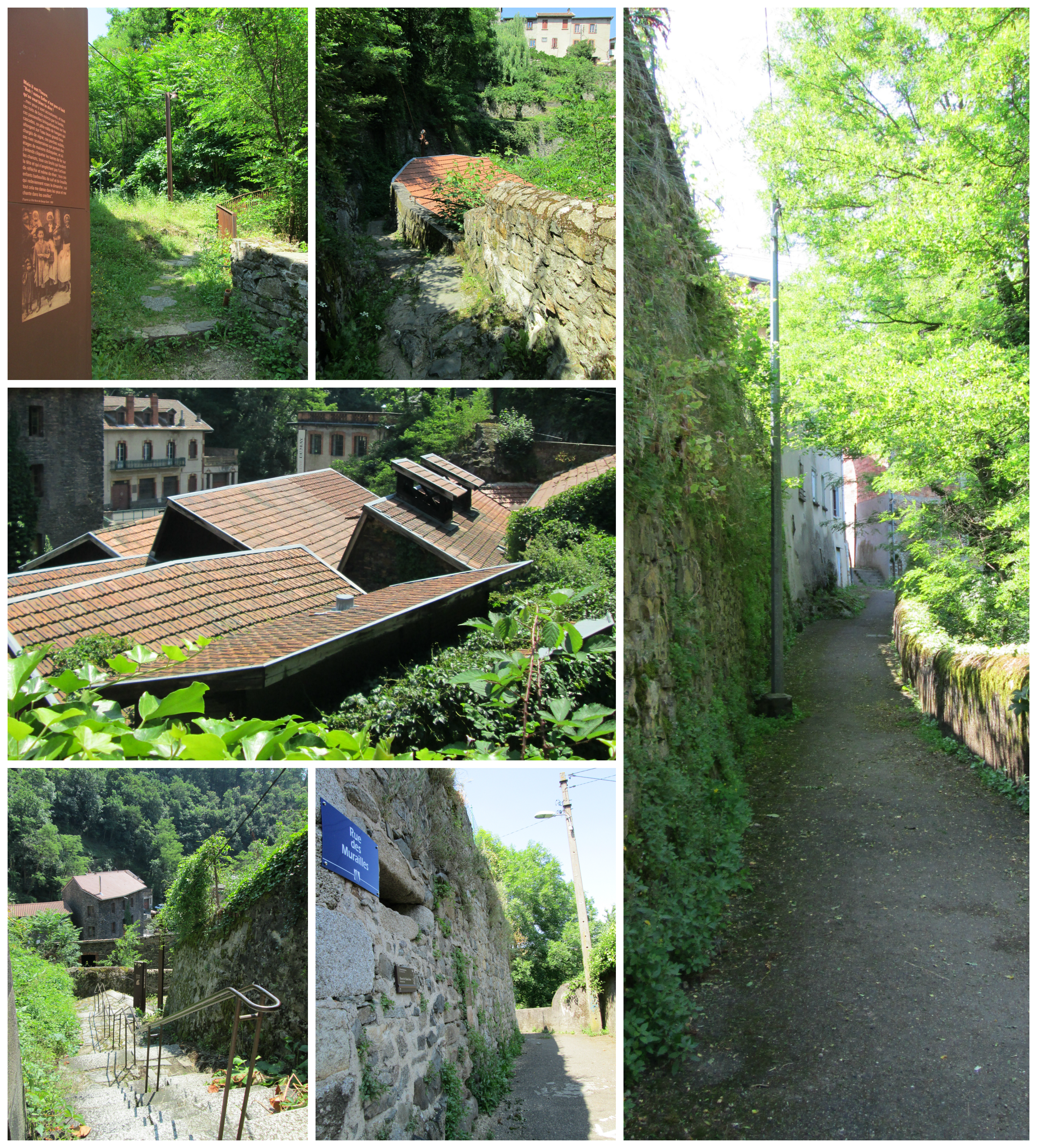 Je tiens à souligner l’accueil très sympathique du monsieur de corvée service en ce dimanche ensoleillé. Ayant bien répondu au jeu de l’expo (reconnaître des détails des œuvres, pas évident du tout!), j’ai eu droit à une carte postale et un bouquin d’une expo précédente. Et surtout. SURTOUT. Quand j’ai demandé quel était le chemin le plus court pour rejoindre le festival, il m’a dit « prenez la passerelle juste à gauche, là, ça grimpe mais ça vaut le détour ! ». OK. Au départ j’ai cru avoir mal compris, l’escalier en question semblant mener à une porte du bâtiment. Mais en fait non. À droite, un chemin herbeux se découvre tout à coup tel un passage secret végétal. Chemin chaotique longeant de vieux murs de pierre, surplombant les toits des vieilles usines en contre-bas, escaliers escarpés aux rampes oxydées…oui ça valait le détour ! Et si je n’avais pas été prise par le temps et le concert imminent à l’église Saint-Genès, j’aurais volontiers continué l’exploration le long de ces murs, où le chemin semblait continuer vers… mystère !