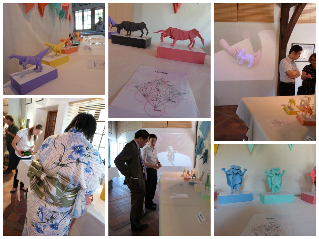 Timing impeccable, une fois la visite terminée c’était l’heure de l’inauguration. J’ai rejoint Maïko et Tetsuya dans la salle d’exposition où étaient alignés des dizaines d’animaux colorés, tous pliés par les soins de Tetsuya. Pliés et créés aussi. Car le papier a été spécialement conçu pour lui par le moulin Richard de Bas, l’origami étant un art délicat et fragile nécessitant un papier aux qualités spéciales. C’est en tenant compte des particularités de ce papier artisanal que Tetsuya a créé les diagrammes de certains animaux. Girafes, éléphants, dragons, kappa, taureaux… tout un bestiaire aligné comme à la parade. Et au-dessus de chaque création, les feuilles dépliées pour montrer les différentes étapes de pliage. Impressionnant et particulièrement bluffant quand on voit cette feuille carrée devenir un animal qui tient debout sans avoir coupé ou collé quoi que ce soit.