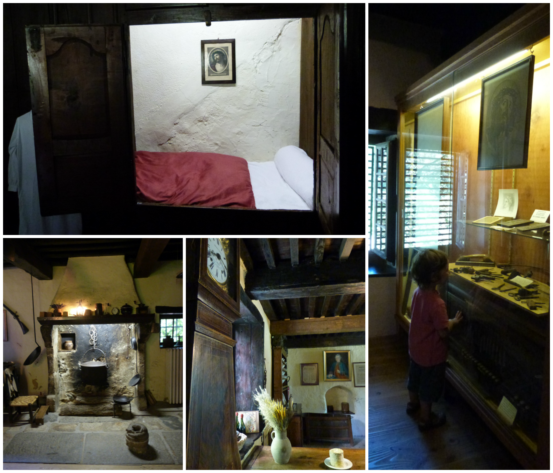 L’inauguration ayant lieu à 11h, j’ai profité du début de matinée pour faire la visite guidée du moulin. C’est au XIVe siècle que l’activité de fabrication de papier a débuté à Ambert, en raison de la pureté de l’eau qui y coule. Depuis, les artisans perpétuent la tradition, avec les outils et techniques d’antan. La visite commence par la partie du moulin qui était habitée par le papetier et sa famille. Objets insolites, comme ce « grugeoir » pour écraser le sel, ou ce lit-placard pour enfermer les ouvriers de passage afin qu’ils ne prennent pas la poudre d’escampette pendant la nuit pour aller révéler les secrets de fabrication… malgré la reconstitution opérée pour en faire un musée, ce moulin semble baigner dans son jus. Grosse bâtisse de pierre le long de laquelle les végétaux s’élancent au son de l’eau battue par le moulin, omniprésence de fleurs champêtres aux couleurs vives, dont on comprendra l’utilisation plus tard… ce lieu respire la tranquillité. On y prend le temps de vivre et de faire les choses avec passion et délicatesse. D’ailleurs, y a pas de réseau ;) !