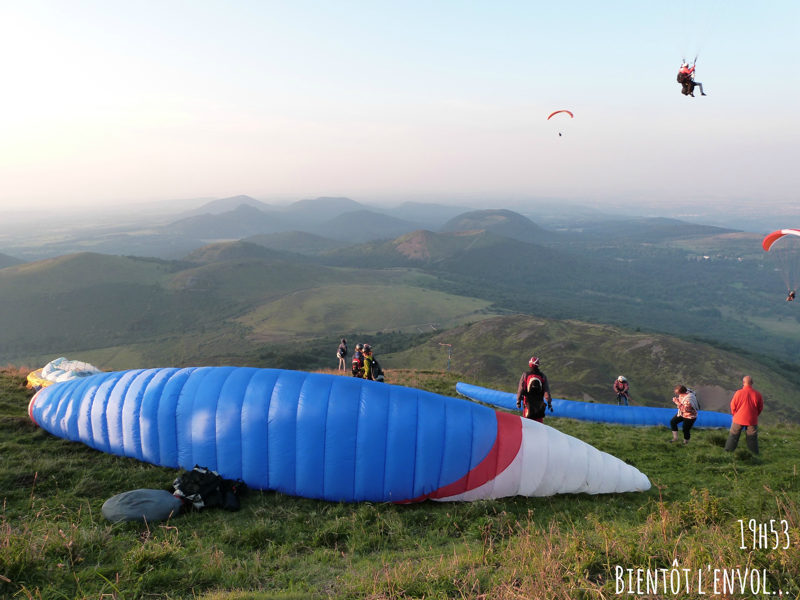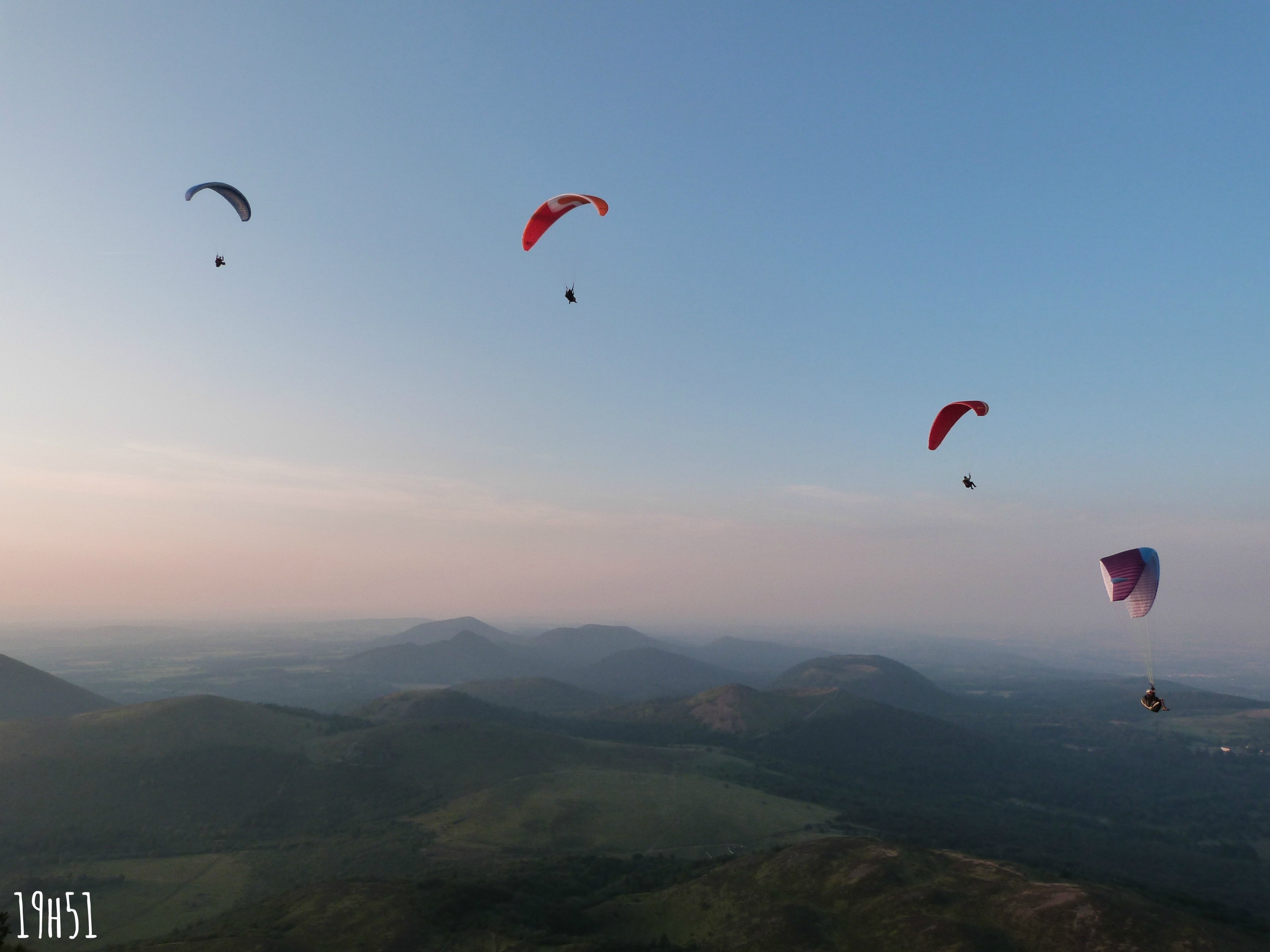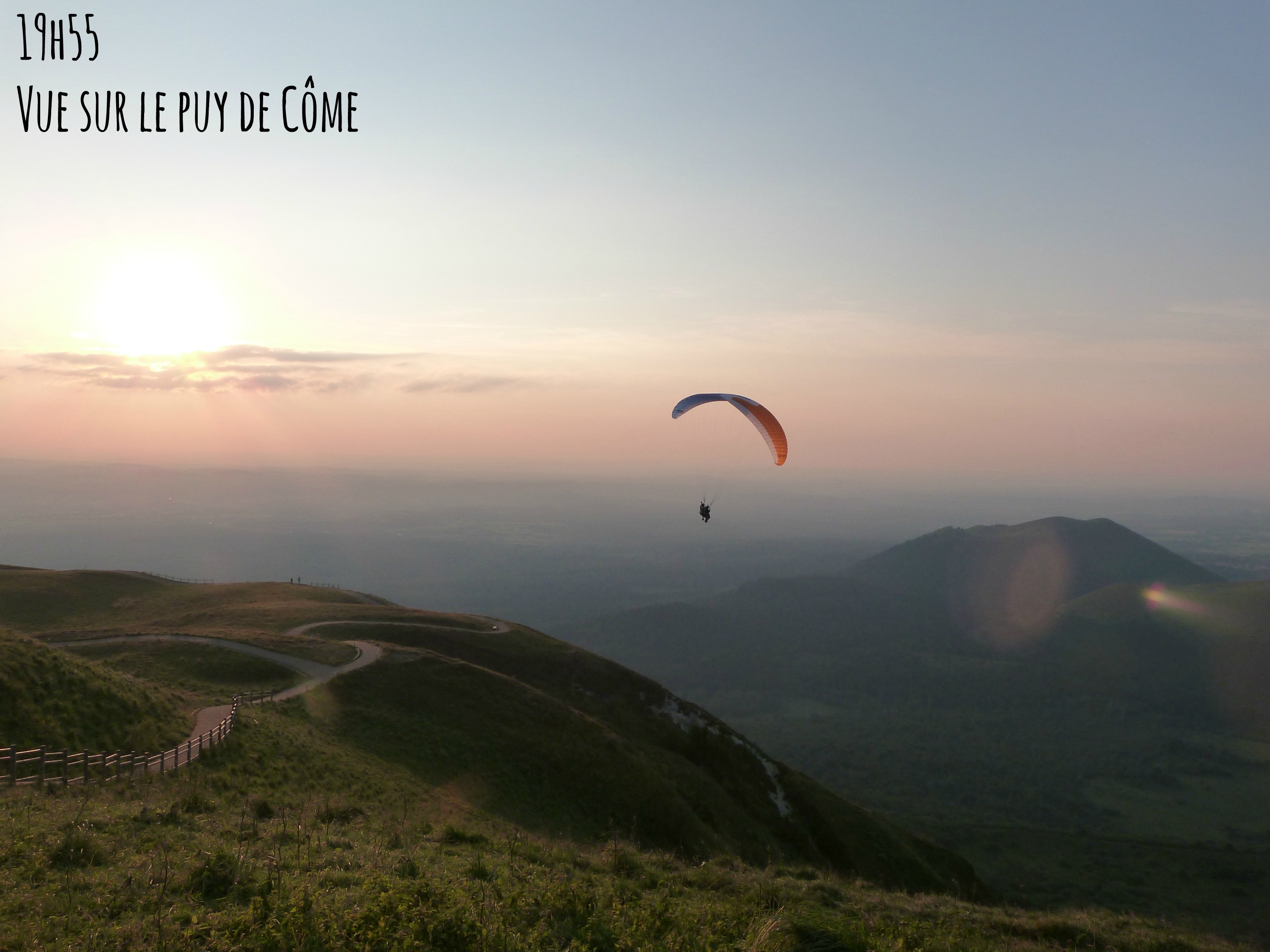 À l’arrivée, découverte des brebis, qui s’étalent tranquillement près des bâtiments et qui regardent le visiteur avec curiosité. Puis montée à l’antenne pour profiter du panorama et des parapentistes qui s’élancent côté Pariou. Ces derniers passent à quelques mètres de nos têtes, portés par les vents ascendants. On les entend parler alors qu’ils virevoltent en silence. Les couleurs des voiles sont hypnotiques dans le soleil couchant. Ils sont des dizaines à voler ou se préparer et franchement… ça donne envie. Je me demande si… un p’tit baptême… un soir comme ça… ça m’a toujours fait envie mais là, il aurait pas fallu beaucoup me pousser pour me lancer. À mon avis le plus gros risque, c’est d’y prendre goût.