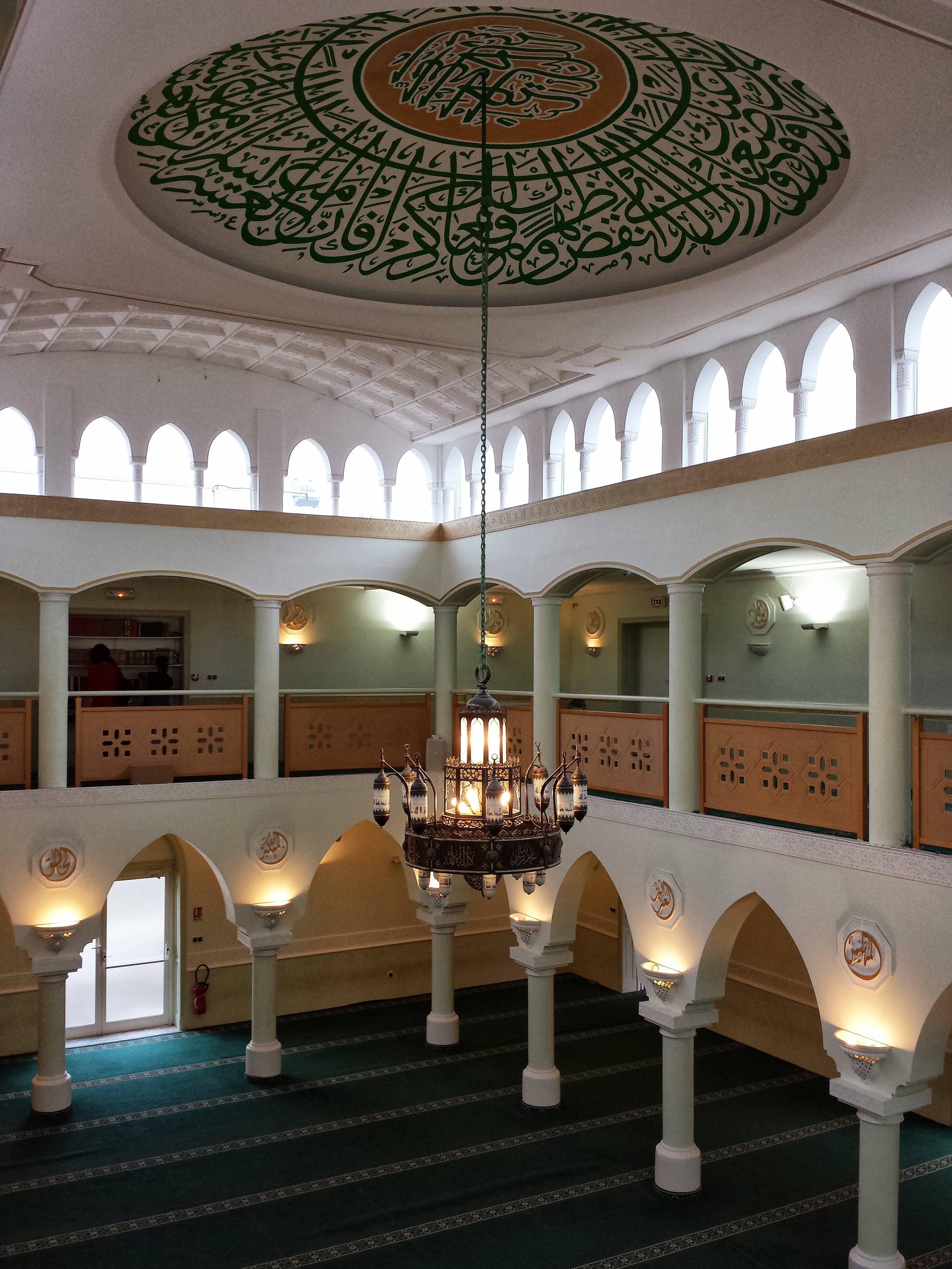 Lorsque je suis arrivée, la visite avait déjà commencé et je ne sais pas qui était la personne qui s’exprimait. Le message de l’islam, la philosophie, le dialogue… un discours très œcuménique à l’attention des visiteurs venus nombreux. Discours interrompu car c’était l’heure de la prière. Un peu étrange de les observer dans ce moment de recueillement… Quelques minutes plus tard, c’est l’architecte des lieux qui a pris la parole, pour revenir sur la construction ainsi que sur différents éléments tels que les frises, la fresque du plafond, et aussi pour éclairer certains curieux sur le fonctionnement d’une mosquée, les différents rites (naissances, mariages, etc.). Là encore, un discours très clairement œcuménique, une vraie volonté de citer les autres religions, d’insister sur les points communs historiques et surtout, sur la volonté de dialogue et les rencontres régulières entre communautés religieuses locales.