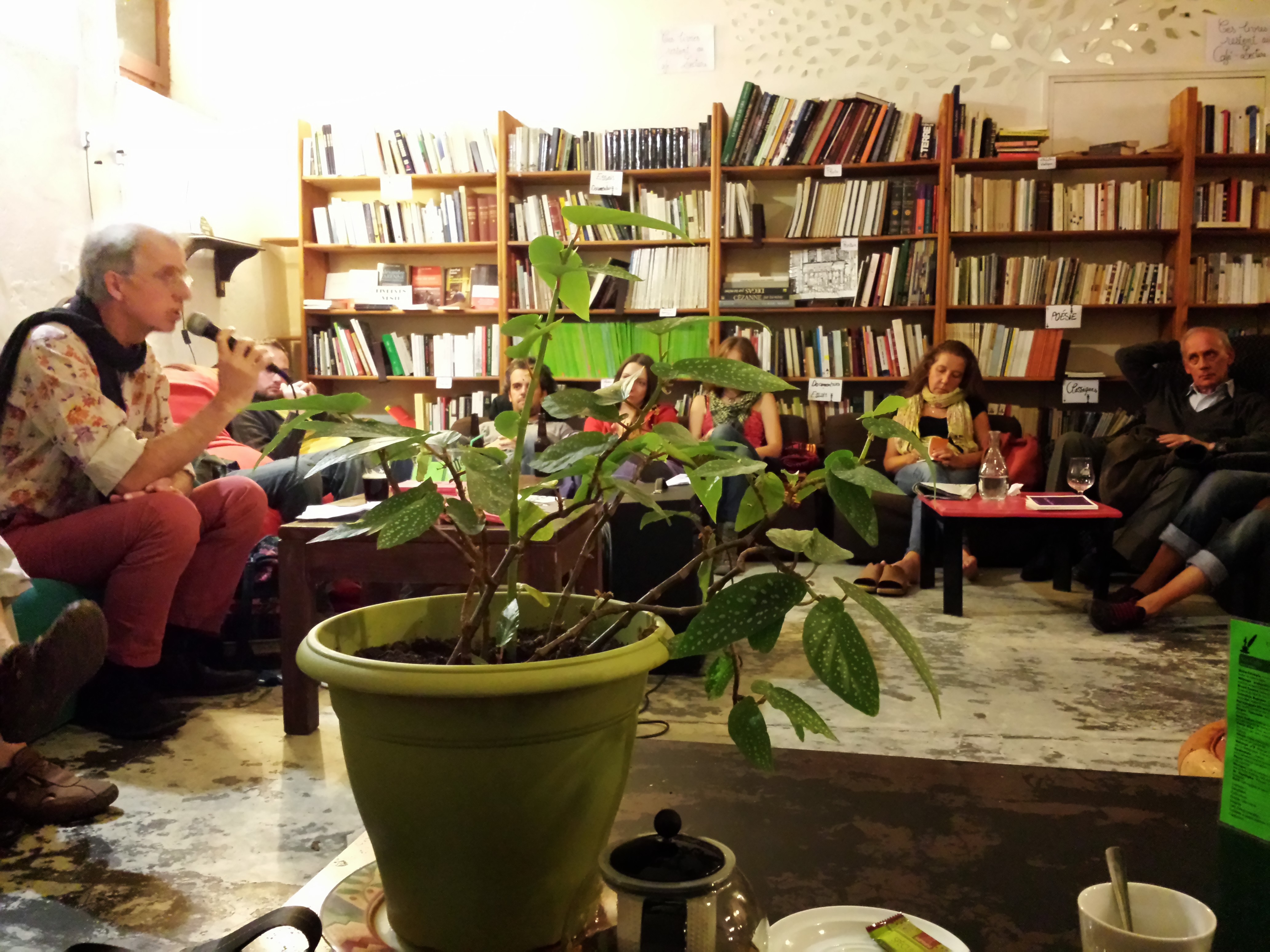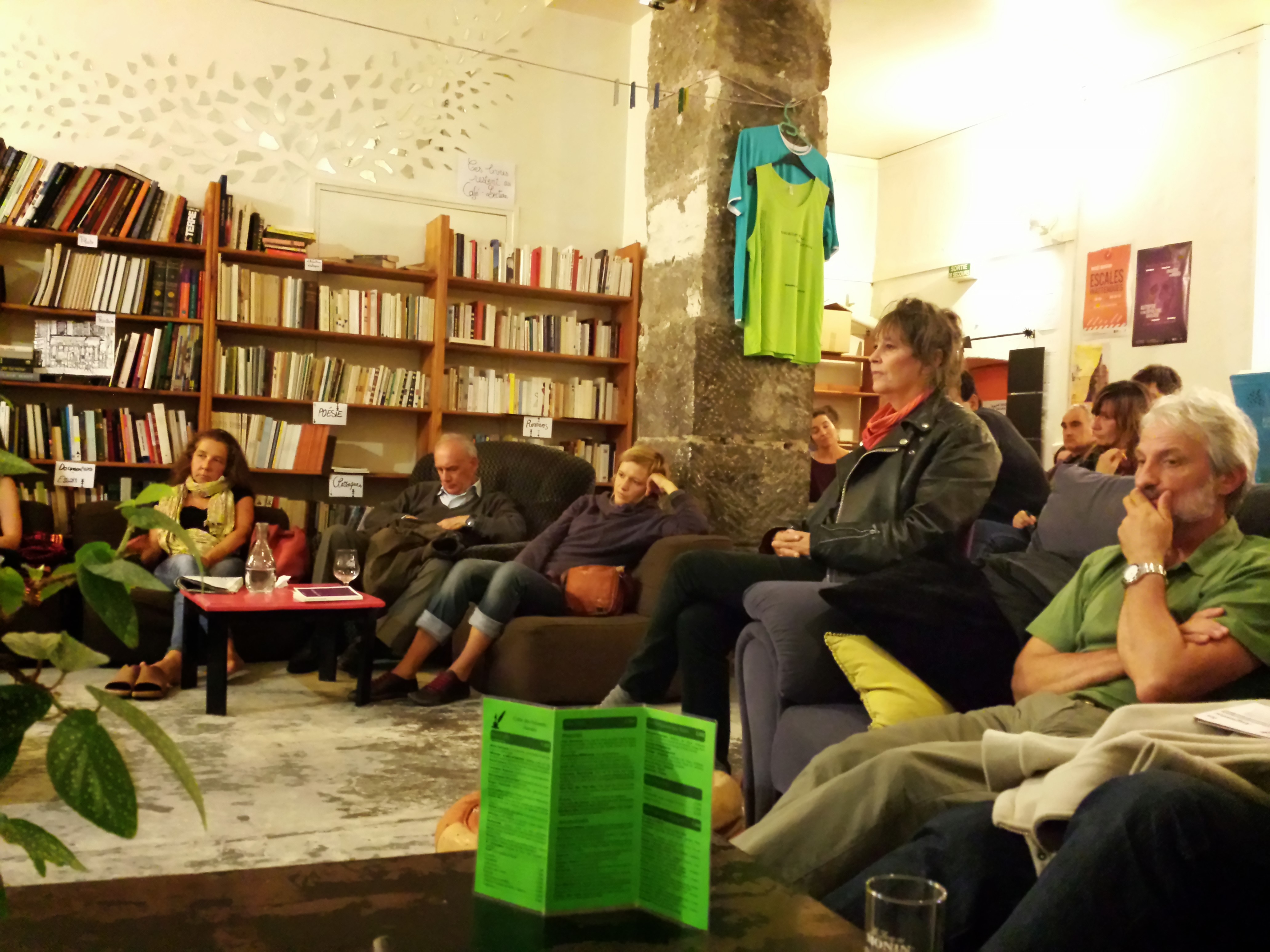 Après ce petit dîner, difficile de s’extirper de la douce torpeur du lieu mais il fallait être à 20h30 au café-lecture Les Augustes pour une conférence donnée par Philippe Godard sur le thème « A-t-on besoin de chefs ? ». Les Augustes, c’est une programmation riche. Des cafés-rencontre (philo, phyto, anglais, allemand, langue des signes, jeu de go, etc.), des ateliers (écriture notamment, que je voudrais bien faire un jour), des conférences et débats, des concerts et plein d’autres choses encore. Tout est gratuit. Le public peut adhérer à l’association et verser son obole, et bien sûr, les recettes des consommations viennent grossir la tirelire. Thés et infusions bio, bières du Plan B, casse-croûtes légers (quiches, tartes…), fruits bio… accompagnent les activités ou tout simplement une pause lecture lové dans les canapés et fauteuils élimés, les livres et journaux étant à disposition de tous. Il y a même un piano et un PC avec accès à Internet. Moi ce que j’aime, c’est l’hiver quand les vitres sont embuées et que de l’extérieur on n’aperçoit que les silhouettes floues des gens à l’intérieur d’où fusent des éclats de voix. Ça donne envie de renter se mettre au chaud. Donc samedi, c’était une conférence-débat. Je ne vais pas développer le contenu car Philippe Godard est un puits de culture et de références que je ne maîtrise absolument pas. Sa conclusion, c’est que nous sommes des asservis volontaires (cf. La Boétie) et que nous n’avons pas besoin de chefs. Il n’y a pas de pouvoir, que du vouloir. Le débat qui a suivi était fort intéressant, avec des personnalités très différentes qui se sont exprimées. Entre le vieux sage érudit à la diction impeccable et au sourire malicieux (probablement un prof de philo retraité, si je suis mon sixième sens) et le jeune « libertaire décroissant » (celui qui distribue gratuitement des viennoiseries, hein Jean-David ?)… le débat volait haut. On ne va pas se mentir, Les Augustes drainent un public d’intellectuels particulièrement pointus et souvent engagés politiquement (ou du moins associativement). Toutefois, les « cafés » sont très ouverts et rien n’oblige à ouvrir sa gueule quand on n’a rien à dire, on peut juste entrer écouter et boire un coup (ou pas). Je regrette ne pas aller plus souvent dans ce café, à quelques pas de chez moi. C’est en tout cas devenu une adresse incontournable de Clermont-Ferrand, ainsi qu’une référence pour de nombreux lieux similaires qui s’ouvrent ici ou là.