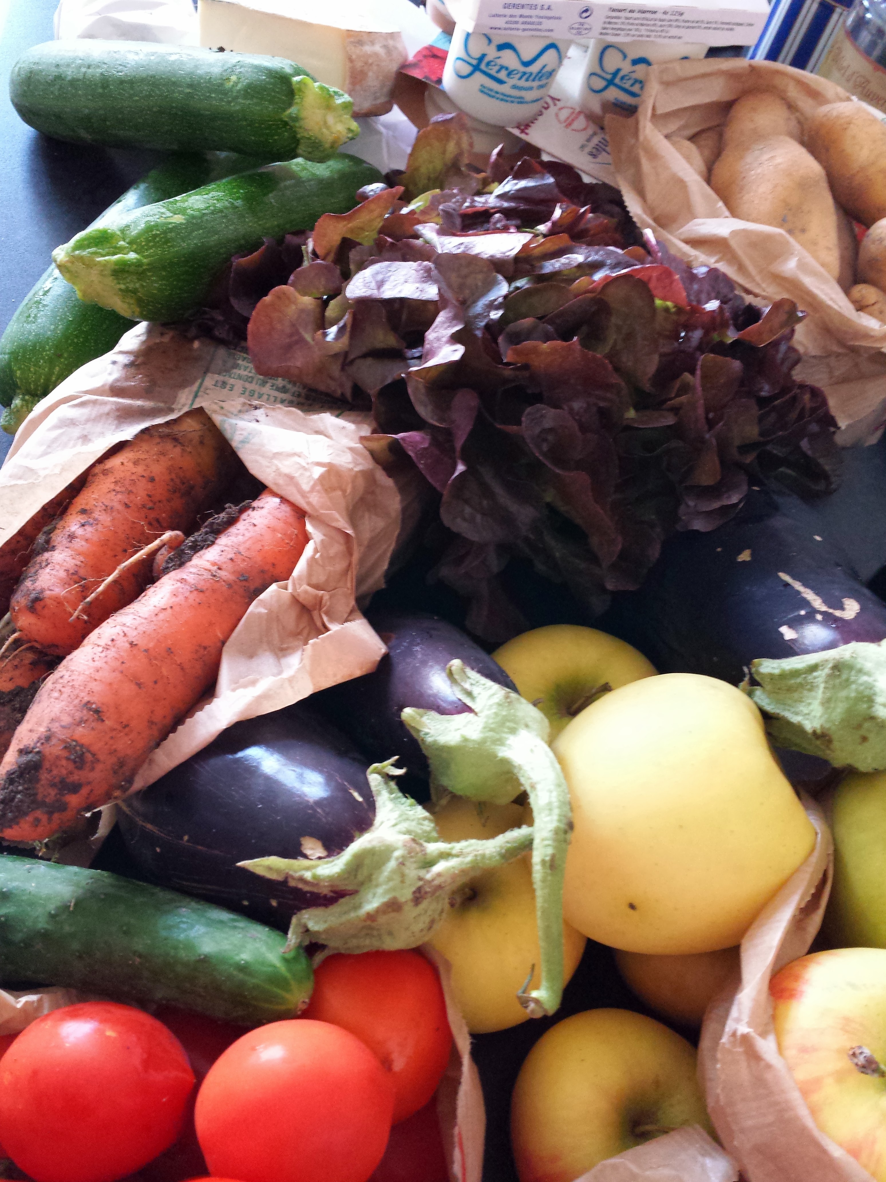 Voilà bien longtemps que je n’avais pas commandé au Panier Paysan. La faute aux vacances (les miennes et les leurs) et aux week-ends chargés. Pour info, Aurélie qui menait la barque jusqu’à présent a passé la barre à Patrice, l’un des producteurs. Malheureusement la vente de produits locaux aux particuliers n’est pas une affaire rentable, c’est peu de le dire. Alors je vais continuer à commander le plus régulièrement possible, parce que la formule du Panier Paysan me convient tout particulièrement. Et sans ce service, je n’aurais pas l’occasion de manger autant de produits locaux, l’offre étant bien éparpillée. Le magasin L’Eau vive où je me ravitaille en propose autant que faire se peut (via Le Biau jardin notamment). Pour bien faire il faudrait aller au marché Saint-Joseph le vendredi matin mais évidemment… y en a qui bossent. C’est quand même assez déprimant de constater à quel point c’est compliqué de manger local et/ou bio, alors qu’il suffit de passer un coup de fil pour avoir une demi-heure plus tard une pizza ou un burger et des frites sur la table de son salon.