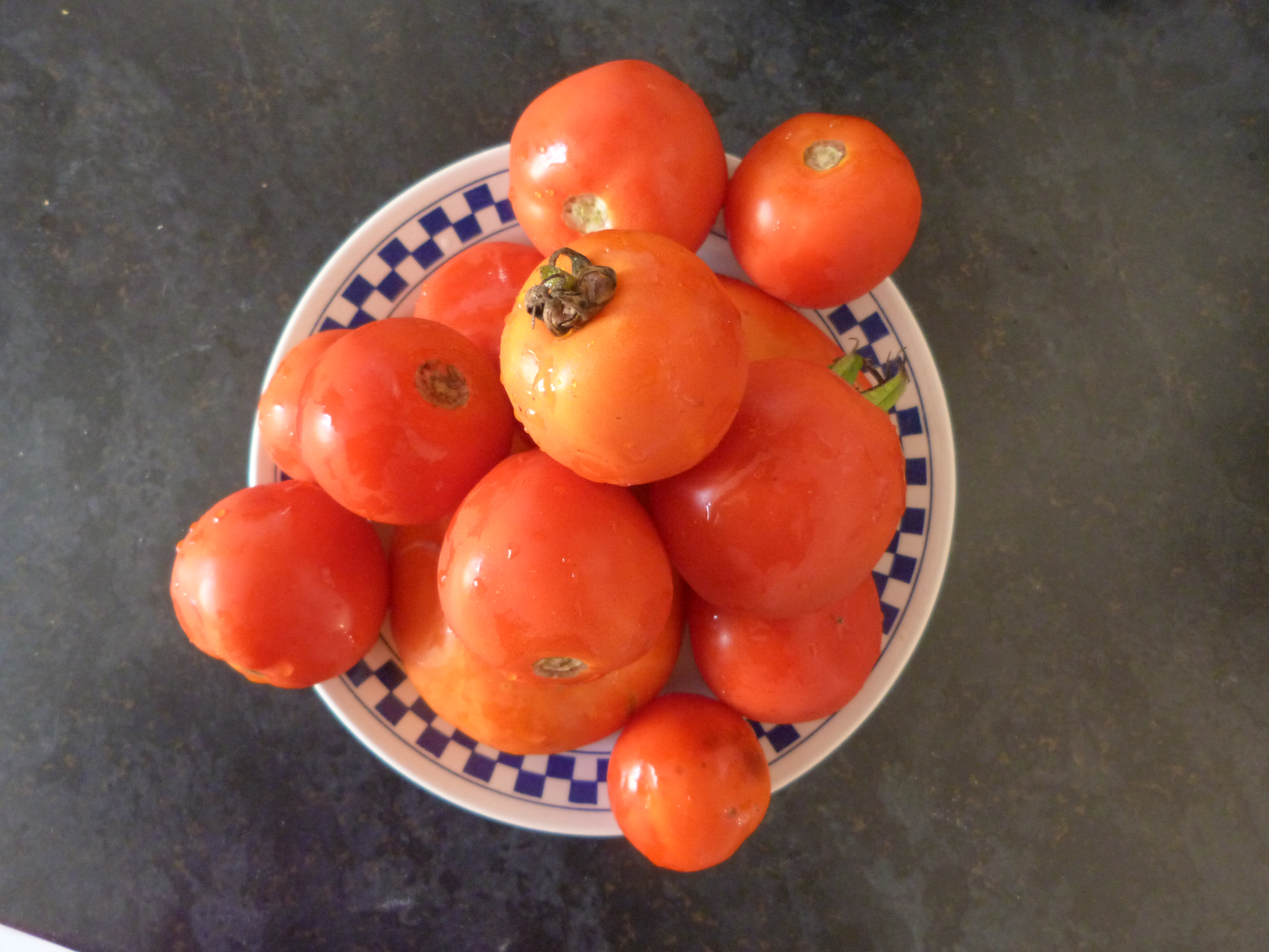 Aujourd’hui, j’ai pelé, épépiné 2 kg de tomates locales bio (+ 2 grosses unités rapportées de chez mes parents) pour en faire de la sauce que je vais congeler afin d’en profiter cet hiver. Je la répartis dans des moules à muffins que je congèle, puis que je démoule afin de les mettre dans des sachets congélation. Dans la sauce : des oignons locaux bio (de chez L’Eau vive), des herbes bio, et un peu de sucre de canne bio non raffiné.