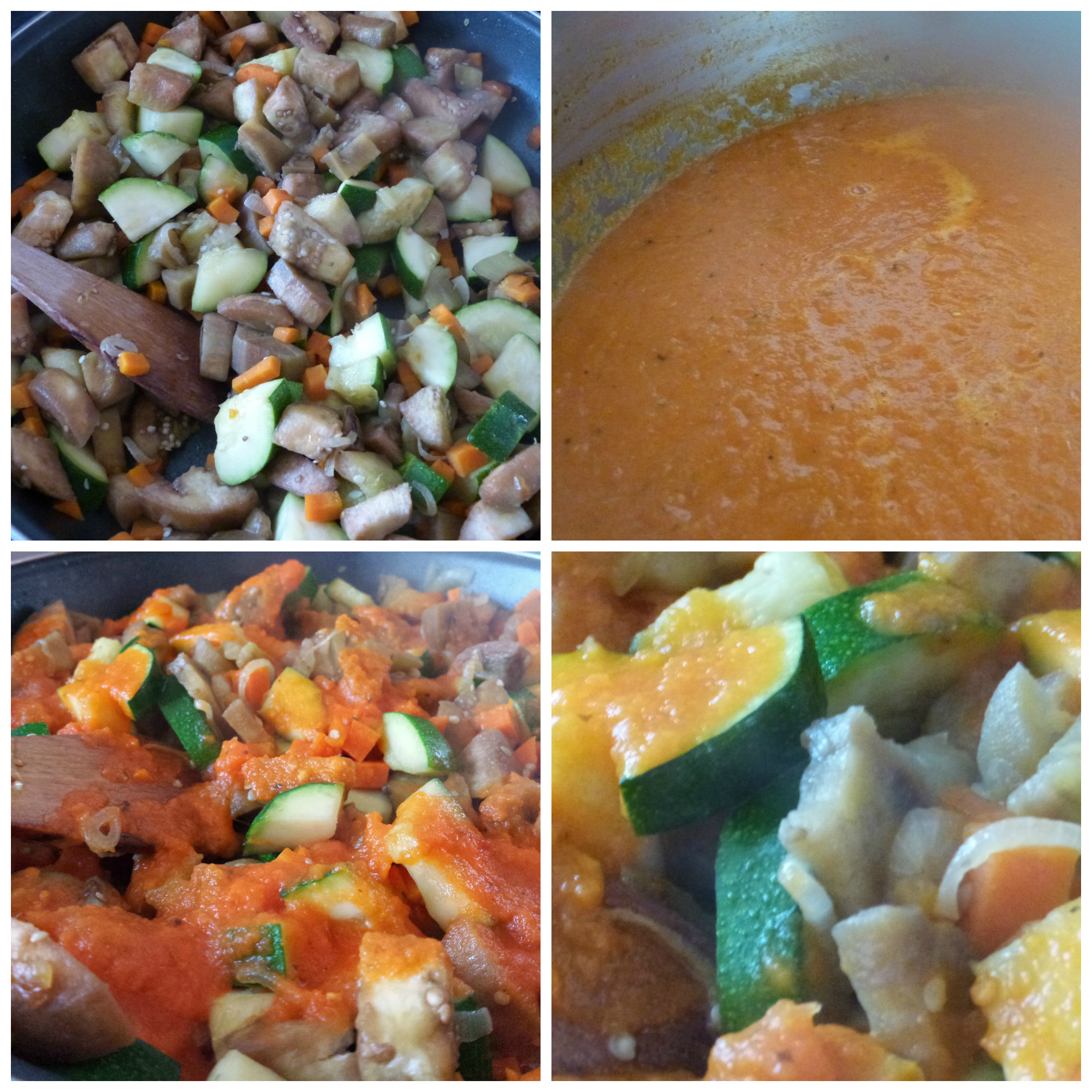 Ratatouille de carottes, aubergines locales, courgettes et oignons locaux bio, arrosée de sauce tomate décrite ci-dessus.
