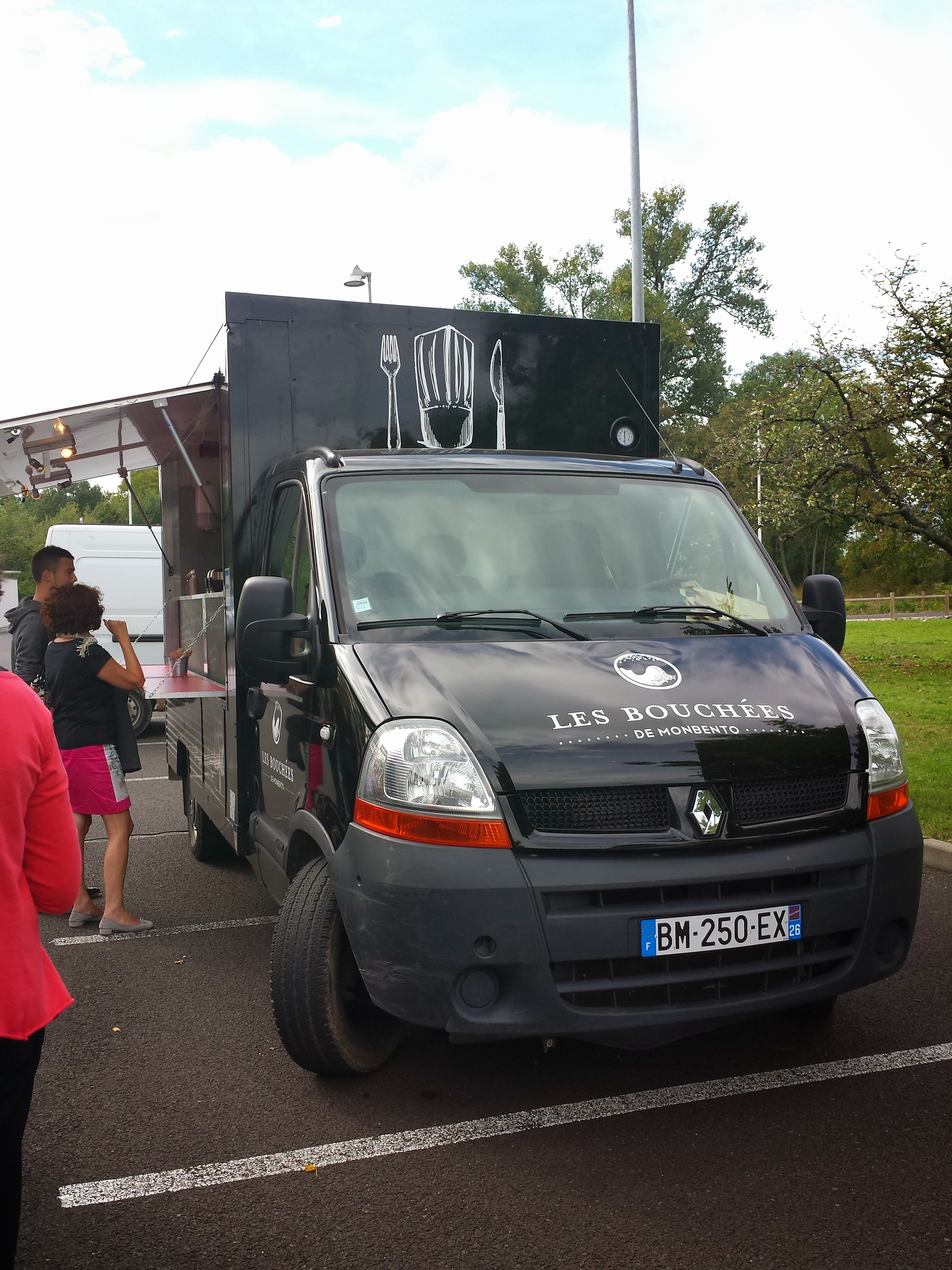 [edit du lundi 21 octobre] 2e test du petit food truck et ses jolies bouchées. Il a eu le bon goût de se garer… sur MON parking de boulot. Vite arrivée, vite repartie, ça compte dans l’appréciation de ce deuxième test. Au menu : plein de choses. Trois bouchées salées, trois desserts dont du brownie et du quatre-quarts aux pommes, de la soupe poireau-pomme de terre… J’ai jeté mon appétit sur des bouchées au porc sauce curry, accompagnées de salade, chou rouge, oignon, courgettes (?) râpées, brocolis, patates sautées, et sur des bouchées aux écorces d’orange, sauce chocolat. Gustativement parlant : top. J’ai tout mangé, tout aimé et surtout le dessert. Et y avait pas de poivrons, je m’en suis assurée à la prise de commande, on ne m’aura pas deux fois. Niveau attente, elle a été divisée par deux par rapport au premier test, ramenant à trente minutes la patience nécessaire pour récupérer son miam. J’ai choisi d’arriver plus tôt que l’autre jour mais finalement, si j’étais arrivée plus tard, j’aurais moins attendu. Bon, c’est comme ça, tout le monde s’est pointé vers midi, midi et quart. Donc en théorie, j’aurais pu attendre encore moins longtemps (genre 15 mn, tout à fait raisonnable) mais je n’aurais pas eu les bouchées à l’orange, vu que j’ai eu droit aux dernières, nananère. Je ne regrette donc rien.