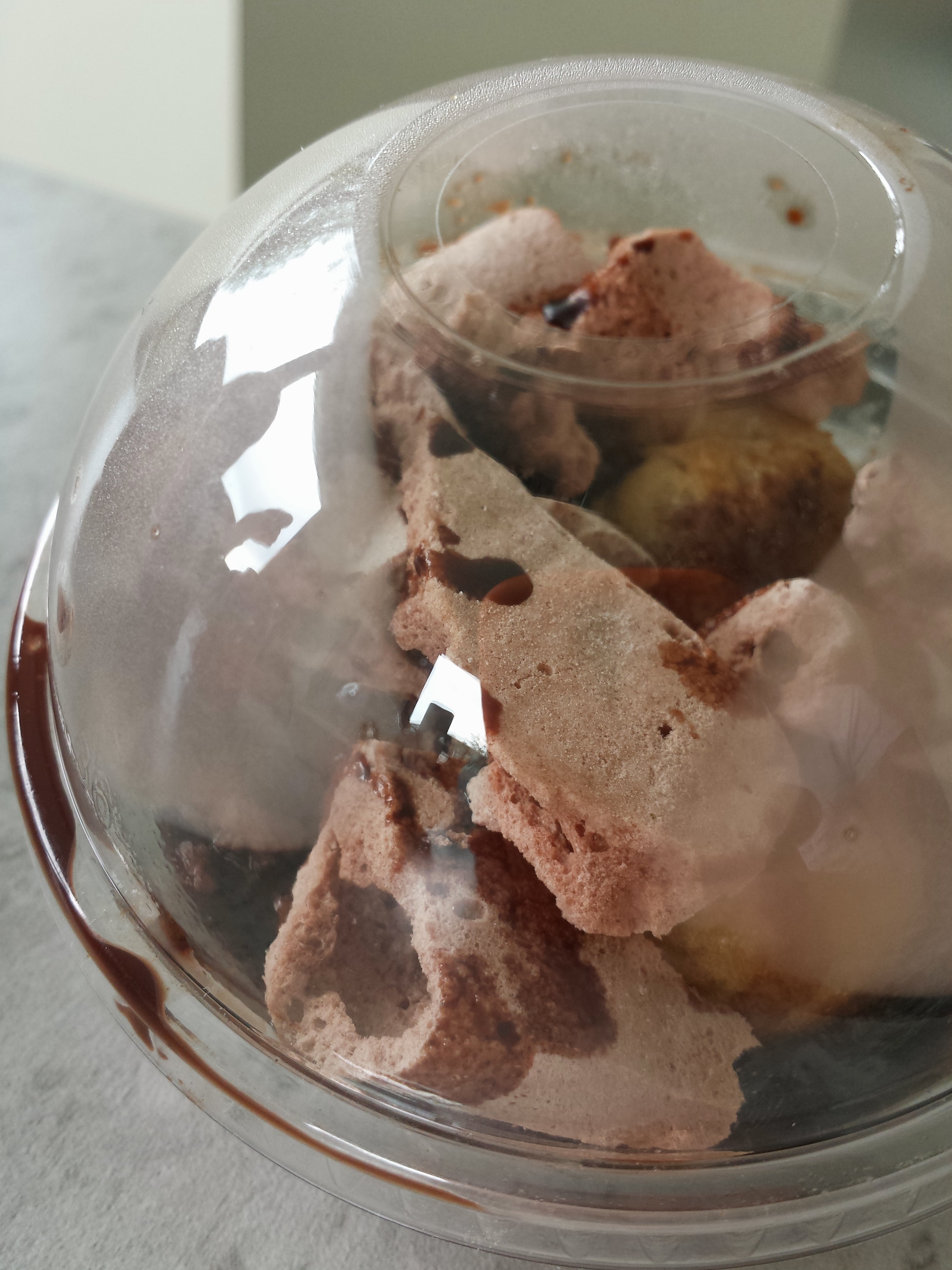 Passons à la dégustation ! Grosse surprise en ouvrant la boîte des bouchées salées : je pensais trouver de la salade et c’est du taboulé et une poêlée de poivrons tricolores qui accompagnaient les bouchées. Le taboulé, délicieux, parfumé, léger. Les bouchées au bœuf avec la sauce qui n’était pas réglementaire, délicieuses (je peux au moins m’enorgueillir d’avoir testé une recette inédite ^^). Les poivrons… alors là c’est vraiment dommage mais je ne peux pas en avaler, mon estomac les refuse. Du coup je les ai laissés et ceux qui me connaissent savent que ce n’est pas dans mes habitudes de gaspiller de la nourriture. Je n’ai pas vu/lu d’informations sur l’accompagnement. Peut-être y en avait-il mais je ne crois pas. En tout cas si je l’avais su, j’aurais demandé double rasade de taboulé à la place et ça aurait été génial. Toutefois, les collègues amatrices de poivrons ont aimé l’assaisonnement et ses branches de thym fraîches. Point de vue quantité, le repas était suffisamment copieux d’après les collègues testeuses (des petits modèles… pas sûr que ça contente un gros rugbyman). Moi évidemment j’ai manqué de légumes. Et pour le dessert, on s’est régalées. Les bouchées type pâte à chou étaient recouvertes d’une sauce chocolat noir délicieuse et de morceaux de ces cigarettes russes au chocolat qu’on nous a fait goûter au camion. J’en aurais volontiers mangé un peu plus.