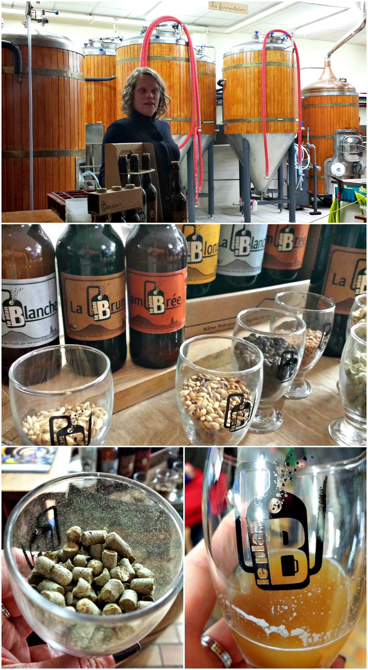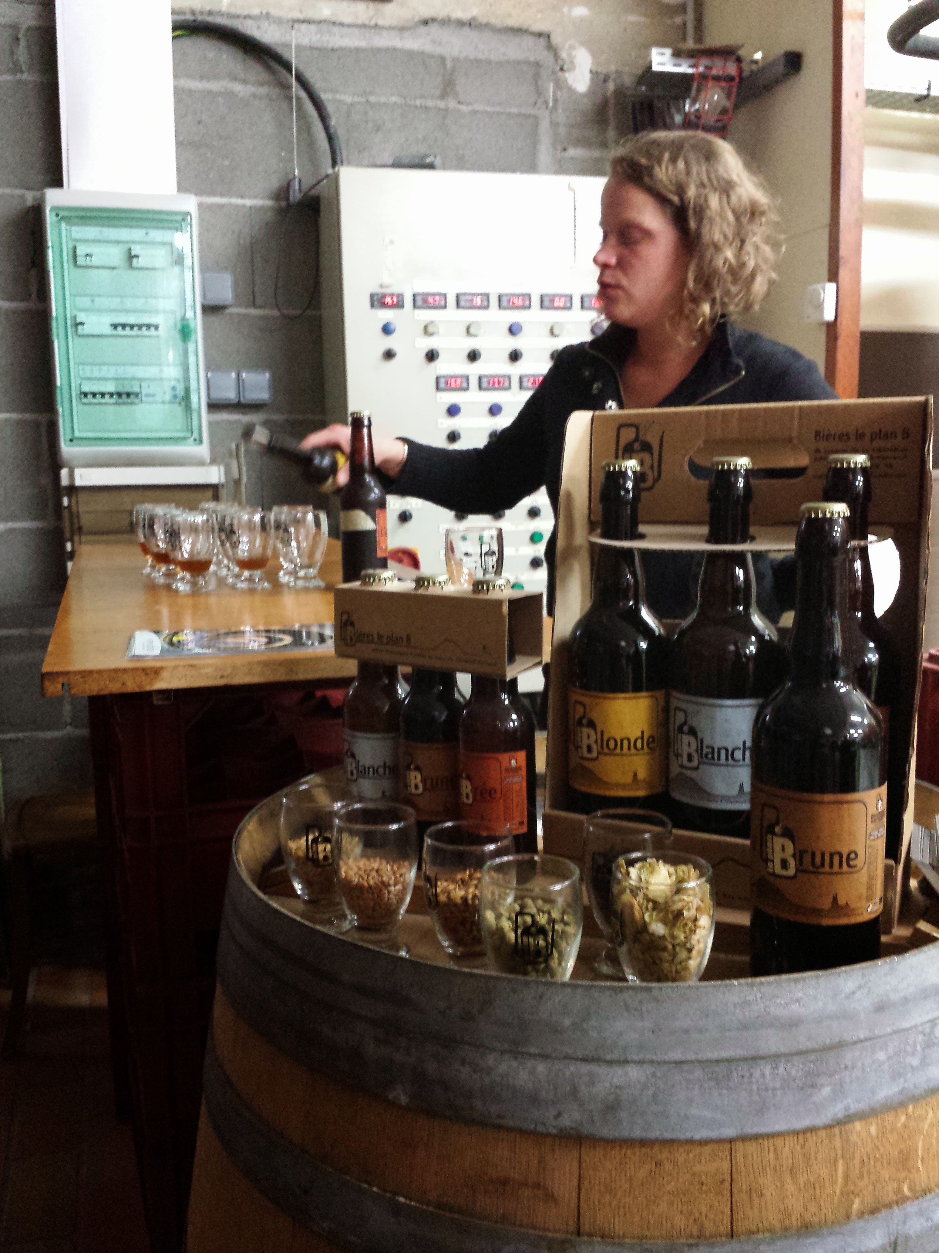 Après un bref passage par la boutique qui a pignon sur rue, Anne-Lise conduit le troupeau de curieux jusqu’à une porte de garage derrière laquelle tout se trame. Des cuves alignées comme à la parade, des cartons de bouteilles, une étiqueteuse… petite sensation savoureuse d’interdit, ambiance Prohibition. Rassurez-vous, tout est parfaitement légal. On commence par les ingrédients. Les visiteurs sont invités à plonger leur nez et à croquer dans des grains de céréales et dans du houblon, les deux ingrédients principaux. Puis le processus est expliqué pas à pas, de l’infusion des grains à la mise en bouteille. Je ne vais pas vous expliquer toutes les étapes car d’une part je ne m’en souviens pas (arf) et d’autre part, c’est quand même mieux d’y aller. La touche personnelle de la maison reste les recettes spéciales en fonction des saisons. La bière blonde des vacances 2013 avait été agrémentée d’un peu de thé vert, celle de Noël d’un thé à la bergamote, et celle de cet automne met le sarrasin à l’honneur. Évidemment, ne vous attendez pas à des saveurs puissantes du genre de la fameuse bière à la cerise, ces arômes sont de subtiles associations qui transforment la bière en un véritable objet de dégustation.