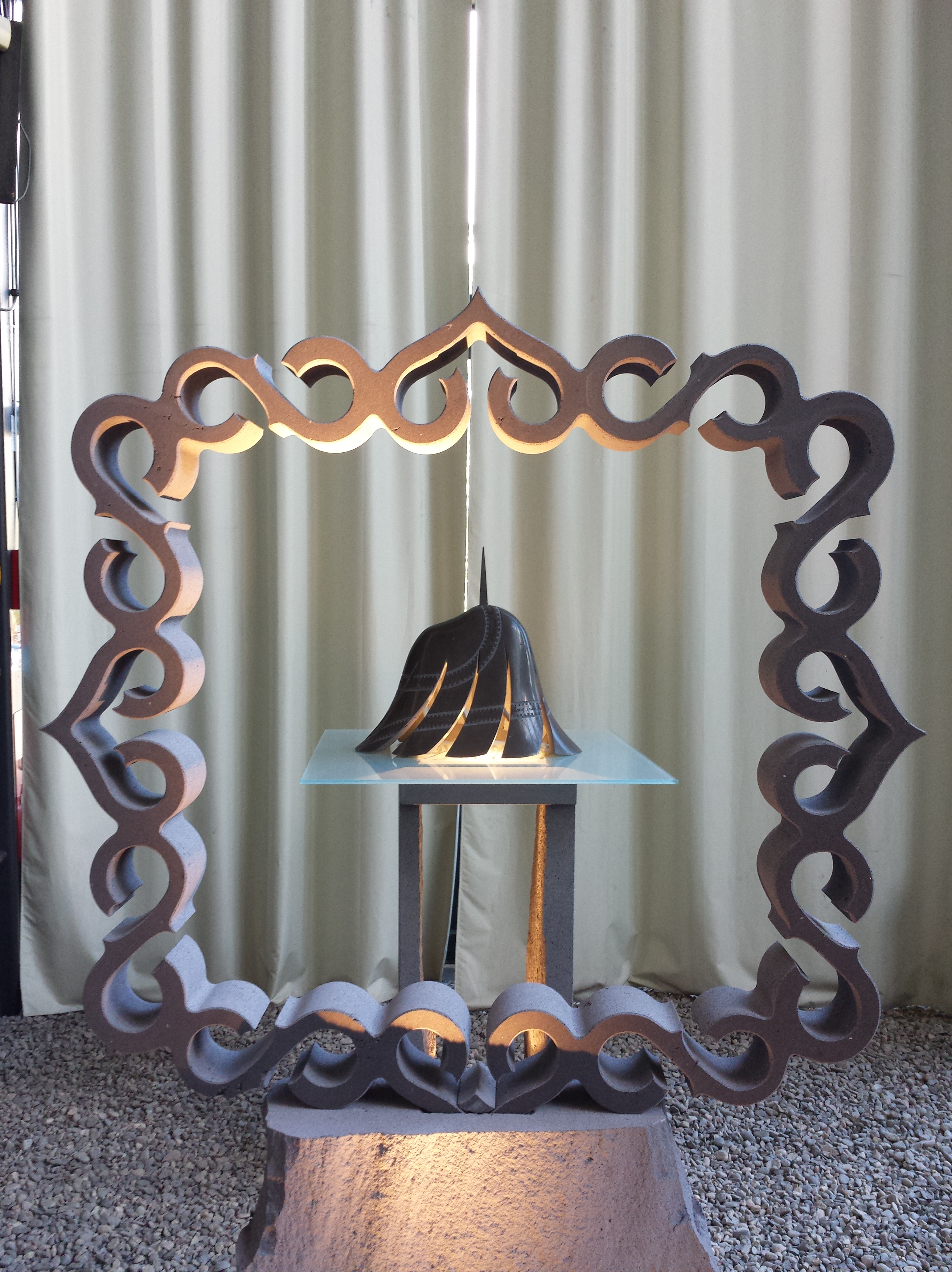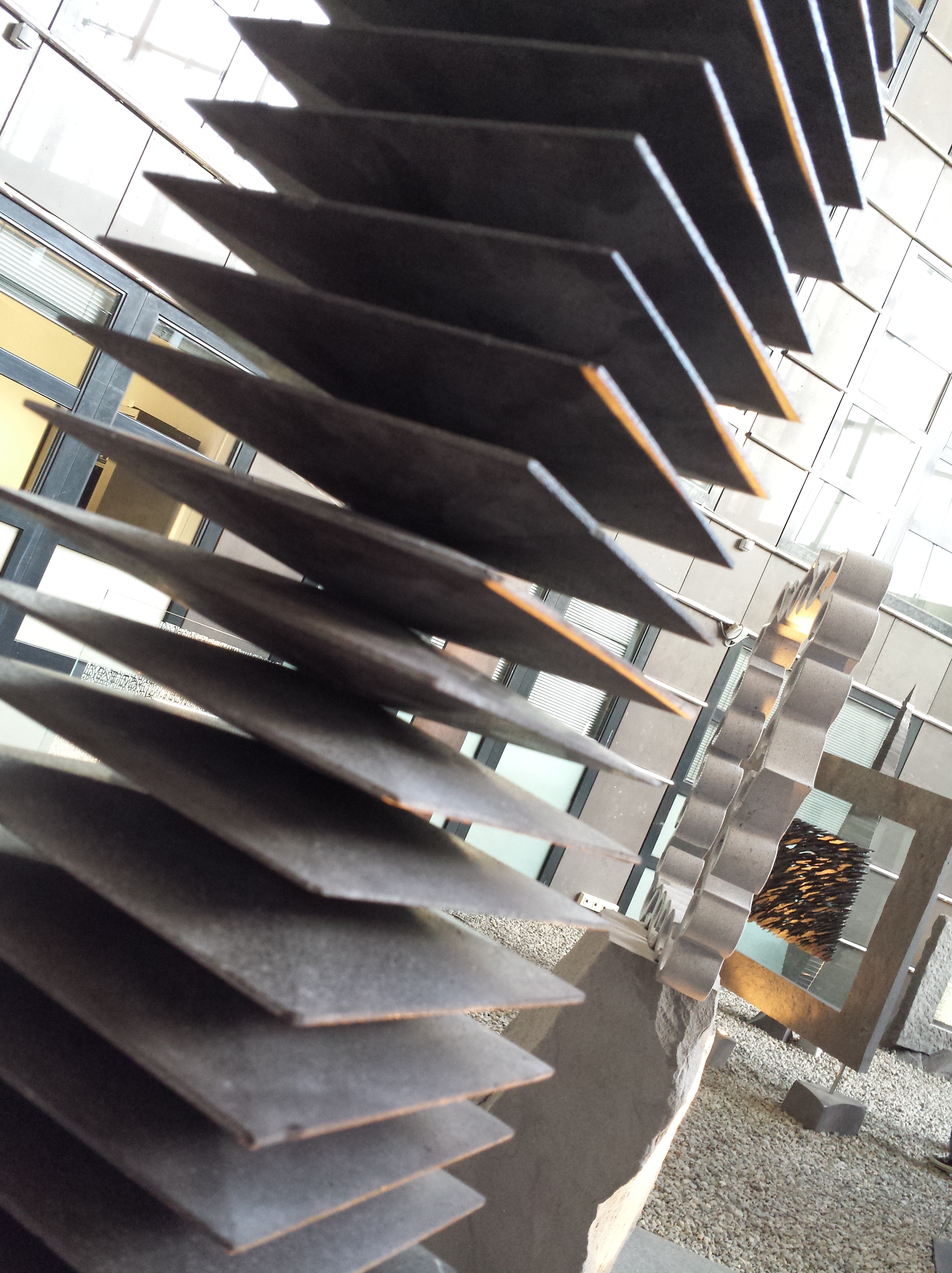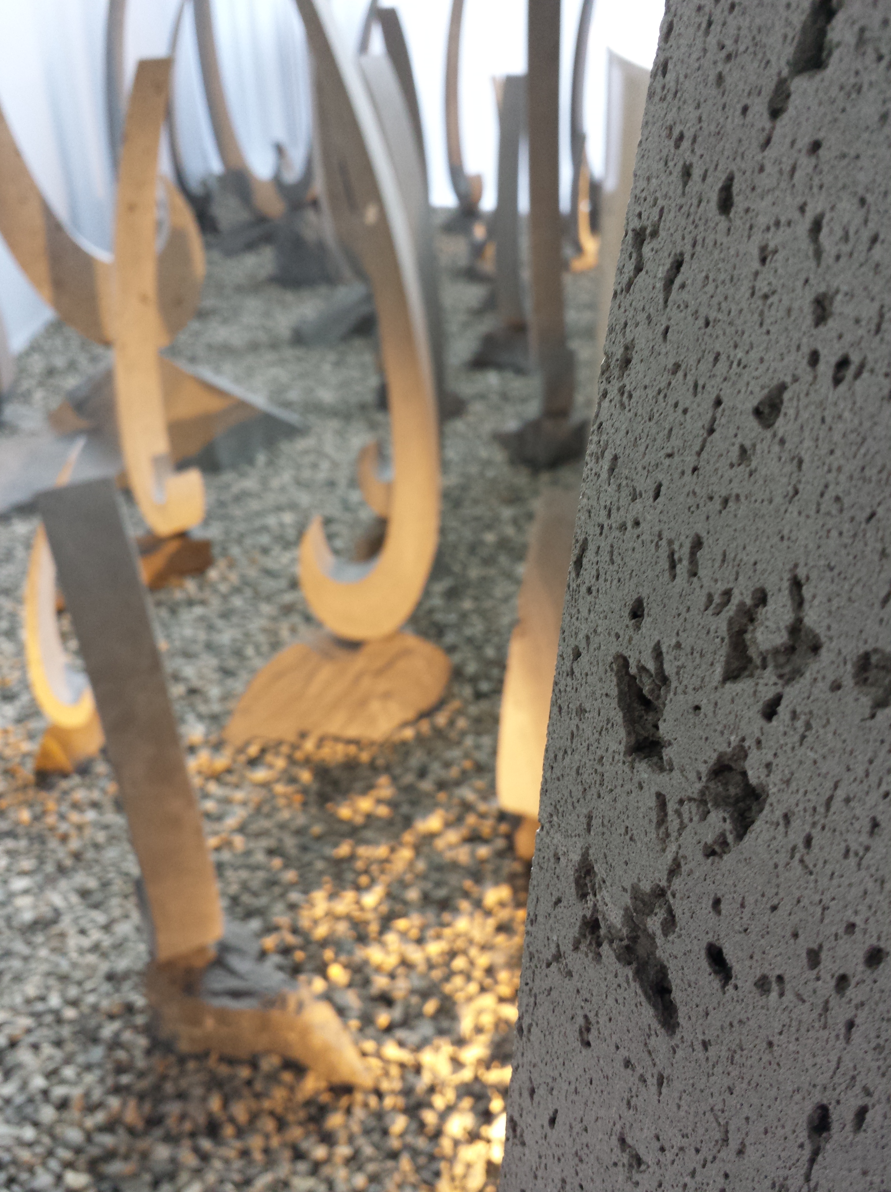 L’expo reste en place jusqu’au 14 décembre 2013 (13h-19h, y compris le samedi). Courez-y, c’est la première fois qu’une telle profusion d’œuvres est à disposition du grand public. La mise en scène est parfaite, avec la diffusion d’une musique d’ambiance un peu mystérieuse, et des cailloux disposés sous les pieds du public, qui crissent et le transportent dans un univers minéral total. Une jeune femme est également là pour répondre aux questions des curieux. C’est d’ailleurs elle qui m’a appris que la grande sculpture en forme de planche de surf, et percée de trous ronds, était sa première véritable « œuvre », réalisée à l’âge de 16 ans. Tu foutais quoi, toi, à 16 ans, cher lecteur ? Mmhh ?