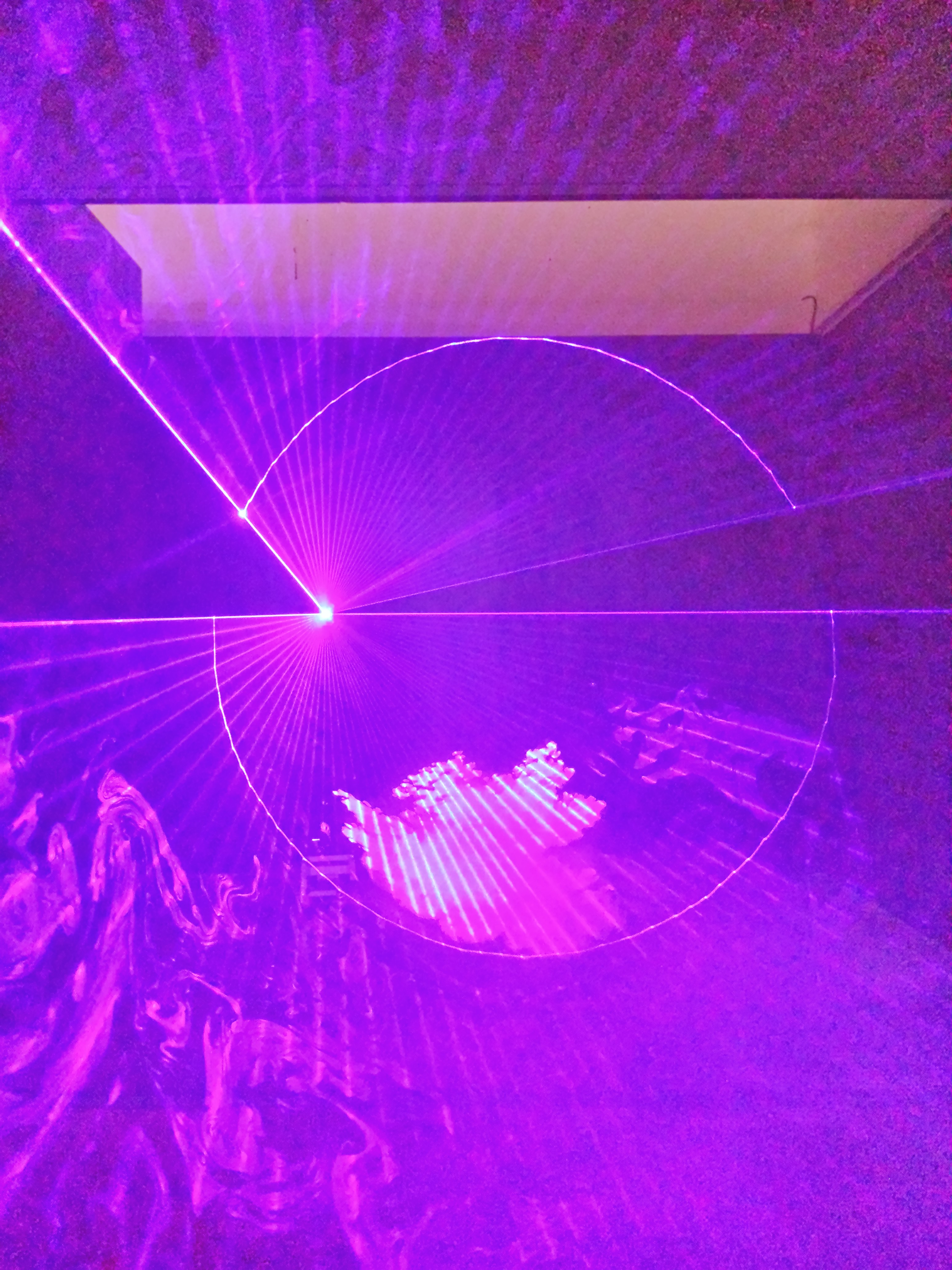 Enfin, Tony Regazzoni invite le spectateur à s’installer sur de fausses ruines de temple grec (en polystyrène) afin de contempler un paysage de clair de Lune. Celle-ci est représentée par un laser bleu. Évidemment il faut de la fumée et celle-ci envahit tout l’espace d’exposition, imposant à toutes les œuvres une ambiance mystérieuse, mystique. Peut-être que je devrais fréquenter plus souvent les boîtes de nuit, mais j’ai été fascinée par ce laser.