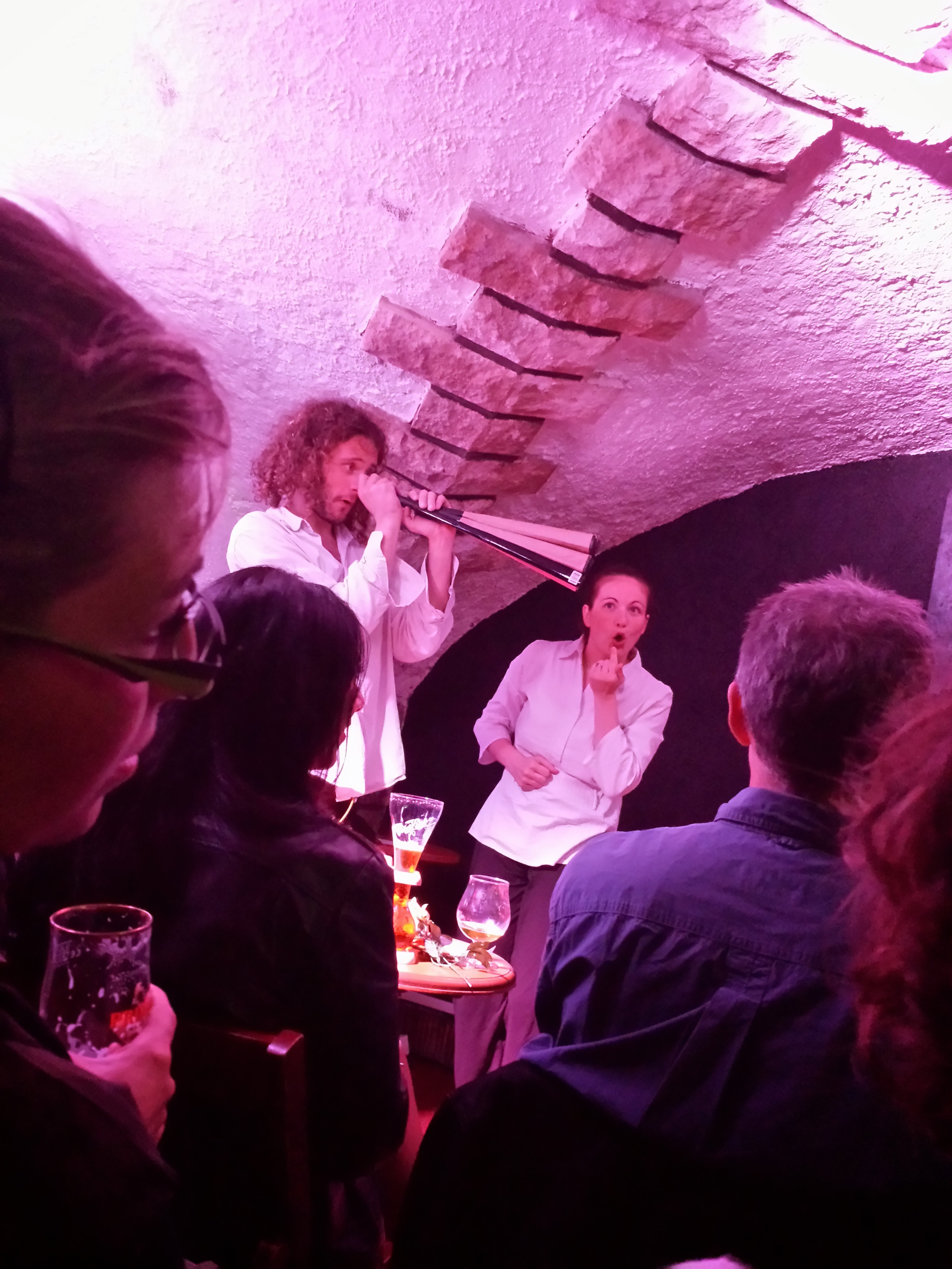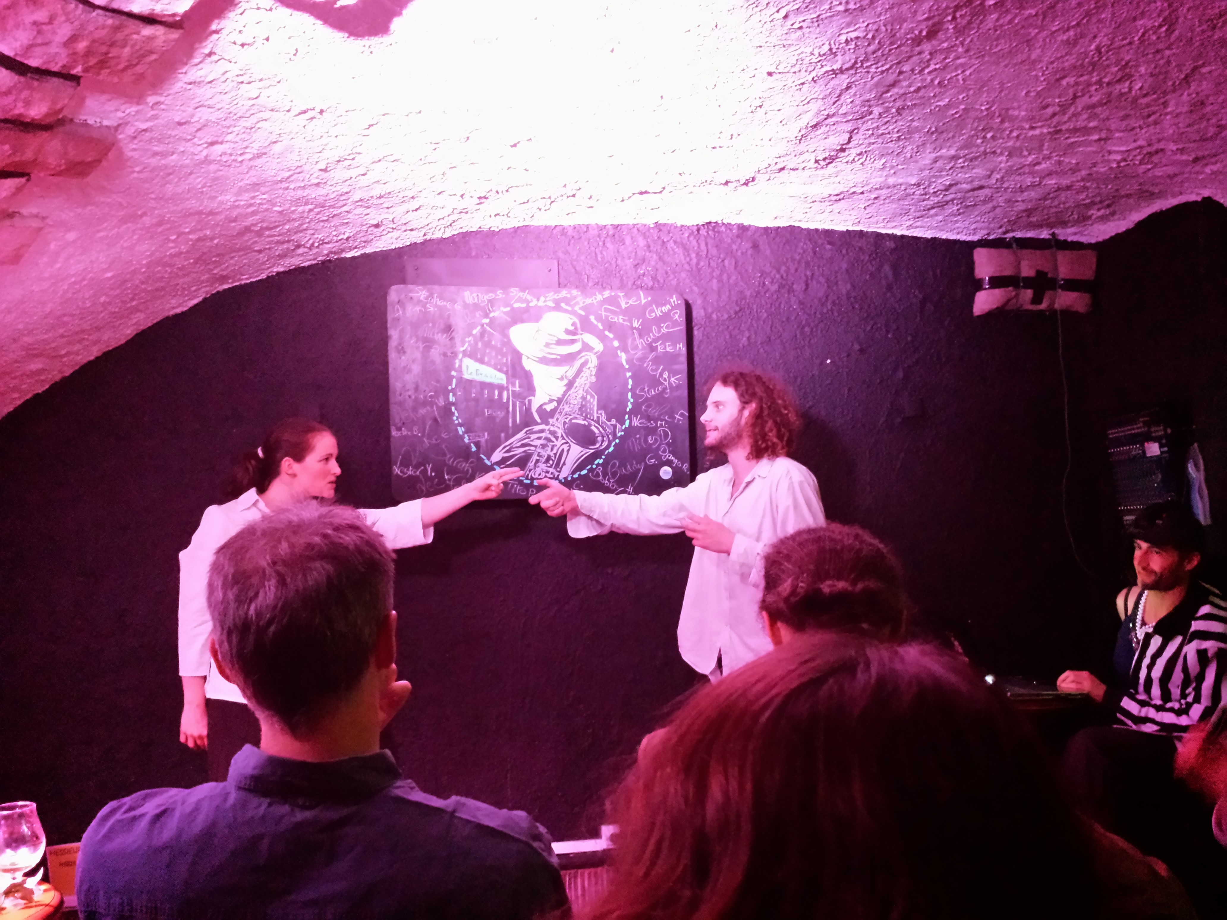 Le principe ? Des « jouteurs », membres de l’association, se livrent à des exercices d’improvisation, aiguillés par des thèmes et mots écrits par nous, public facétieux, et sous l’arbitrage d’un maître de cérémonie qui pour l’occasion était légèrement schizophrène, moitié femme, moitié homme.