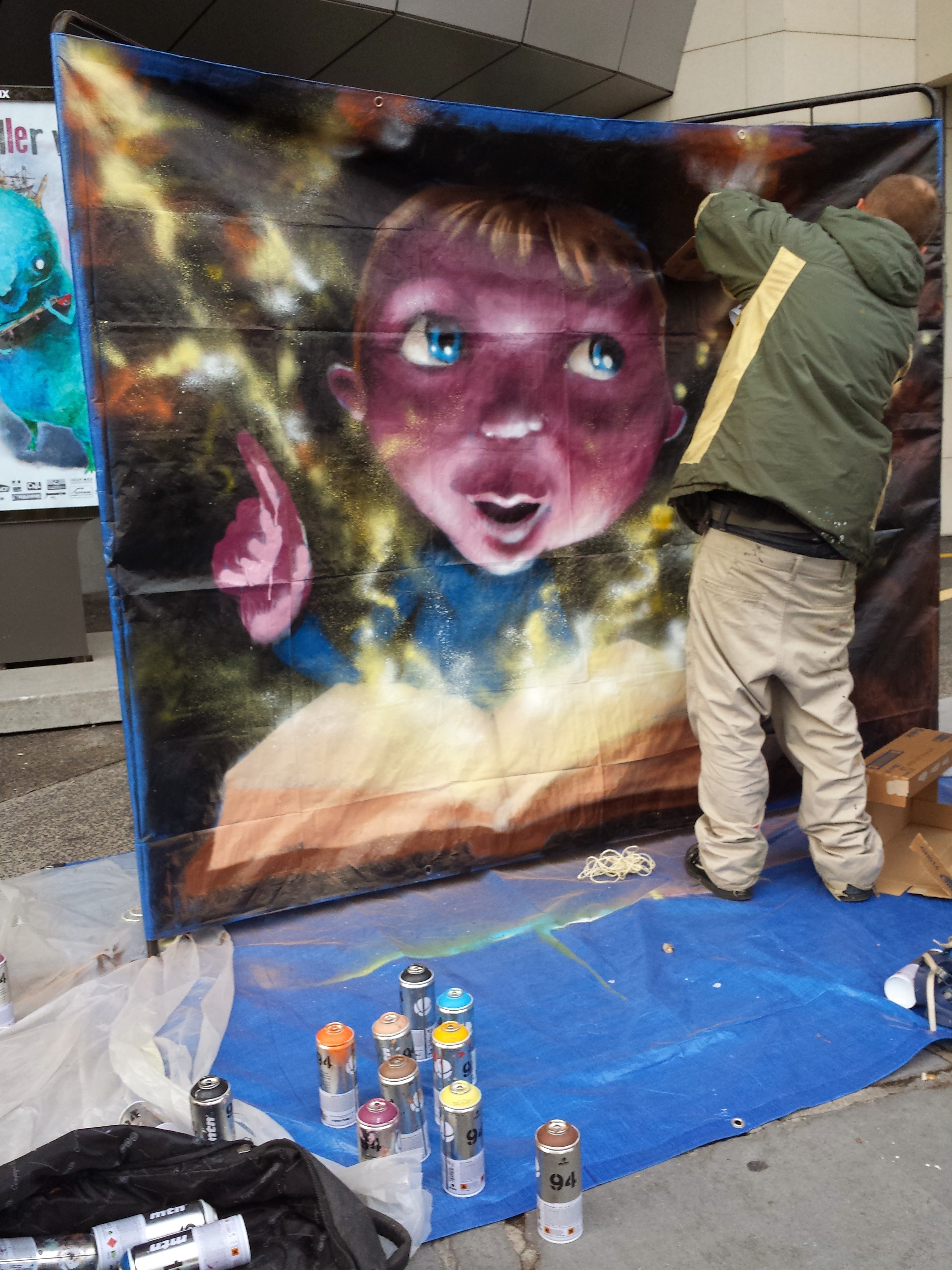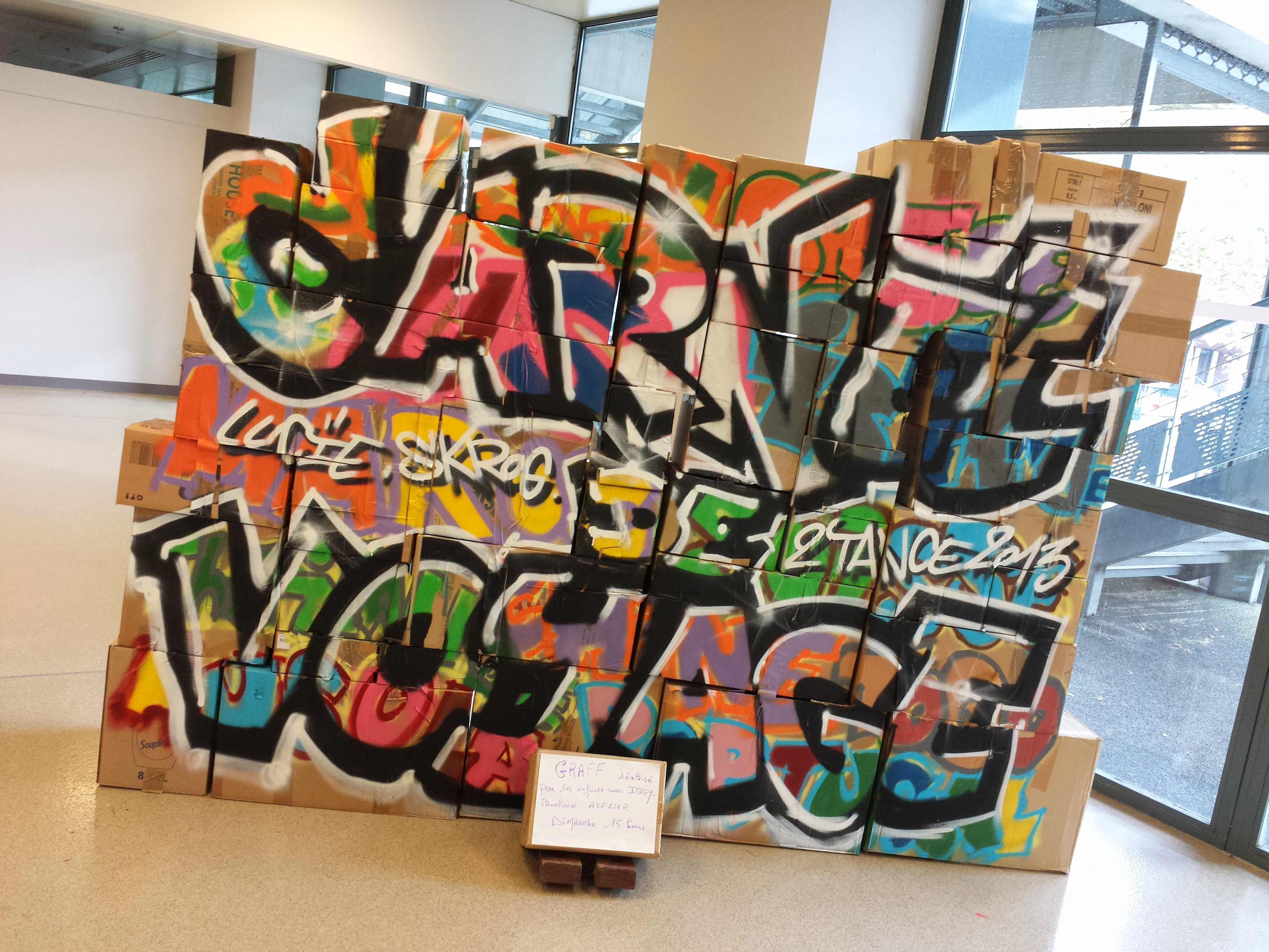 Performance de graff sur le parvis de Polydome. Initiation d’ados à la peinture à la bombe.