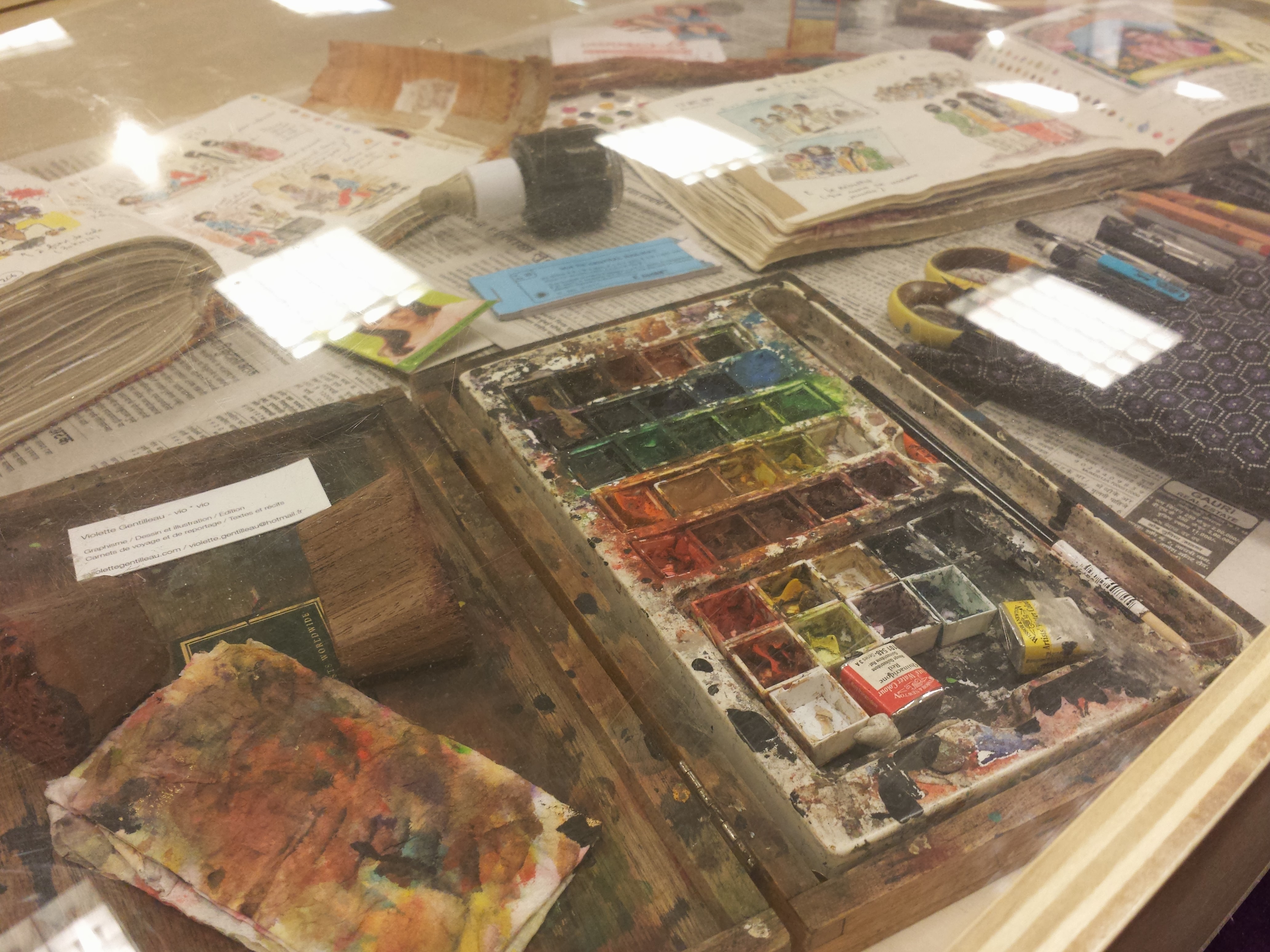 3. Je reconnais la jolie boite d’aquarelles de Violette Gentilleau. Elle disait hier qu’elle était drôlement lourde et qu’elle songeait à en acheter une en plastique pour les voyages, en conservant celle-ci pour la maison.