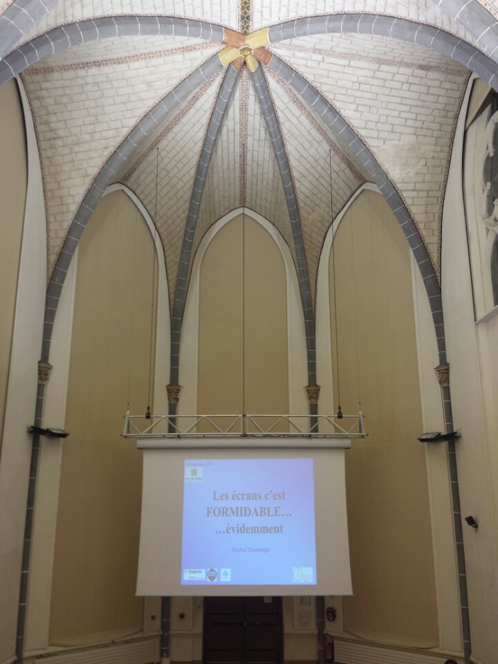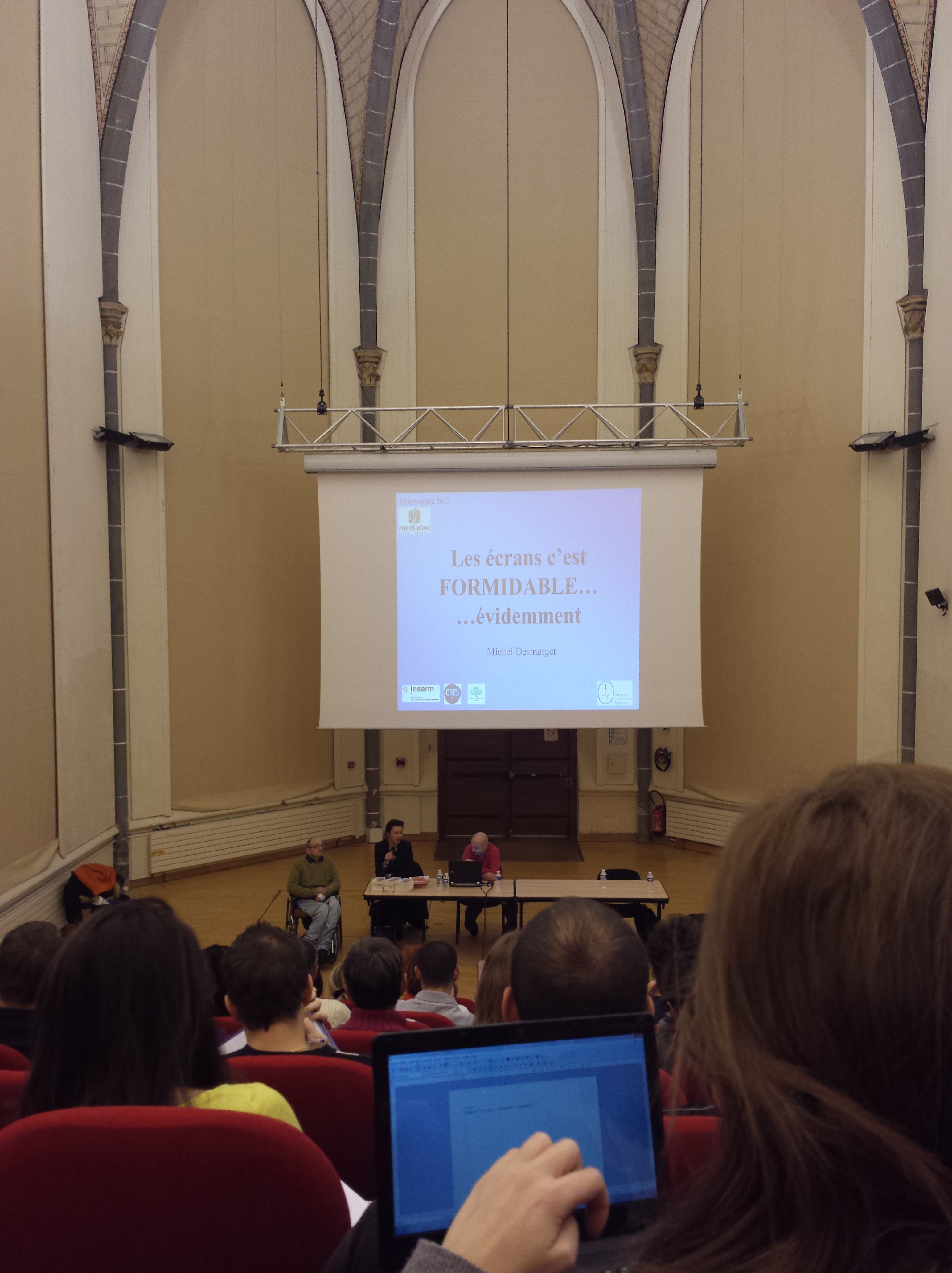 Juste pour expliquer les photos qui peuvent paraître un peu incongrues, je précise que la conférence avait lieu dans la chapelle des Cordeliers, qui a perdu ses attributions religieuses pour laisser place à des événements plus… ouverts. Pour ceux qui s’en souviennent, c’est là que j’avais assisté à une après-midi consacrée au projet de jumelage entre le mont Fuji et le puy de Dôme (projet placardisé depuis, bien malheureusement, surtout pour Maïko et Tetsuya qui s’étaient démenés jour et nuit pour le faire aboutir). Bref. La salle est impressionnante.