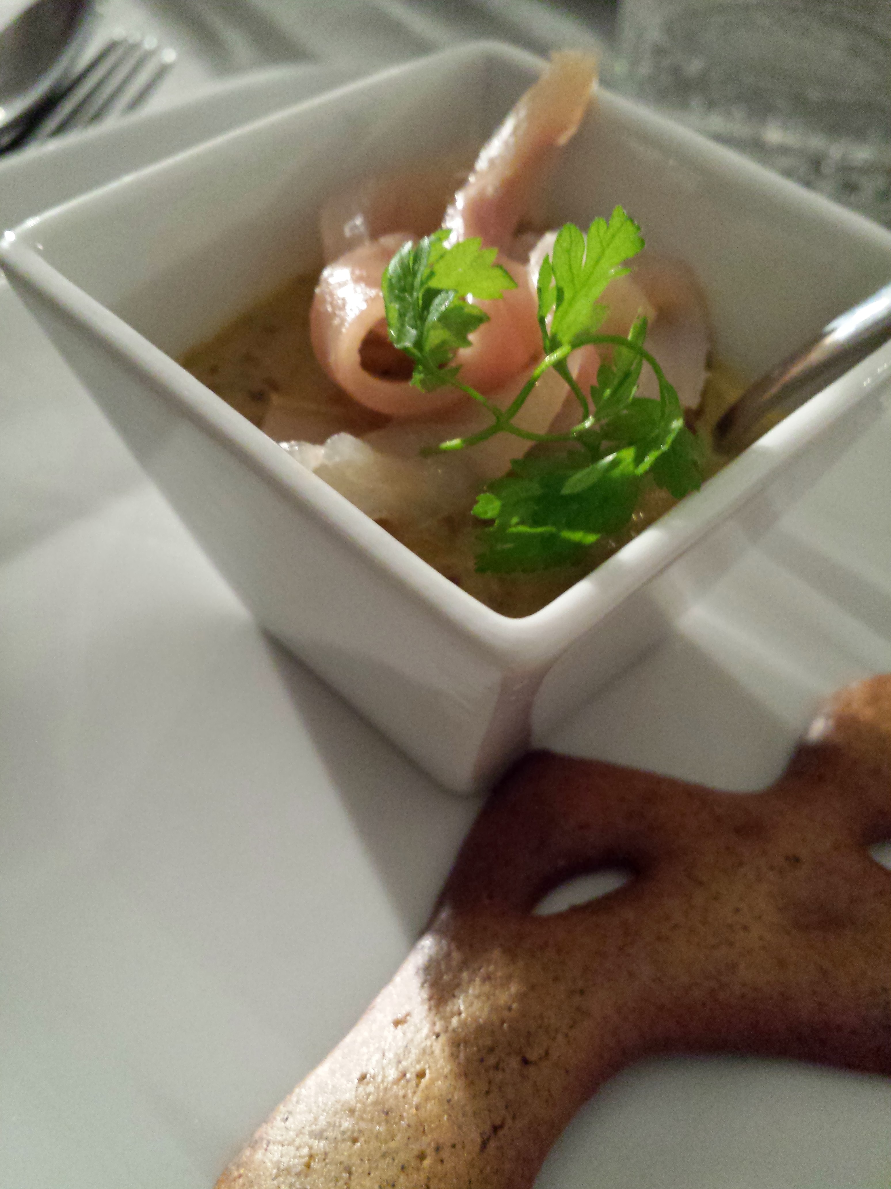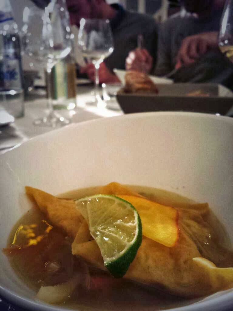 L’entrée est très vite arrivée ensuite (timing impeccable entre les plats). Ravioles de gambas au piment d’Espelette et mascarpone, pot au feu de légumes au safran d’Auvergne. Un vrai délice. Les ravioles étaient légères et la garniture extrêmement goûteuse. Et le petit bouillon de légumes dans lequel elles baignaient était divin. J’avais peur du safran et d’avoir une sensation « paëlla » un peu perturbante mais pas du tout, une saveur subtile, douce, réconfortante. Et comme il y avait du rab… mes partenaires testeurs ne se sont pas fait prier pour tomber dedans…