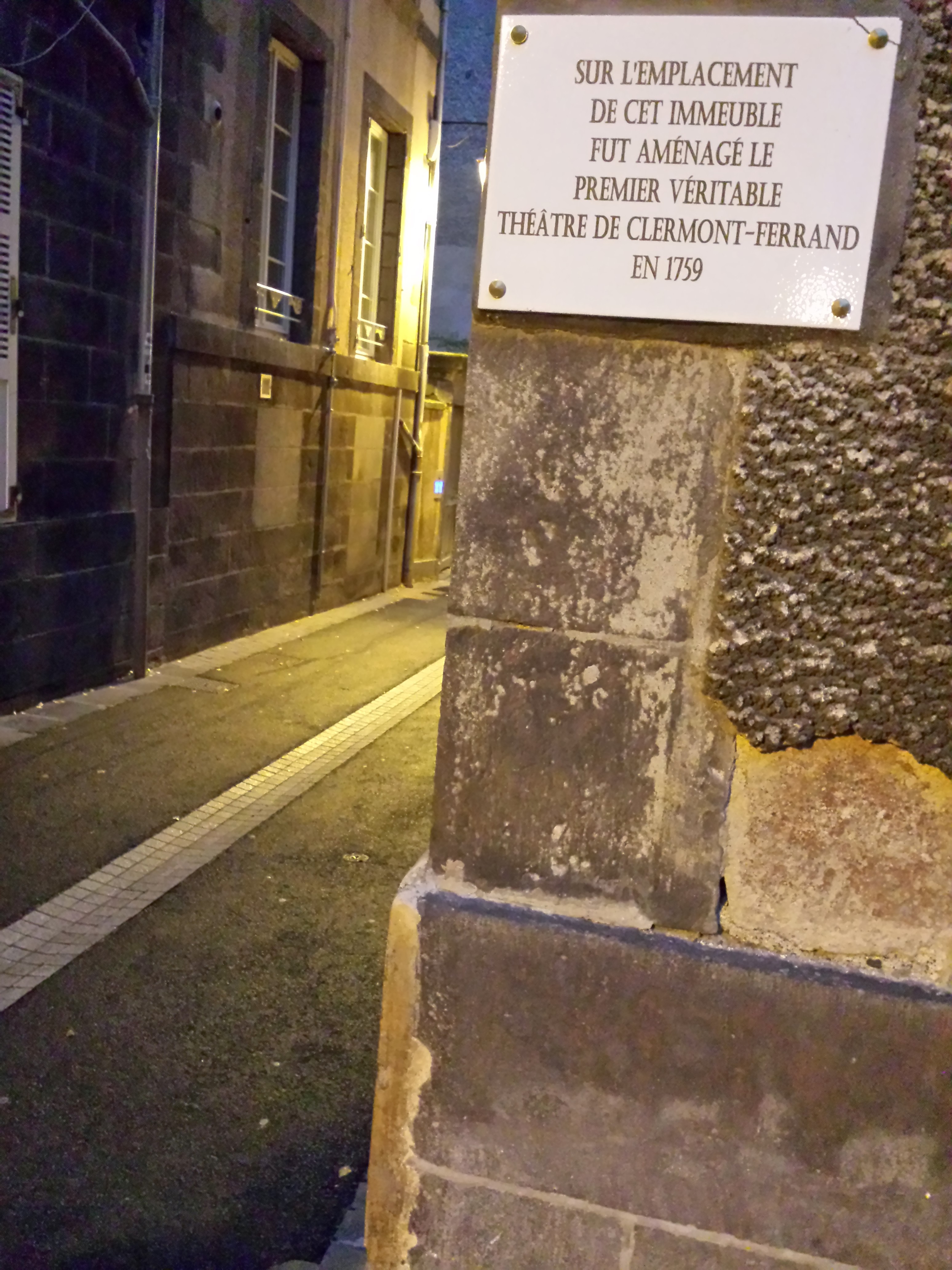 J’ai découvert ce microscopique théâtre il y a seulement quelques semaines, pour une conférence donnée par Dominique Touzé du Wakan Théâtre (à l’origine de l’excellente visite théâtralisée à l’opéra (opéra où je retourne pour une pièce samedi soir, d’ailleurs)), sur les origines du théâtre à Clermont-Ferrand. Je n’avais pas fait de billet car cette conférence était très dense et évidemment je n’ai pas pris de notes (ma mémoire de poisson rouge, tout ça…). Toutefois, pour ceux que ça intéresse, une petite vidéo 3D avait été réalisée pour une pièce intitulée « 1759, ça commence la Comédie ! » jouée il y a quelques années.