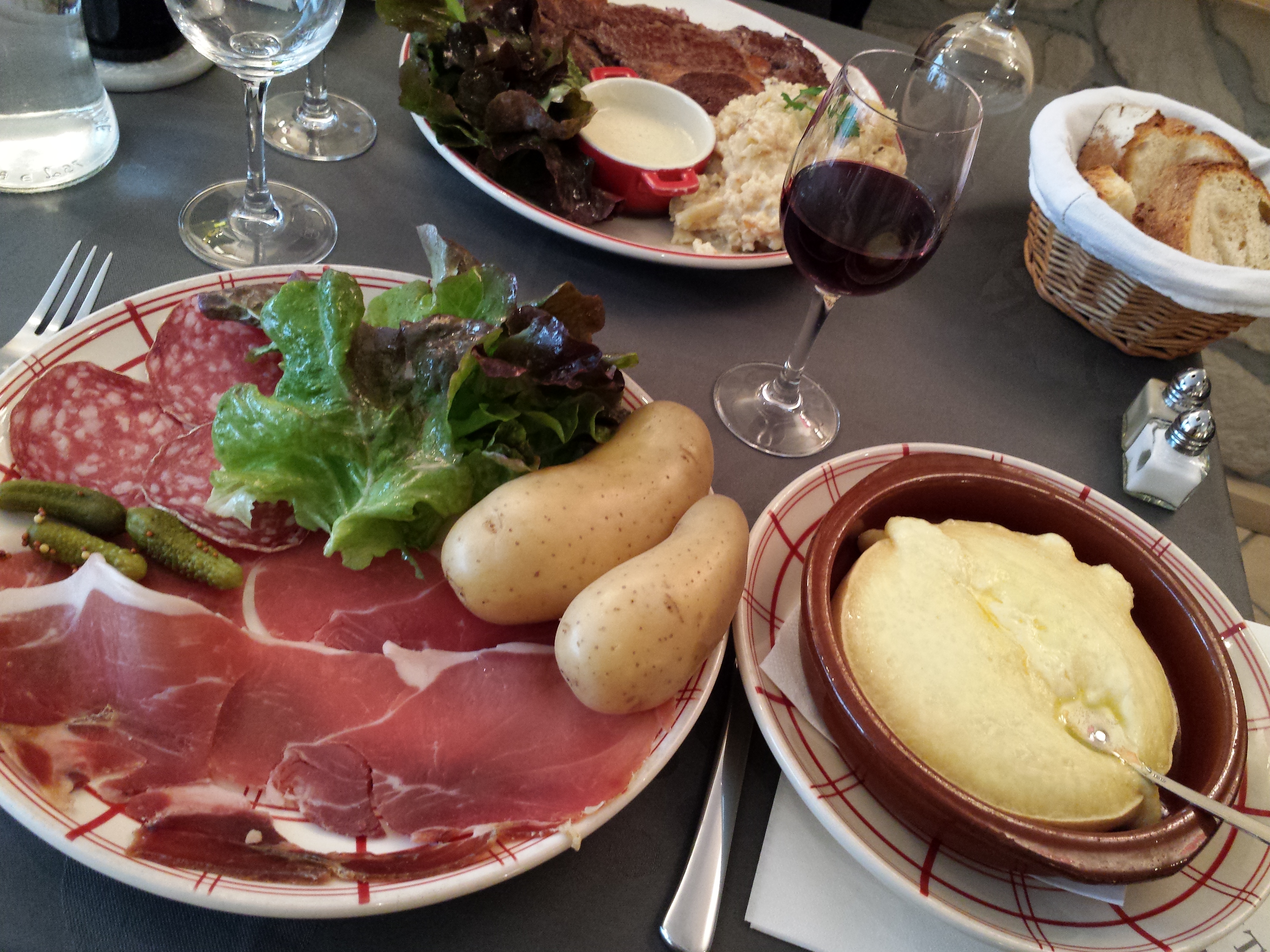 Après toutes ces émotions, direction Besse-et-Saint-Anastaise pour remplir nos estomacs éprouvés. Nous débarquons assez tard à L’Oustaou. Peu de clients, j’ai peur qu’on nous refoule vu l’heure mais pas du tout, accueil souriant. La cheminée crépite avec bonheur. Je commande une fondue de saint-nectaire. C’est un demi saint-nectaire (un petit, pas la même taille que celui qu’on trouve en magasin) fondu, servi avec des pommes de terre et de la charcuterie. Réconfortant au possible. Adresse à retenir, L’Oustaou à Besse. Accueil très sympa, déco jolie et chaleureuse et belles assiettes généreuses. Goûté la truffade, elle y est bonne.