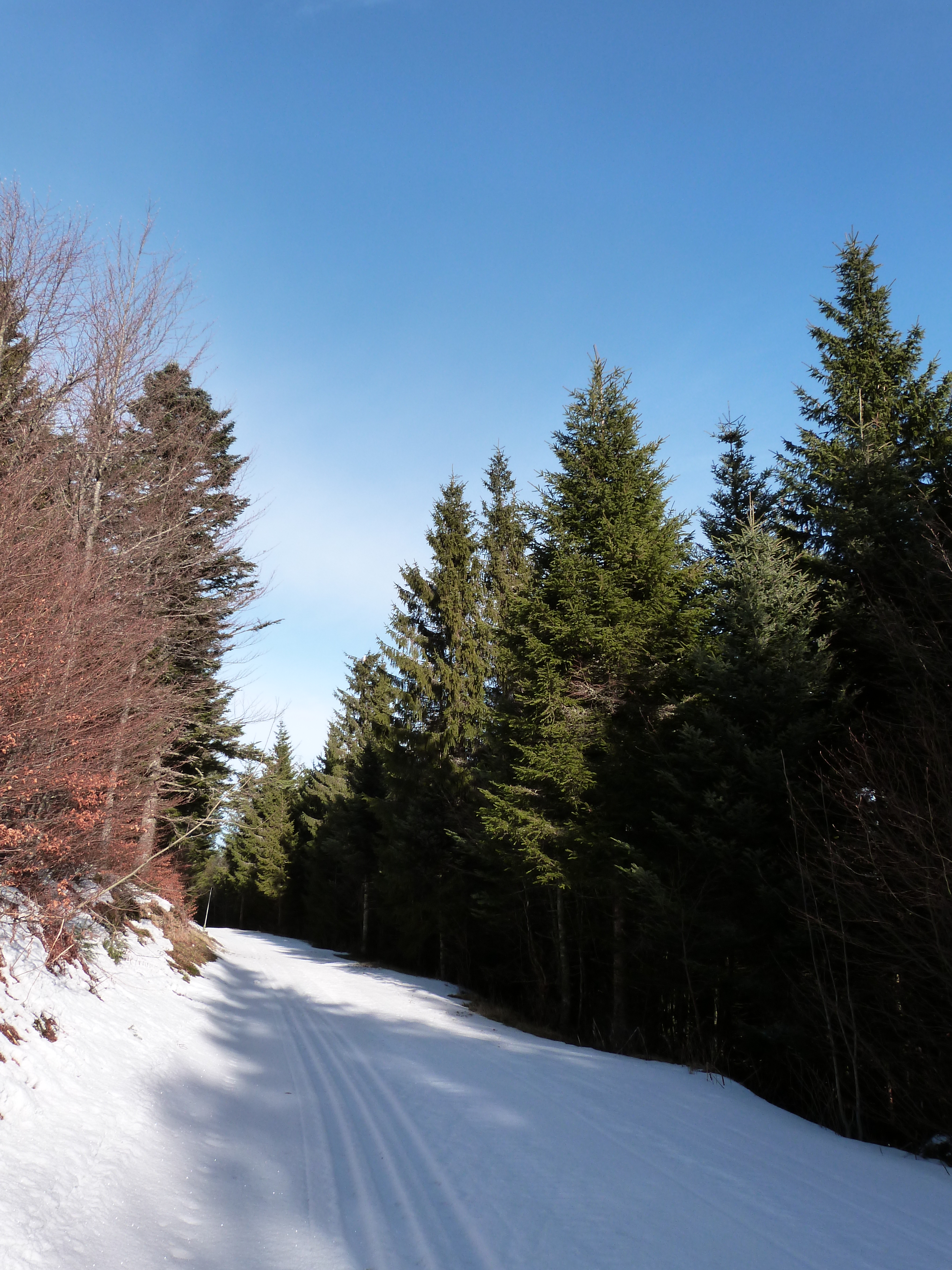 Putain j’ai eu peur. Pour de vrai. Raison de mon avertissement en début de billet. Ce sentier est, même sans neige, très dangereux en cas de chute. Mais là, gelé… je ne le conseille à personne. Raquettes ou pas d’ailleurs, elles n’auraient rien changé au problème.