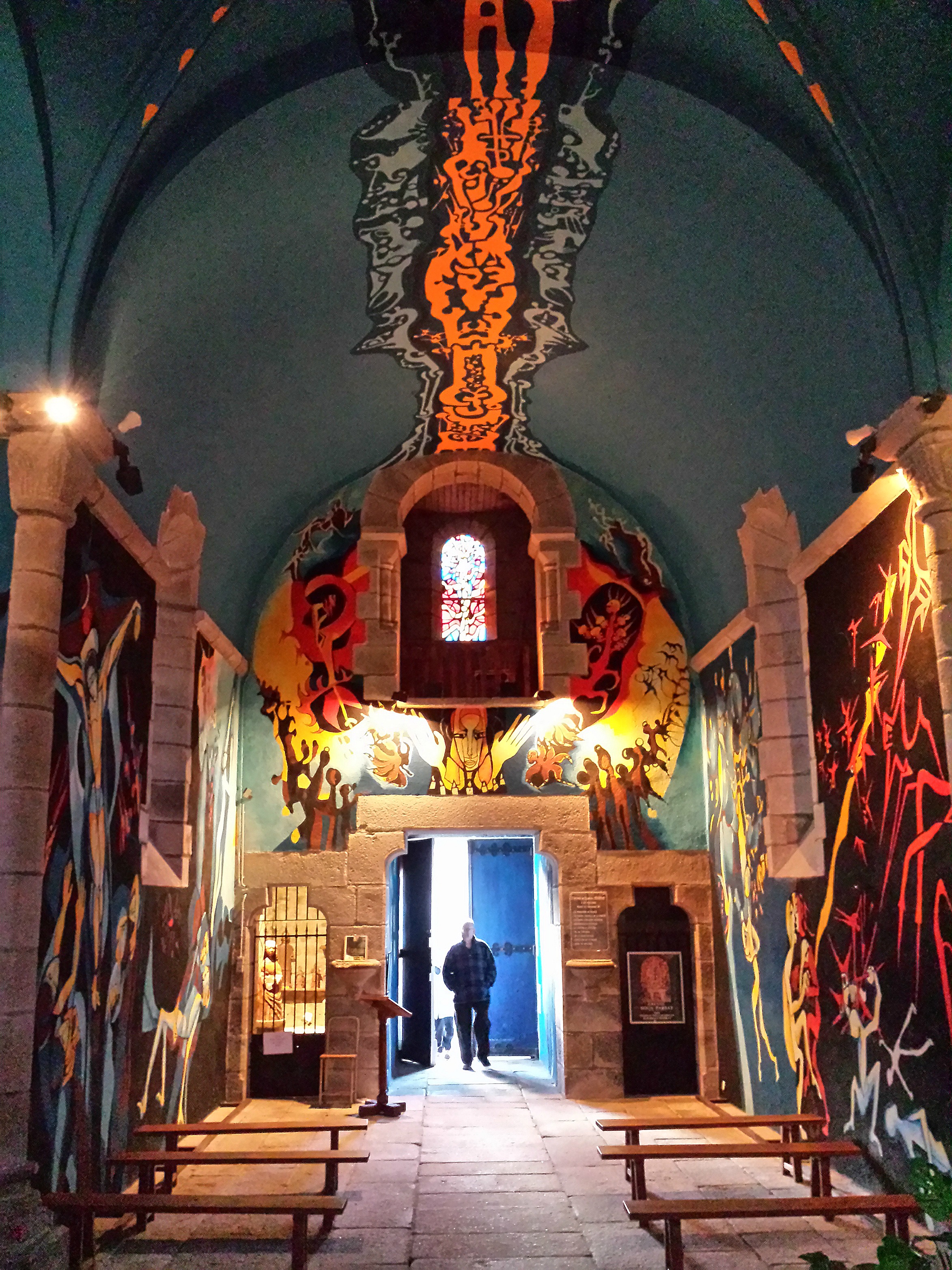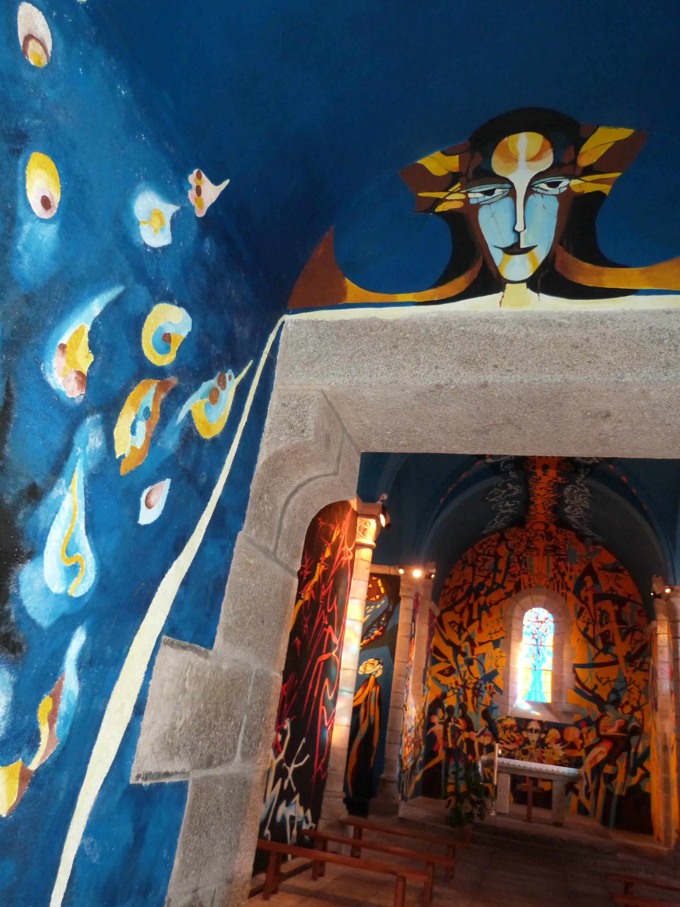 Sous-Parsat donc. N’allons pas par quatre chemins (c’est le cas de le dire), c’est un bled paumé. Extérieurement, la petite église du village est de facture tout à fait classique. Dès qu’on pousse la porte, les yeux s’arrondissent, la mâchoire tombe, et la nuque se torticolise. L’intérieur a été entièrement restauré par un artiste du cru, Gabriel Chabrat, qui a travaillé de 1986 à 1994 à la réalisation de fresques colorées. Un panneau explicatif à l’entrée explique les scènes religieuses représentées. Genèse, naissance de Jésus, apocalypse… tout y passe dans une explosion de couleurs vives et de formes tourmentées. Chabrat possède son atelier dans le village, il était fermé lors de notre visite.