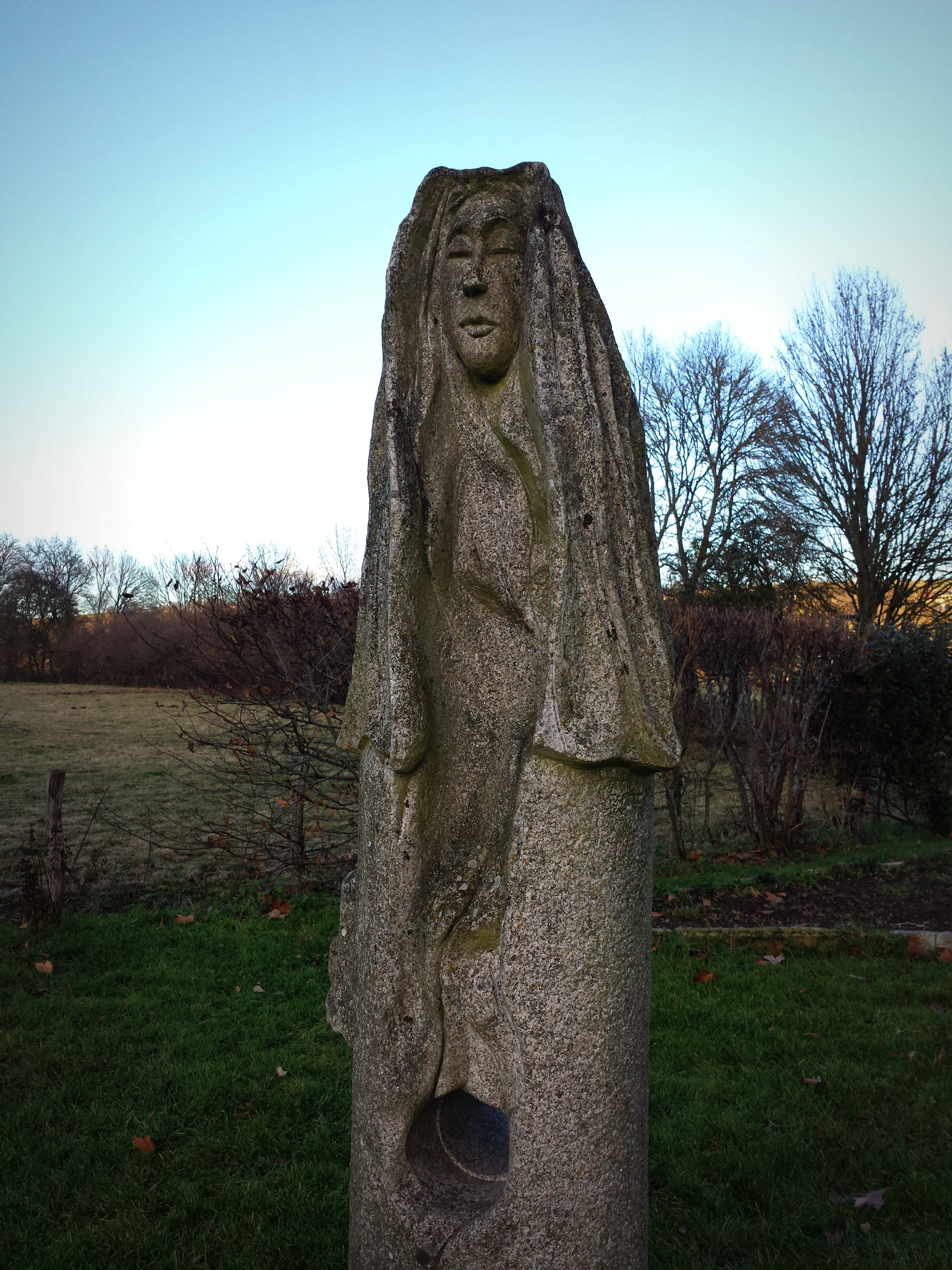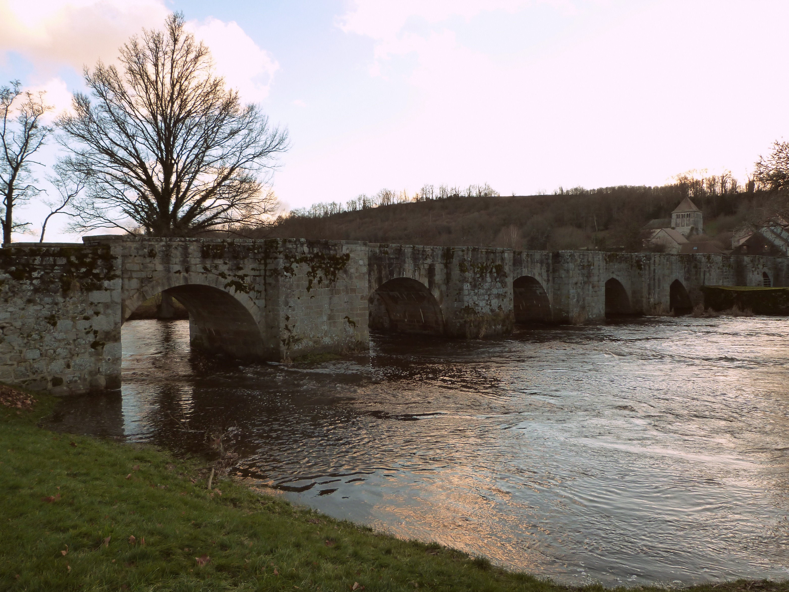 Après Sous-Parsat, direction Le Moutier d’Ahun à quelques kilomètres (après avoir failli dégommer un veau paissant paisiblement sur le bas côté de la route, et ce n’était pas une figure peinte celui-là!). Ce joli petit village est réputé pour son abbaye exceptionnelle ainsi que pour son pont romain qui enjambe gracieusement la Creuse. Je ne suis pas rentrée dans l’abbaye, c’était 3€ la visite libre et les photos y sont interdites. Merci mais non merci. Tant pis pour les célèbres boiseries sculptées. Par contre pas de péage pour le pont romain donc petite balade photographique de circonstance. Une statue est plantée l’air de rien à proximité des berges… n’hésitez pas si vous passez par là à la contourner et à regarder par le trou situé dans son socle. Il offre une vue ciblée sur l’abbaye et le pont romain. Cadrage de photo inratable, mais attention à la mise au point !