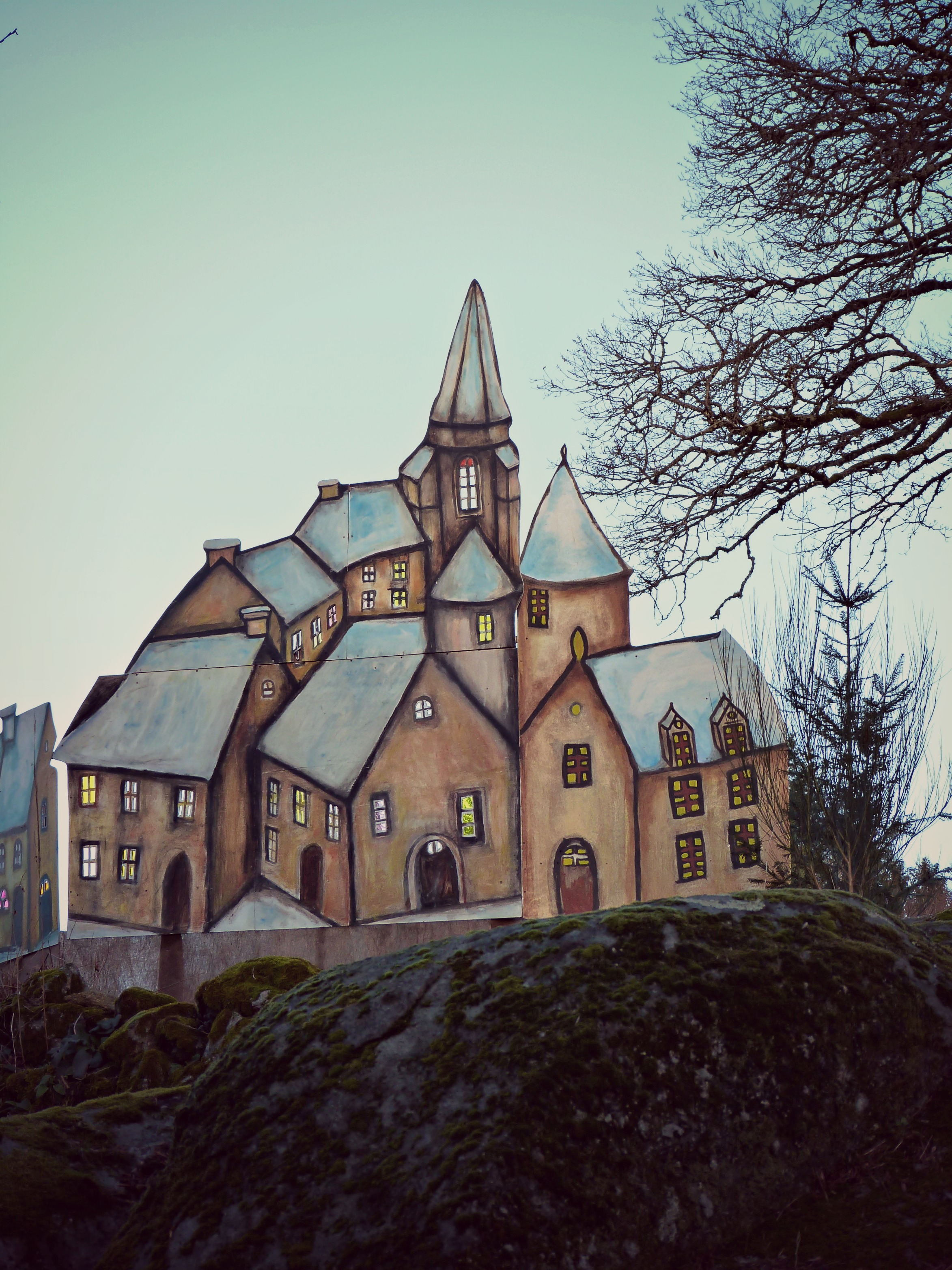 Le village de Sous-Parsat est également réputé depuis quelques années pour être le repaire du père Noël, qui s’y produit pendant environ une semaine avant Noël. De nombreuses figures ont été disposées le long de la route, dans les champs, devant l’église (crèche géante) et devant la maison du père Noël. Ces figures tout droit sorties de contes pour enfants ont été réalisées par des bénévoles d’une association chapeautés par l’artiste Gabriel Chabrat. Je ne les ai pas vues à la nuit tombée mais les éclairages doivent donner à tout ça des airs de village fantastique. Voilà qui est à refaire l’an prochain avec les petites nièces.