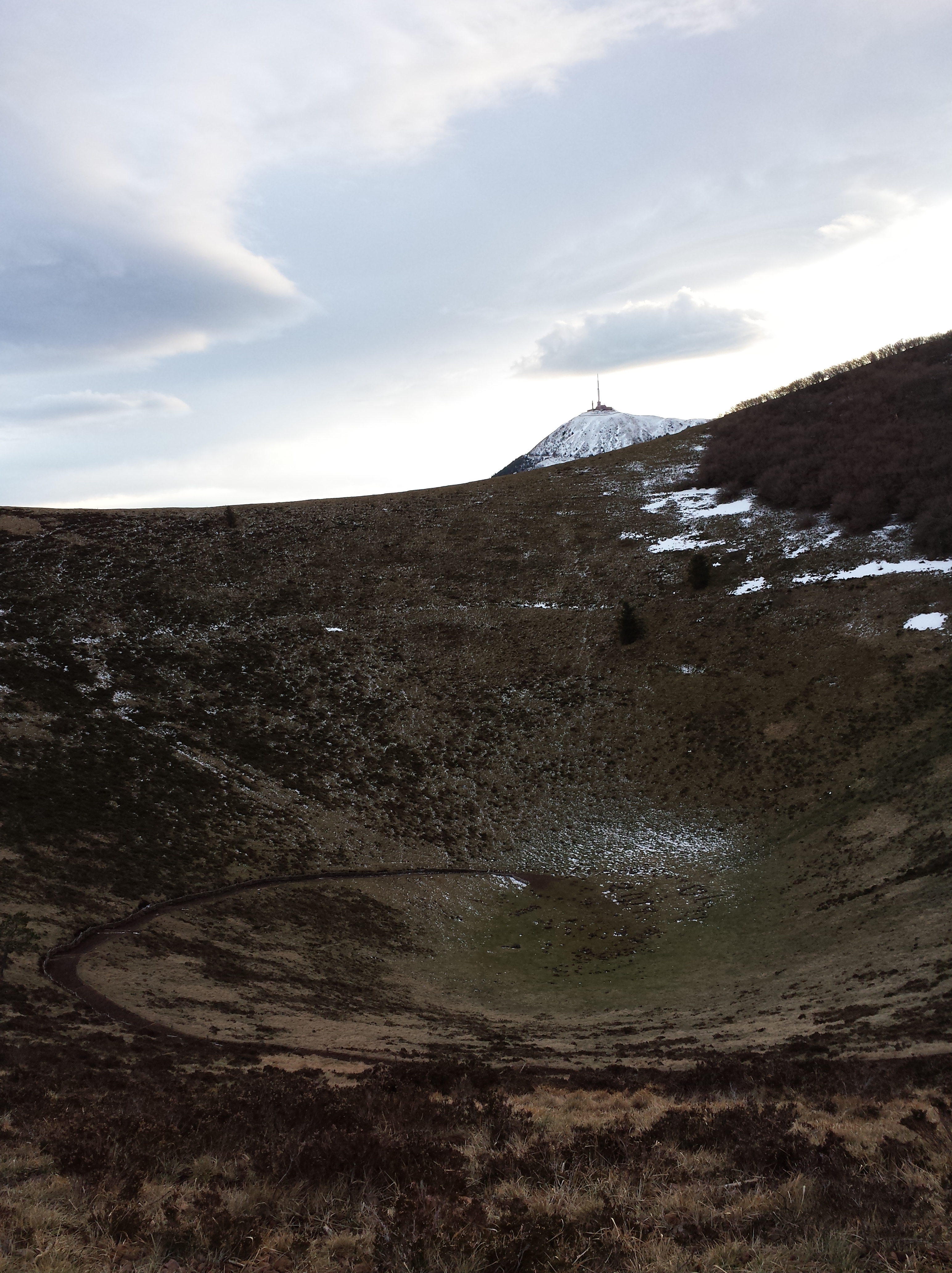 Début de la rando vers 15h45 environ, avec JD (on change pas une équipe qui gagne). Le soleil est déjà bas dans le ciel, il ne faut pas traîner. Pas de joli chemin des noisetiers, départ au plus près, le long de la route après le parking des Goules. La première partie du chemin est fastidieuse : c’est détrempé, boueux, et il reste de la neige gelée par endroits. En plus nous sommes à couvert, il n’y a rien à admirer. Lorsque nous émergeons enfin, le soleil semble vouloir faire une apparition, les flancs du Pariou à notre gauche sont radieux. Il est temps de sortir l’appareil photo et de hâter le pas, car il reste encore du chemin et notamment la volée de marches en bois qui mène jusqu’au cratère. Un papa tenant son jeune enfant par la main entreprend de lui compter les marches. Il nous laisse le dépasser. Plus nous évoluons vers le sommet, plus le vent devient fort et plus le paysage devient fascinant. Derrière nous, le puy de Dôme se dresse dans le soleil couchant, orné de quelques plaques de neige et coiffé d’un petit nuage semblant accroché à l’antenne. Les dernières marches de bois donnent le ton : un vent violent balaye le Pariou.