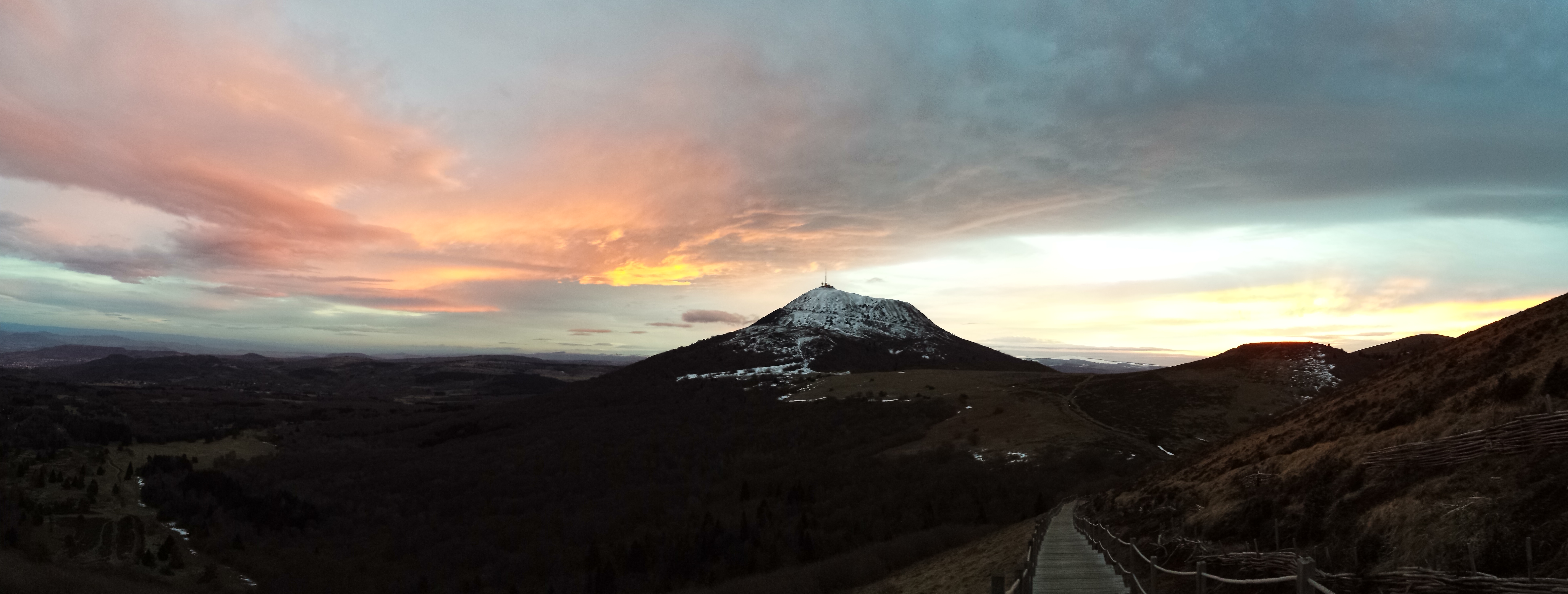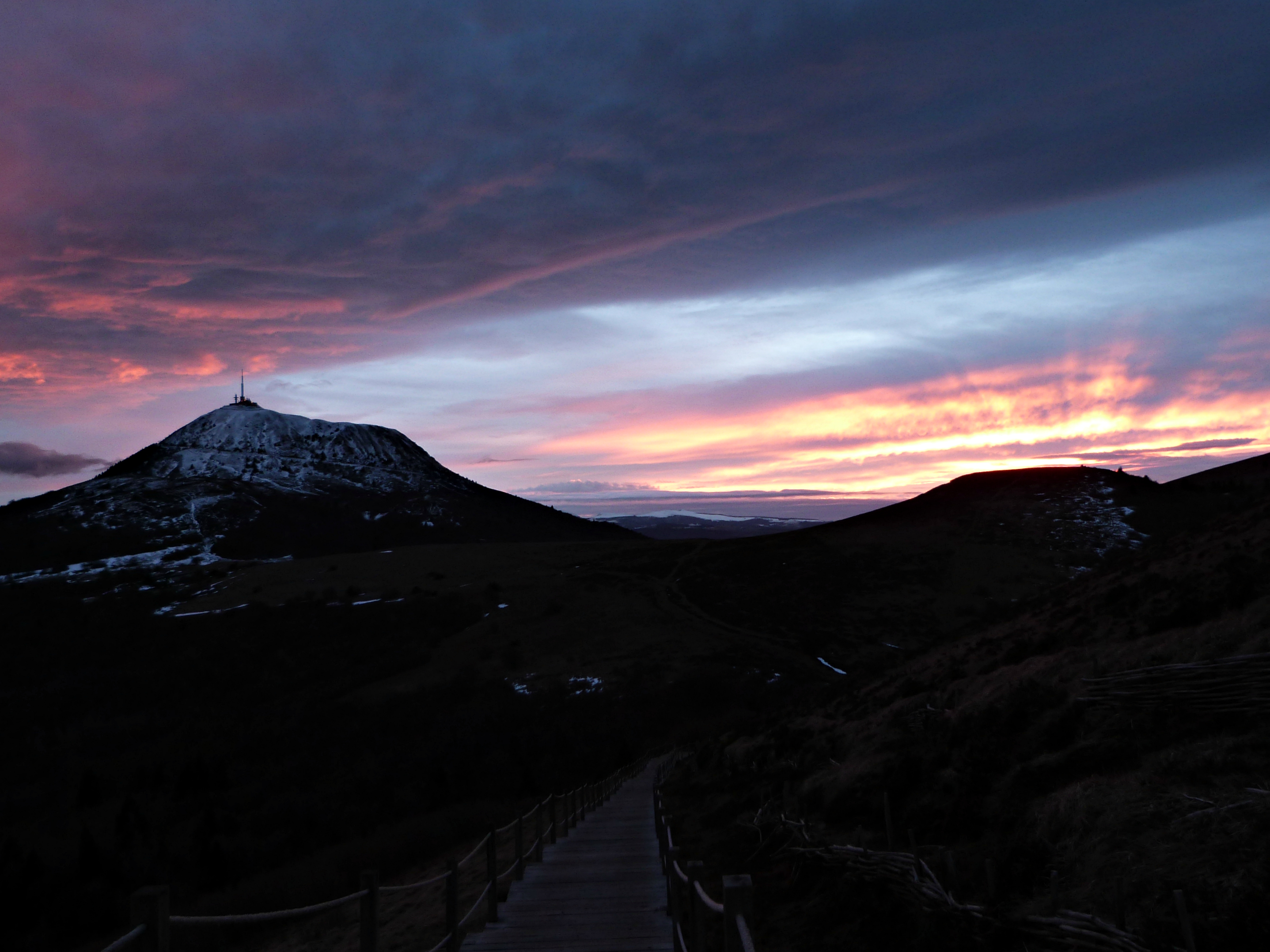 Le soir du 31 décembre, j’ai assisté à un des plus beaux spectacles qui soient : un coucher de soleil sur la chaîne des Puys. Bon alors évidemment, la condition sine qua non c’est qu’il fasse un temps correct. Et ce n’était pas gagné d’avance compte tenu des nuages qui s’agglutinaient sur Clermont depuis le début d’après-midi. Encore heureux, il ne pleuvait pas, et ne neigeait pas non plus.