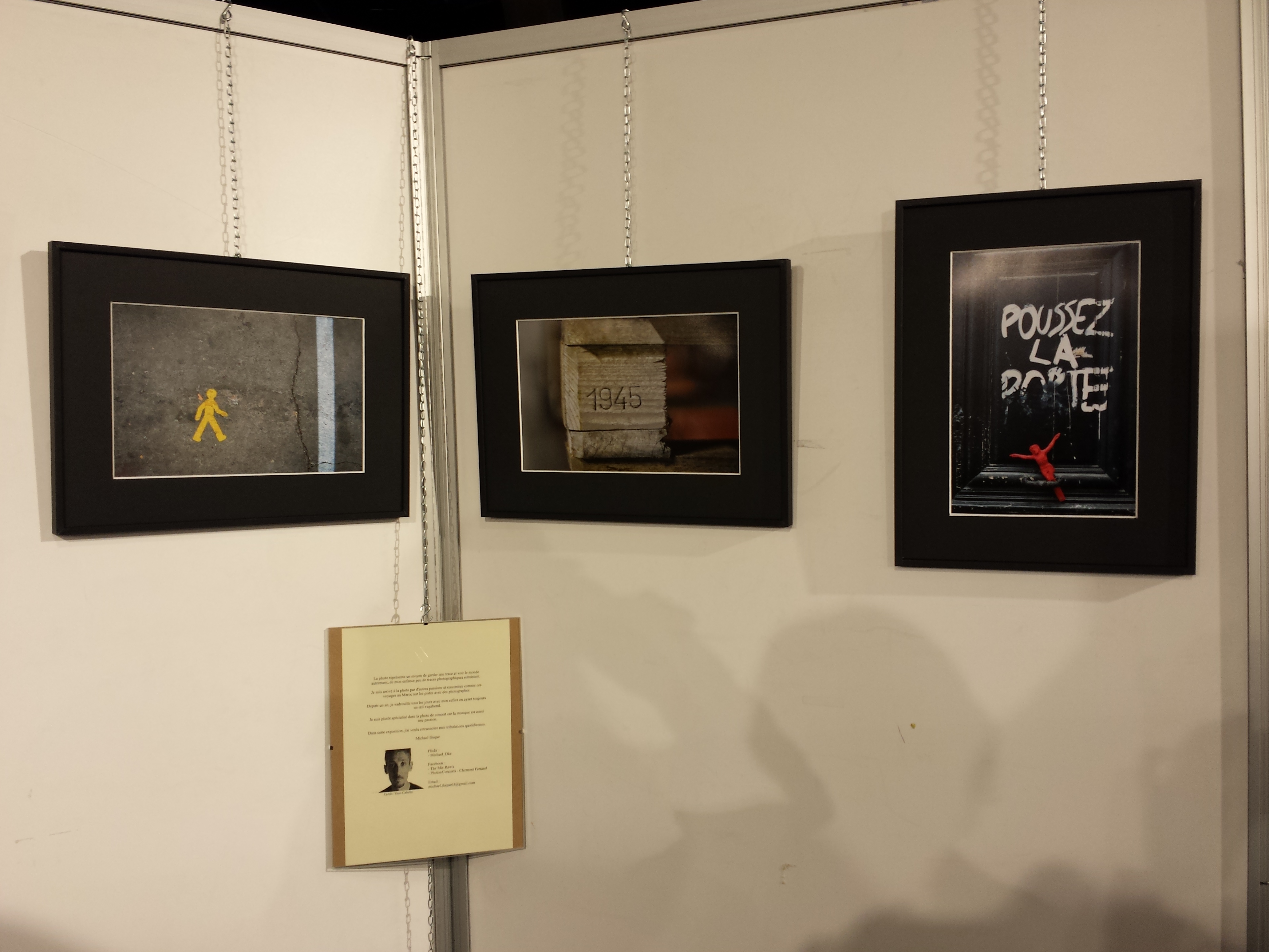Et jeudi était inauguré l’exposition « Histoires de photos ». Chaque année, l’ORACLE (Office régional d’action culturelle de liaisons et d’échanges) invite des photographes amateurs à exposer quelques unes de leurs créations à la Maison de la Culture de Clermont-Ferrand. J’avoue bien humblement que je n’en avais jamais entendu parler jusqu’à cette année, et c’est grâce à Michael Duque que je m’y suis intéressée. Ce dernier faisait partie de la petite troupe qui avait participé à la sortie photo nocturne dans Clermont-Ferrand. Depuis j’ai été amenée à le croiser ici ou là, sachant qu’on le trouve souvent là où il y a un concert. Il apprécie particulièrement cette thématique photo mais pour ORACLE il a opté pour toute autre chose. Des photos de rue, graphiques et insolites, des détails qui passent inaperçus aux yeux du plus grand nombre mais pas de celui qui recherche des messages cachés ou de la poésie à tous les coins de rue. Au final une sélection de six photos qui donnent à réfléchir, à sourire aussi, et qui nous encouragent à considérer nos espaces urbains avec un œil neuf et bienveillant.