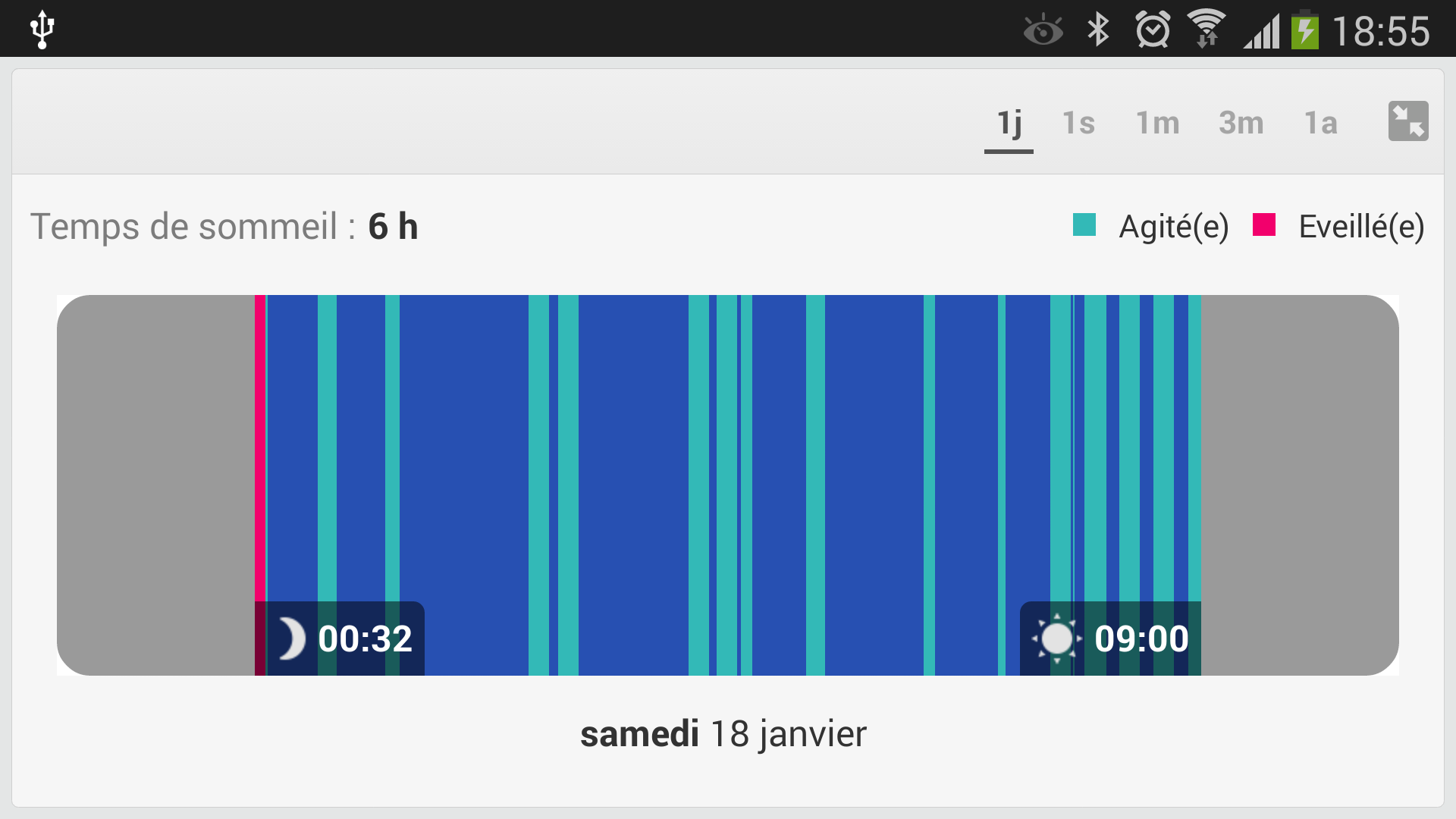 Le Flex vous surveille même quand vous dormez. Comme je l’ai expliqué plus haut, j’ai paramétré la sensibilité sur haute afin d’avoir plus de précisions sur mes gigotages nocturnes.