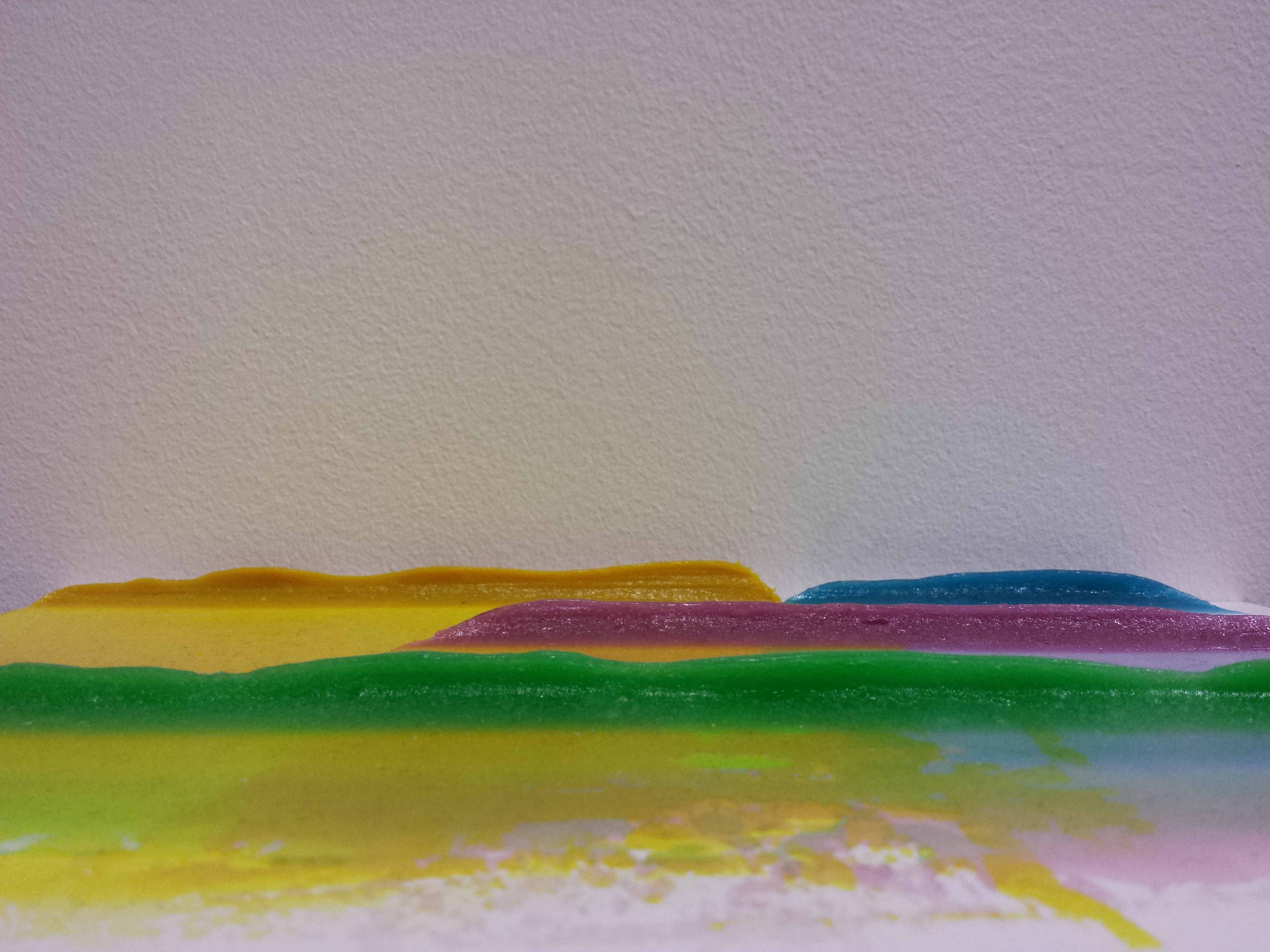 Au cœur du travail d’Eric Provenchère, la couleur. Mais la couleur en tant que matière. Entre crème pâtissière, glaçage et bonbon gélifié, la couleur s’étale généreusement. On a envie de toucher, de goûter, presque. Les couches se superposent, se complètent et semblent diffuser une douce lumière. Les œuvres ne sont pas rétroéclairées, elles absorbent la lumière ambiante, blanche et froide, et nous la restituent passée au filtre chaleureux de leurs pigments éclatants. Les œuvres que j’ai trouvées les plus fascinantes sont ces vagues de pâte colorée étalées sur des sortes d’étagères. Leur aura lumineuse, leur capacité à garder leurs couleurs éclatantes dans la pénombre ont quelque chose d’un petit peu magique.