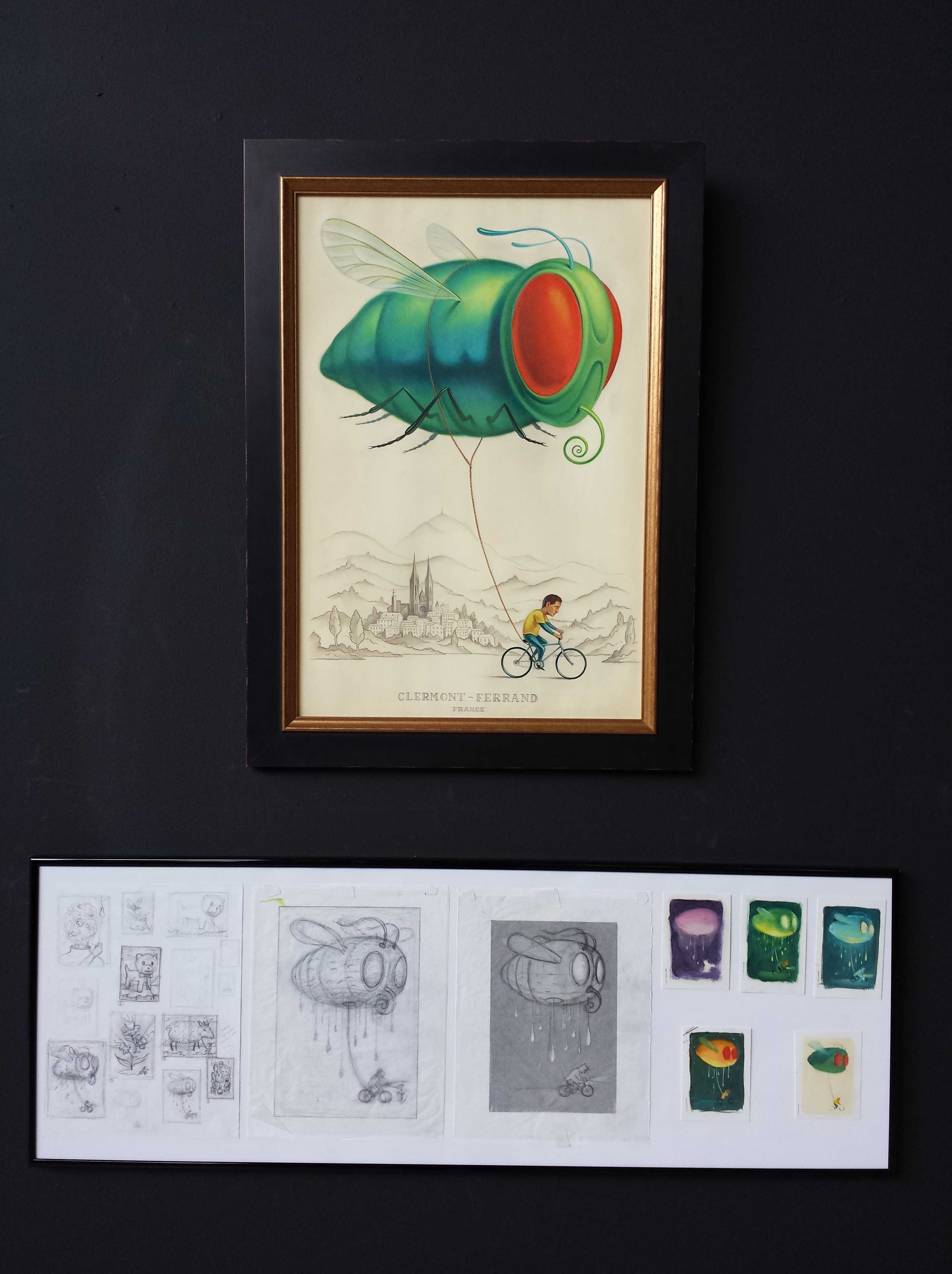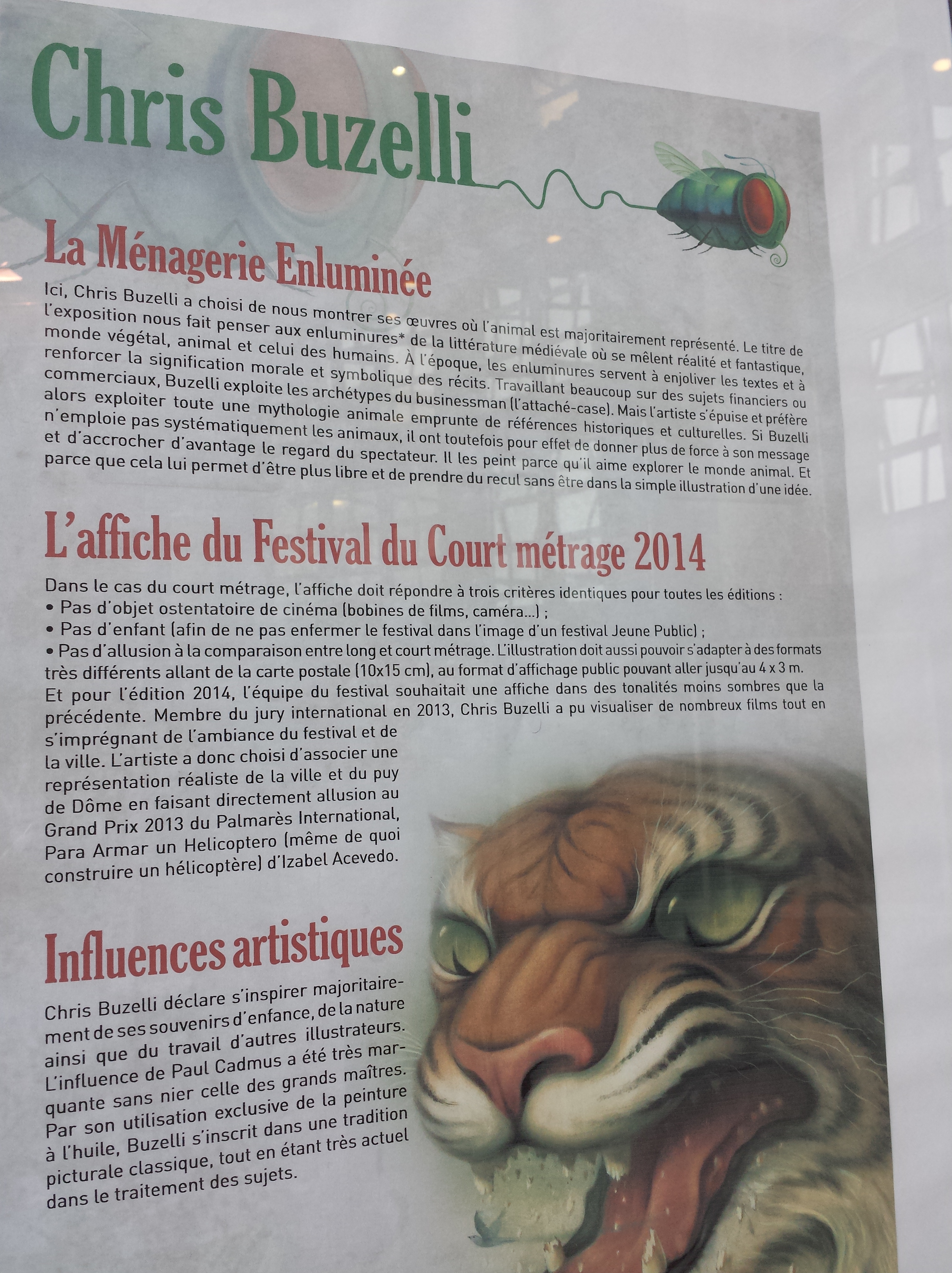 [To all my English speaking visitors: Chris made what is, in my opinion, the best poster we ever had for this festival. The international short-film festival is a very popular festival (more than 160.000 visitors this year) and we, people living in Clermont-Ferrand, are very proud of this poster. This is the first time the town is pictured, with its black cathedral (made of lava stone) and the Puy de Dôme (a dormant volcano). These are two strong symbols of our city and obviously Chris understood that. The exhibition in the Conseil général du Puy-de-Dôme (the department where Clermont-Ferrand is located) is wonderful and I had the chance to meet Mr and Mrs Buzelli there. I didn’t dare asking to many questions because I guess they had a tiring week there but this was a very nice encounter. Thank you Chris !]