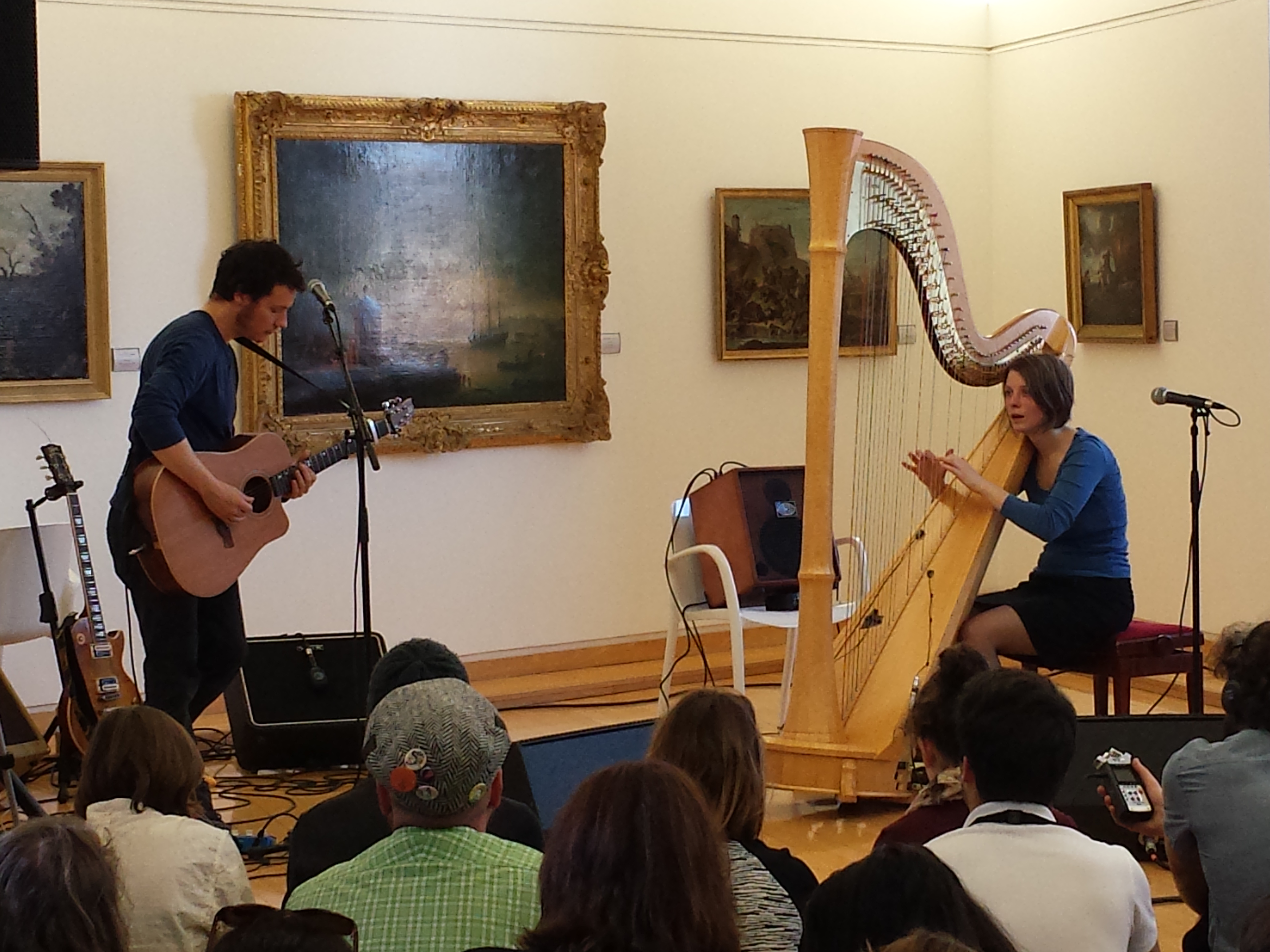 Venus de Lyon, les deux membres du groupe créent l’étonnement. Une harpe, et des guitares électriques… pour un son unique et enchanteur. Des voix à l’unisson, une ambiance qui passe d’une légèreté rêveuse à une étrangeté inquiétante. Une belle découverte, qui plus est dans le contexte si particulier d’une salle de musée et de ses tableaux d’un autre âge aux dorures chargées.