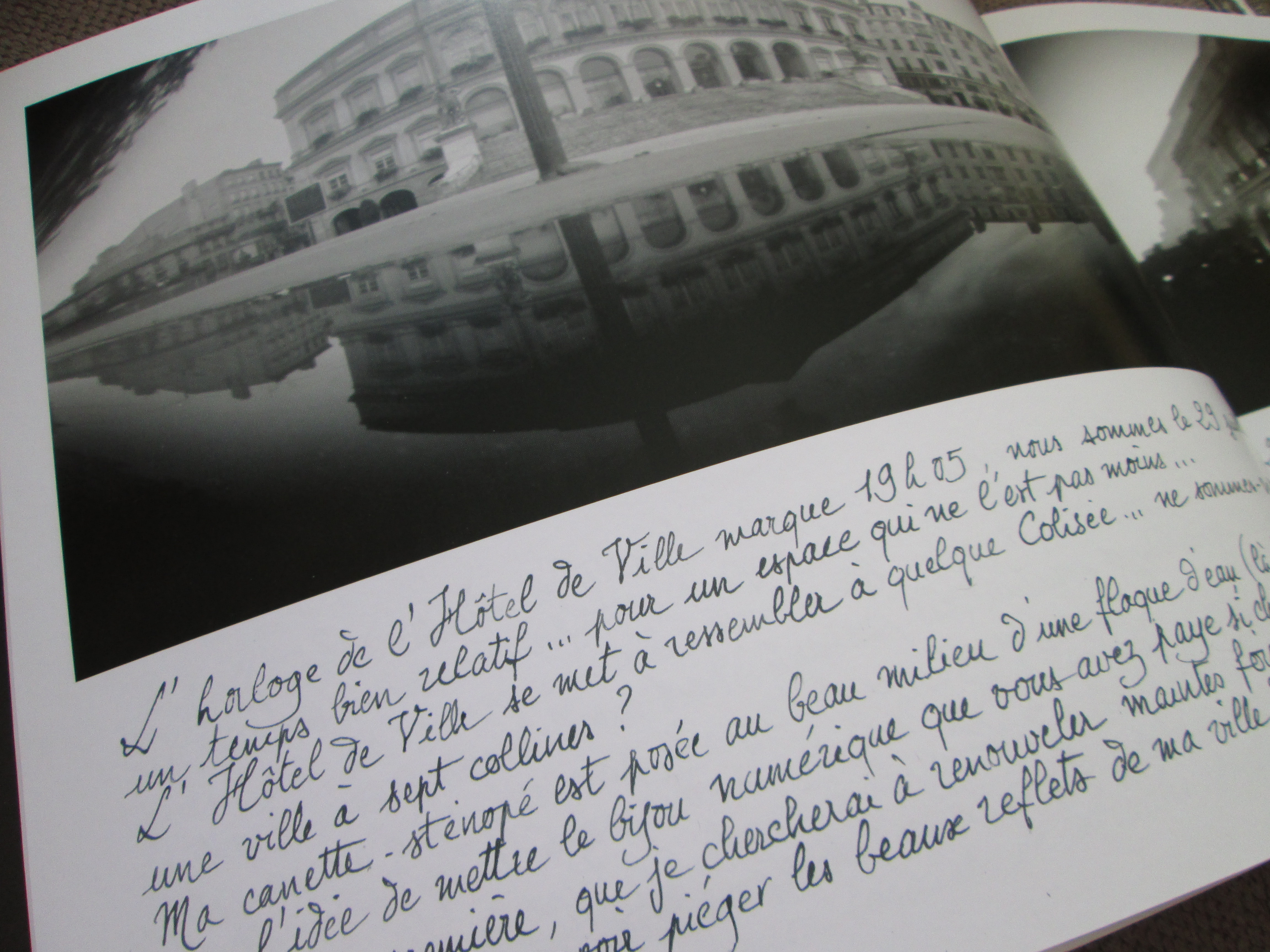 Je ne connais pas Saint-Etienne et m’est avis que j’aurais des surprises si j’y allais là tout de suite, après avoir vu ce livre… Les photos prises au sténopé déforment les scènes, les poses ultra longues effacent toutes traces de vie humaine, les flaques deviennent des étendues maritimes, les bâtiments austères des Colisées majestueux… bref, tout ça avec une canette de bière ! Notez que la technique du sténopé marche avec n’importe quel volume sombre doté d’un petit trou (boîte rectangulaire et même remorque de camion). Je ne sais pas si ce livre m’a donné envie d’aller à Saint-Etienne (soyons honnêtes), mais j’ai pris un plaisir extraordinaire à suivre les « aventures » photographiques de Jacques Prud’homme, ses explications techniques, ses avis parfois bien tranchés sur l’architecture de la ville et aussi son humour, particulièrement savoureux ! Les pleins et les déliés de la plume y sont aussi pour beaucoup, l’association des photos en noir et blanc et de cette écriture élégante donnent à cet ouvrage un cachet certain.