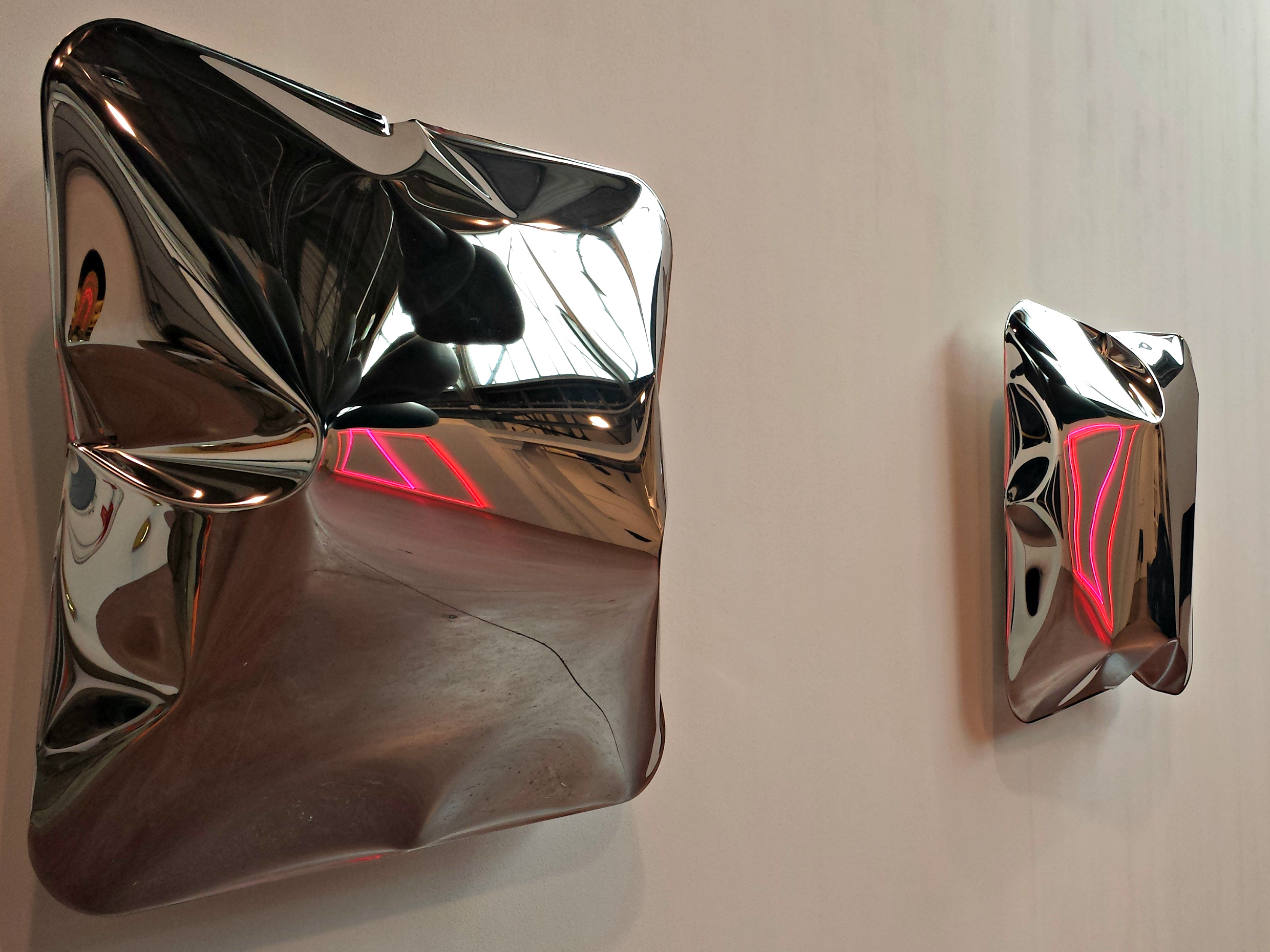 Lori Hersberger propose cinq œuvres réparties dans tout l’espace, et celles-ci se répondent. De la tôle chromée, cabossée, qui nous renvoie toujours une image différente de nous-mêmes, et qui réfléchit les néons roses en face.
