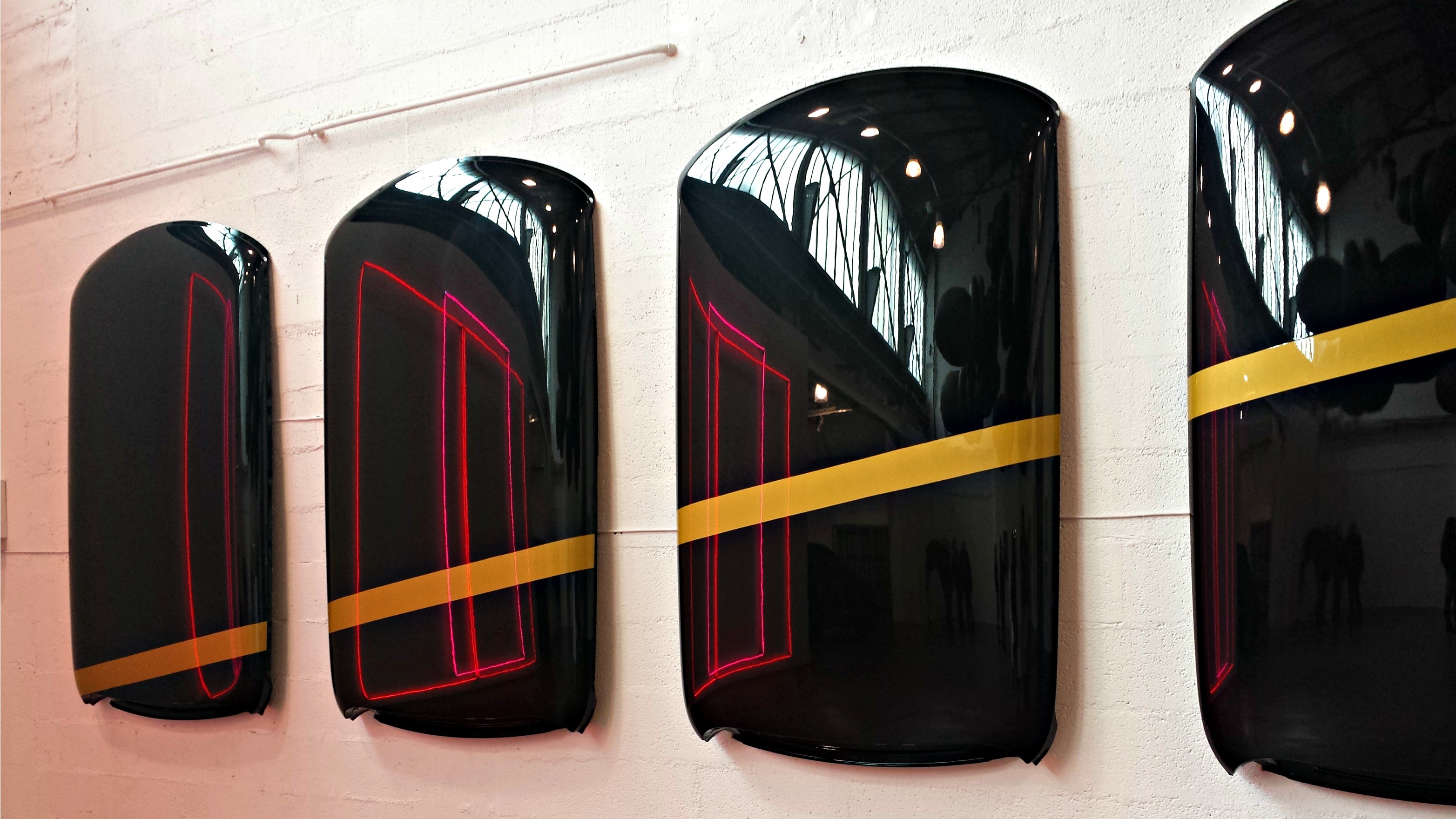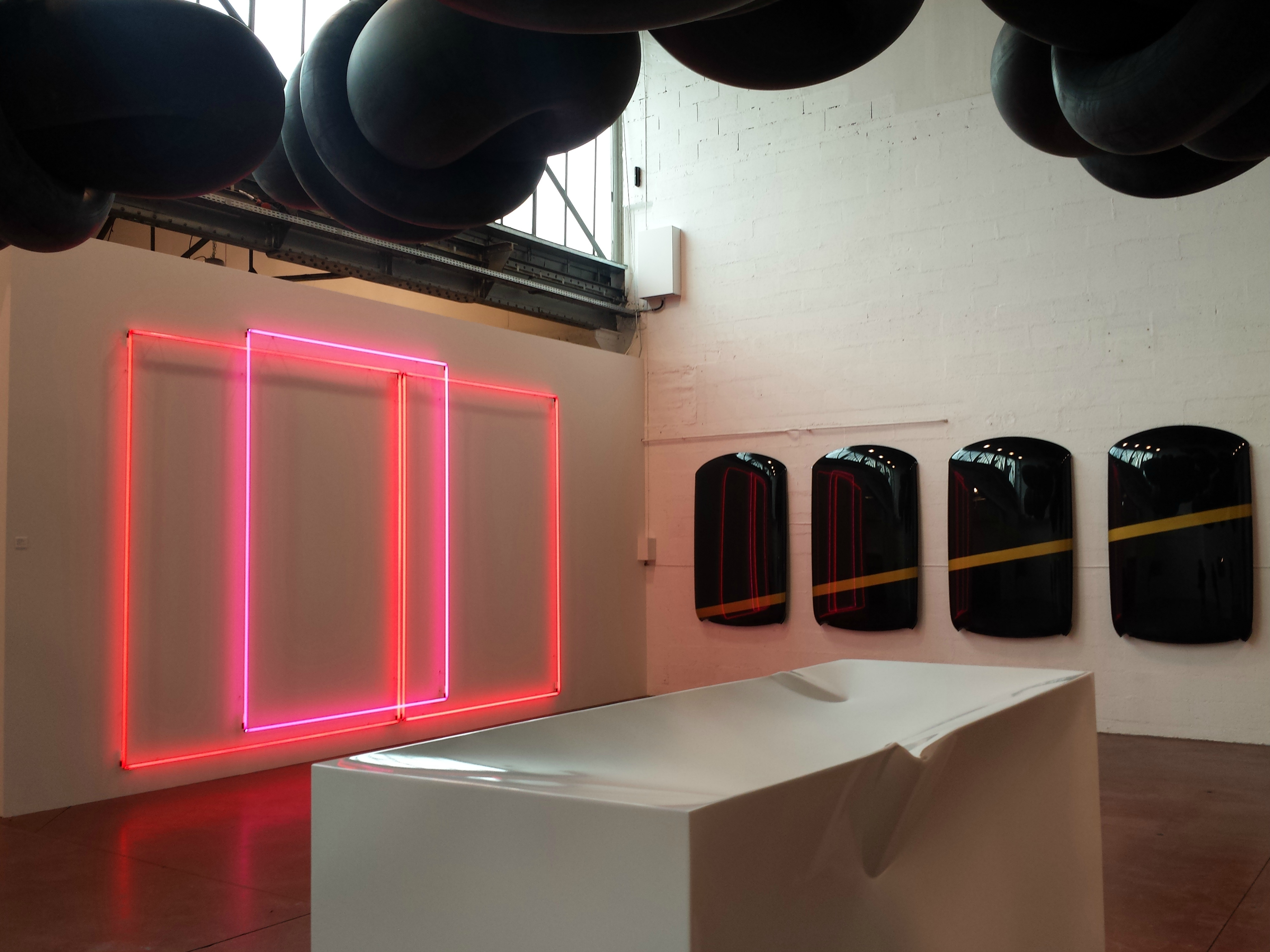 A côté des néons de Hersberger, Elena Montesinos a disposé six capots de Mini Cooper. Des vrais, tout chauds sortis de l’usine et peints d’une bande d’or par des peintres automobile. Apparemment au départ ils devaient être mats, mais finalement, au vu des jolis néons roses d’à côté, elle les a fait brillants et ça l’était, brillant. Les néons se réfléchissent magnifiquement dedans comme les autres œuvres de Hersberger. A la fin de l’expo, les capots retourneront dans leur concession de Genève où ils seront vendus aux enchères. Les acquéreurs pourront les mettre sur leur voiture ou les accrocher au mur de leur salon, au choix.