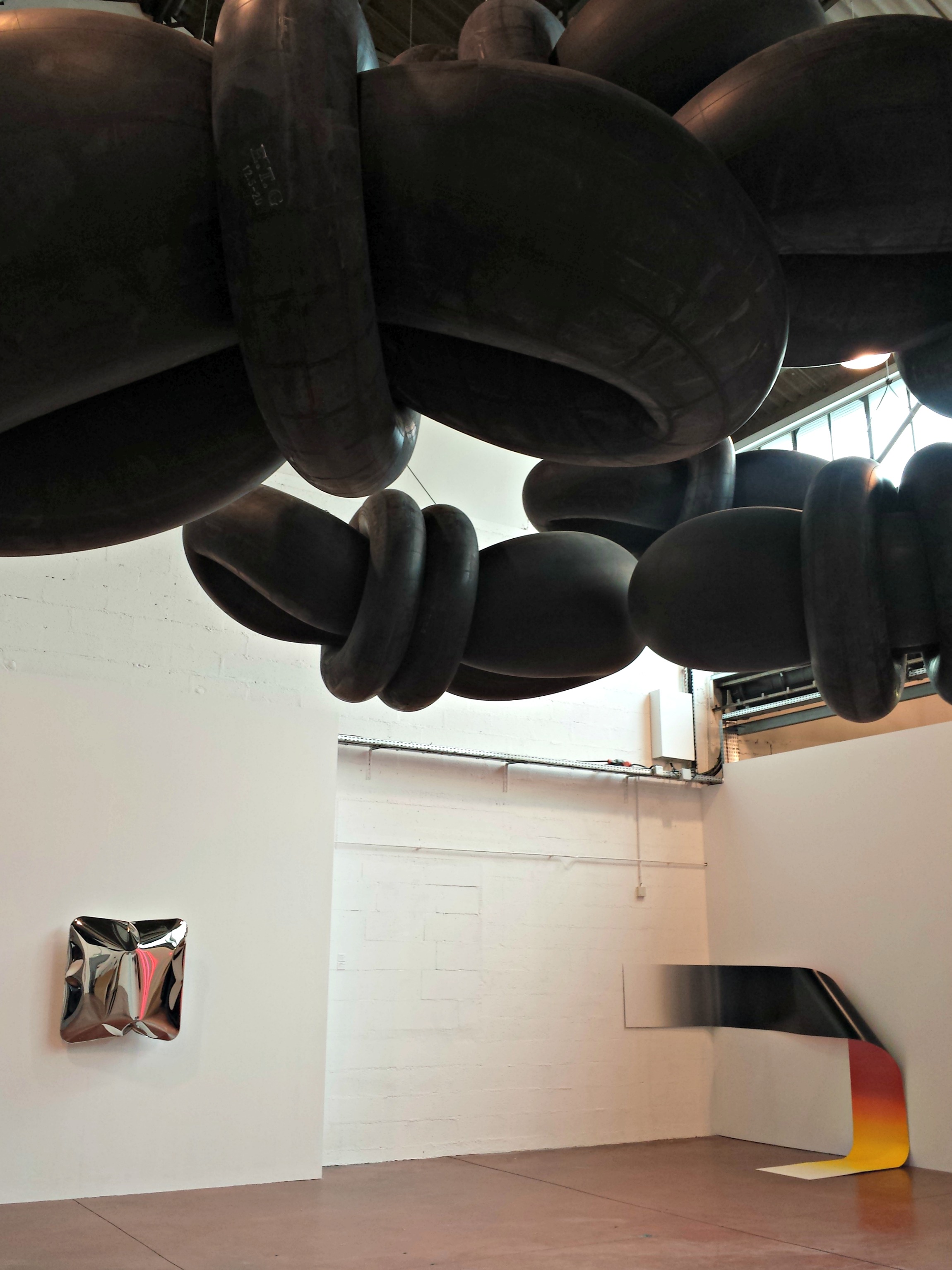 Au plafond, Michael Sailstorfer a suspendu d’énormes chambres à air, pour réaliser un « Clouds ». Une odeur de caoutchouc qu’on retrouve démultipliée dans la seconde salle, avec son œuvre « Zeit ist keine Autobahn », installation d’un pneu « roulant » contre le mur et déposant de la poussière de gomme à terre. Un jour ou l’autre, il faudra changer le pneu.