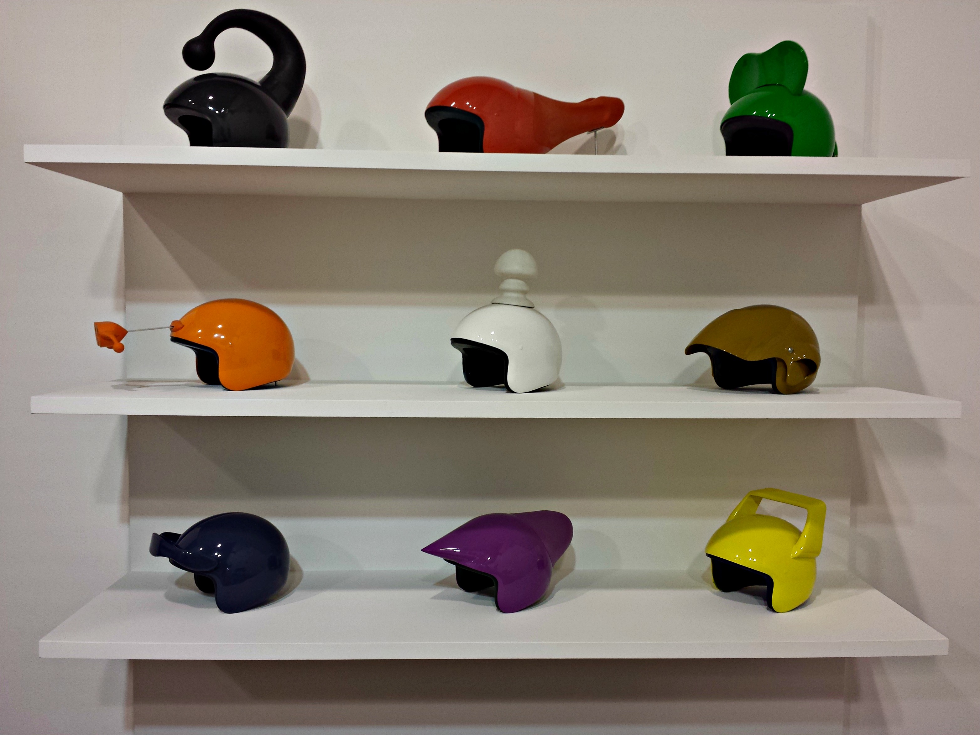 Cyril Verrier propose une œuvre plutôt marrante qui détonne un peu avec le reste des œuvres de cette salle. De vrais casques customisés de manière humoristique. Ils portent chacun un nom (non mentionnés dans la brochure ni dans la salle, mais la gardienne du temple nous les a énoncés avec délectation pendant la visite).