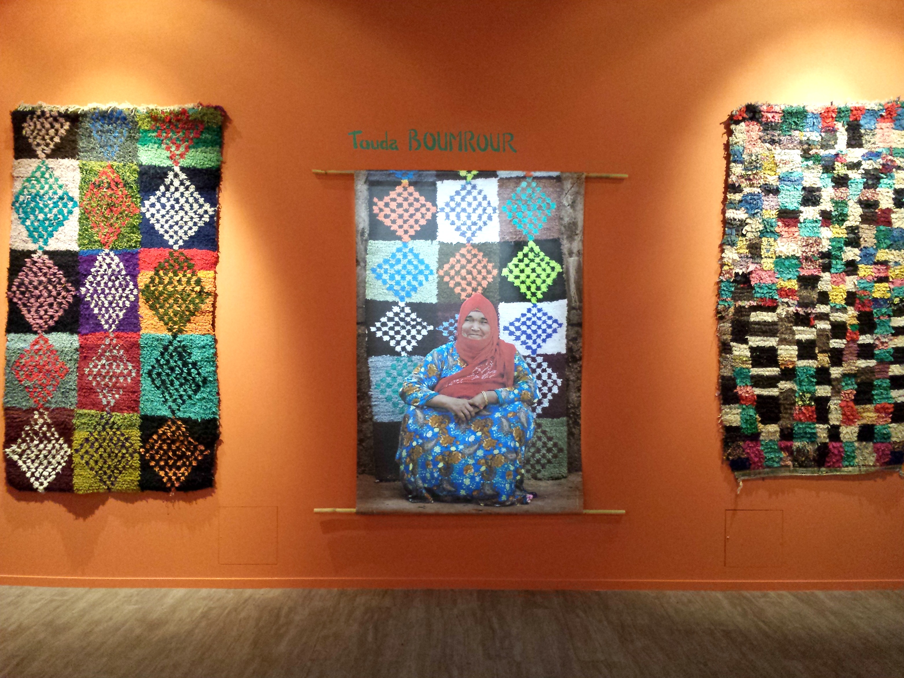 On en prend vraiment plein les yeux, grâce (comme toujours) à une scénographie soignée qui met en valeur les couleurs éclatantes de ces tapis. Deux « tentes » berbères ont été mises en scène : coussins, tapis, petites tables et livres photos sont à disposition des visiteurs. Ces derniers sont invités à se déchausser avant d’y pénétrer.  J’ai adoré ces grands portraits, profonds et touchants, de Serge Anton, au cœur des créations. A taille humaine, ils nous rapprochent un peu de ces femmes qui ont pour la première fois prêté leurs créations pour qu’elles soient exposées. Les tisserandes de la tribu Aït Khebbach vendent rarement leurs tapis, ce sont de véritables éléments de décor de leur vie quotidienne.