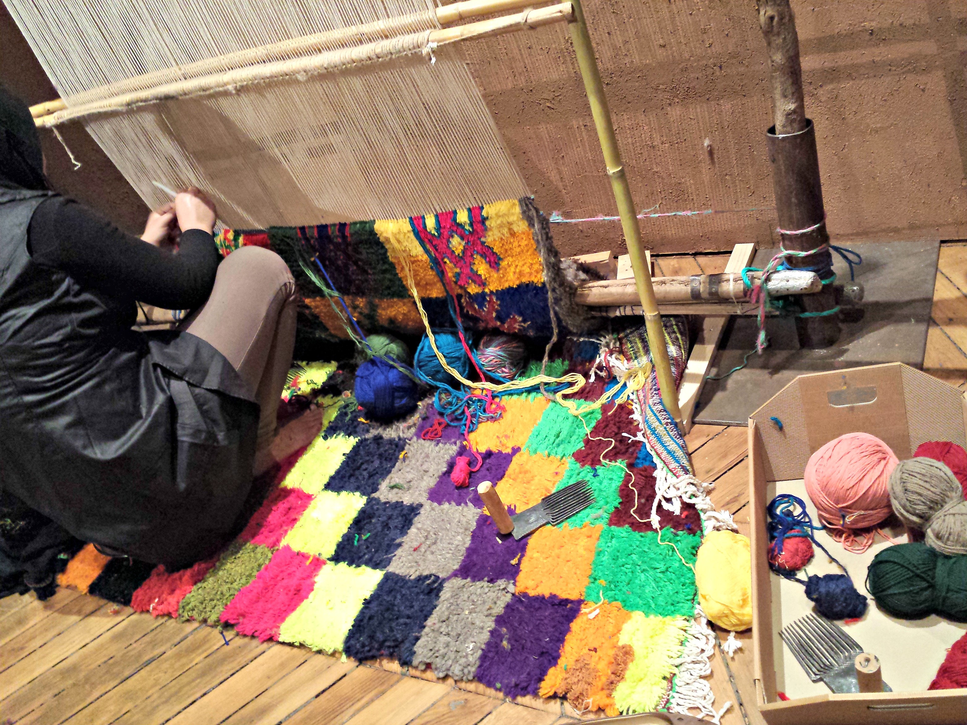 Les tisserandes de la tribu Aït Khebbach, depuis les années 1980, tissent des tapis et autres couvertures avec des pulls détricotés, des poils de chèvre, des laines multicolores trouvées au souk…  Des carrés de toutes les couleurs, ornés de losanges, de motifs résille… voilà le point commun à toutes ces femmes. Pourtant, chacune possède son style bien à elle et fait preuve de créativité et de technique dans chaque pièce, qui est évidemment unique.
